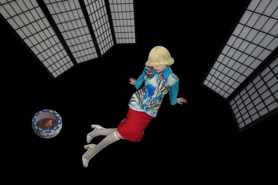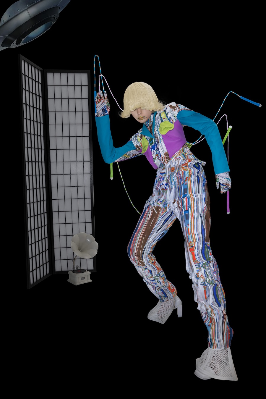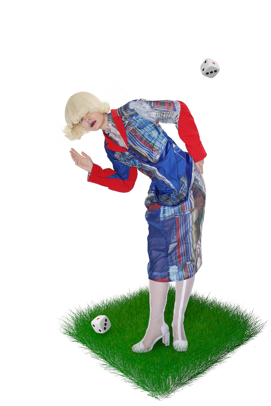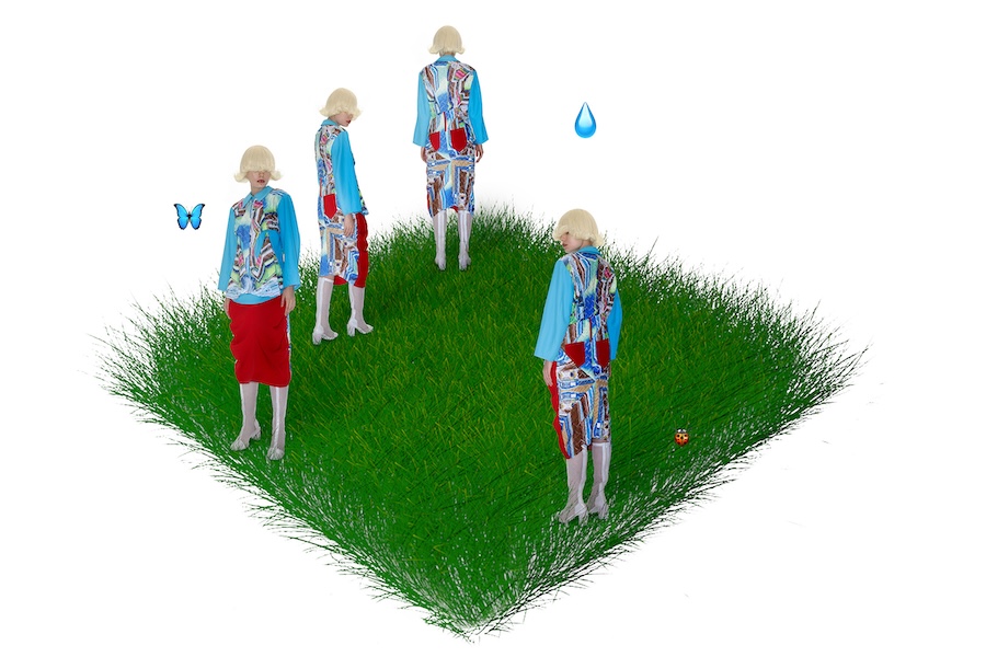 A KALTBLUT exclusive. Spatial Anchor Point explores how identity shifts across digital coordinates. Within a single day, the self relocates between roles- student, player, consumer-touching screens as if teleporting between layered spaces. Inspired by game-world logics such as pixel grids and Animal Crossing’s mosaic canvases, the garments translate this movement into glitch surfaces, pleated distortions, and imperfect prints. Staged between a dark theatrical void and a luminous field of icons and grass, the images suggest a body that flickers-no longer fixed, but constantly re-anchored in overlapping realities.