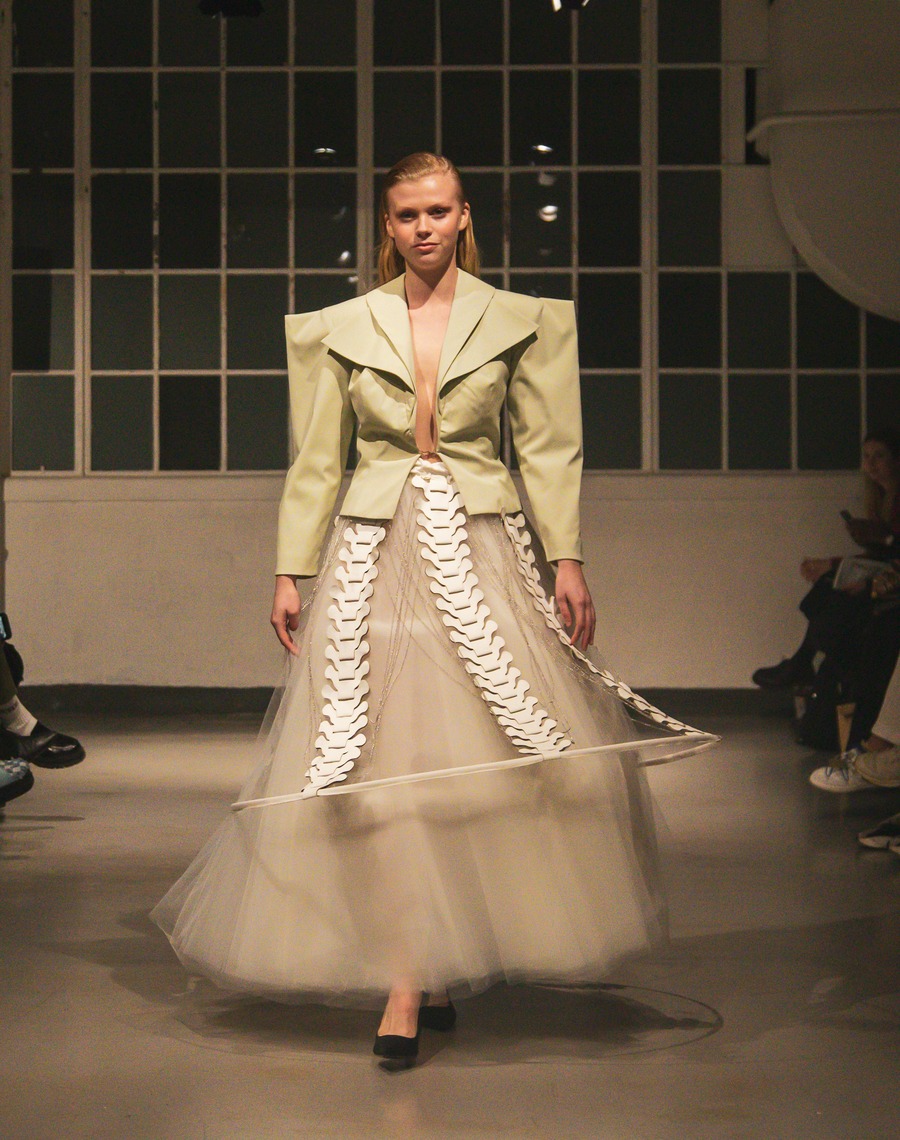 Anna Li @h.w.li_ Inspired by contrast, Li’s collection beautifully merges traditional and futuristic designs. Presenting ethereal tulle skirts overlaid with interlocking skeletal details, reminiscent of industrial chains, Li reminds us of the close proximity of both past and future.