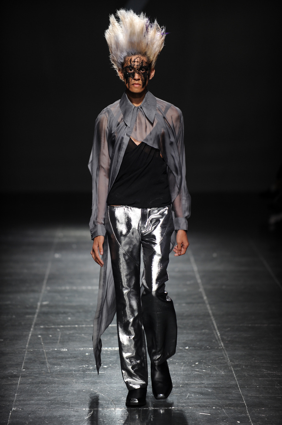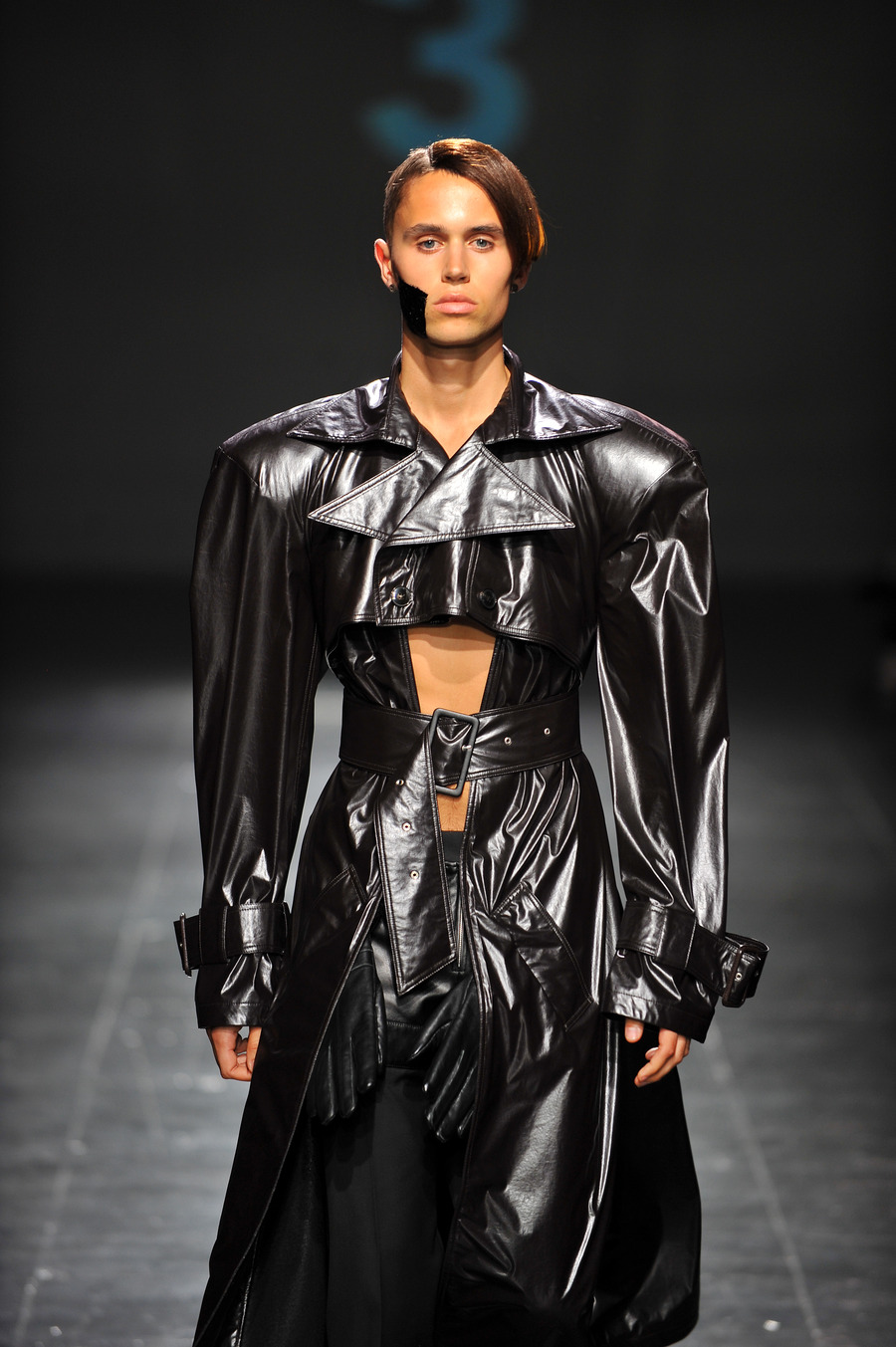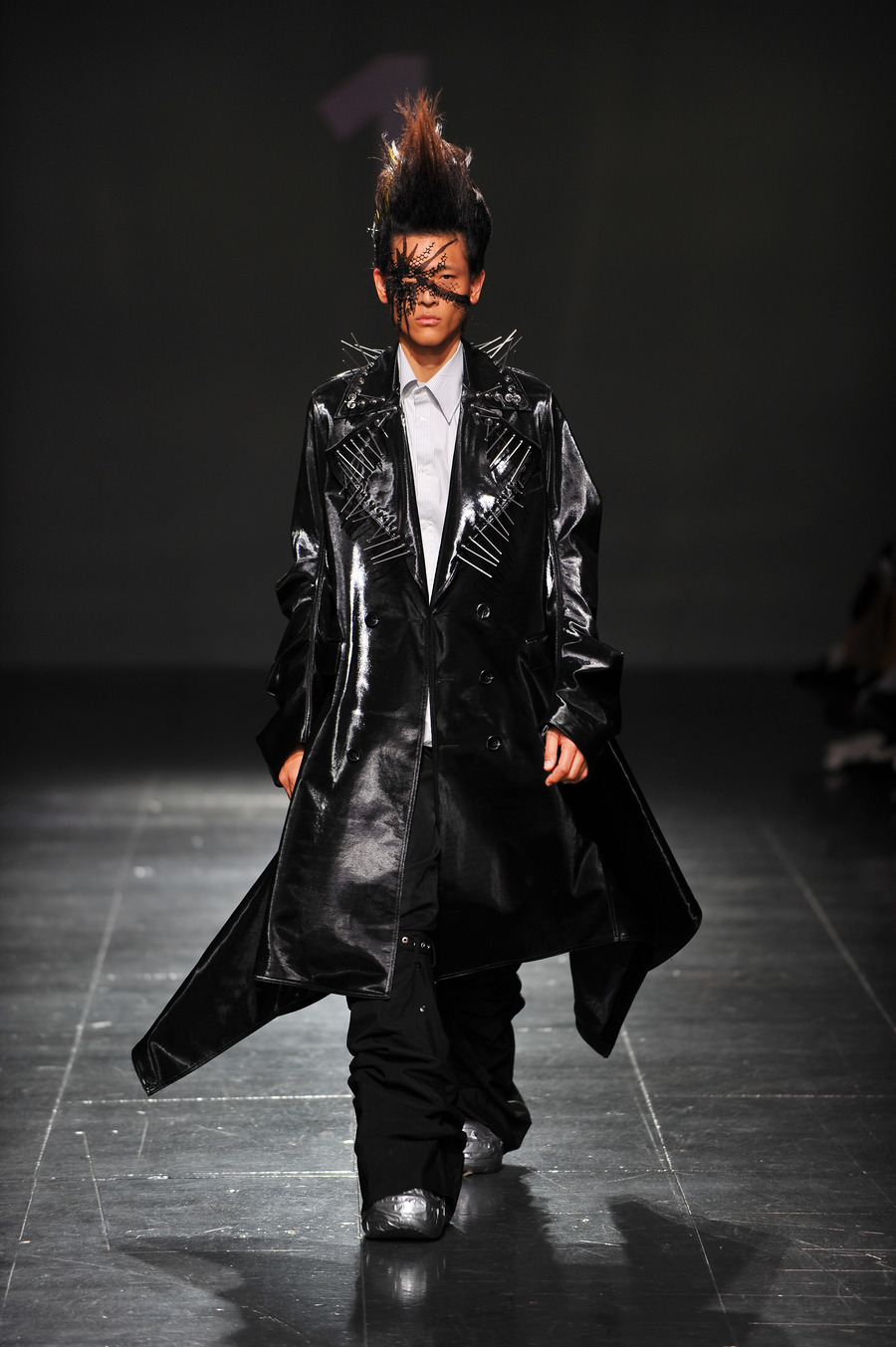 delivered Full Metal Dandy. Inspired by black metal music and researching some of the first black metal bands in Norway, metal iconography and satanic symbolism. His silhouette is a reference to the cape of a Norwegian shepherd and is further combined with menswear tropes of the Dandy & the Flâneur. Playing with nails as an iconic symbol, Dai transforms his garments into living sculptures that are visually recognisable within the genre.