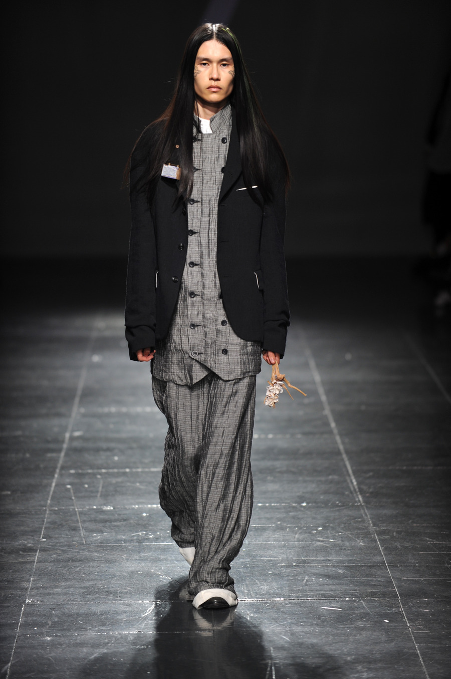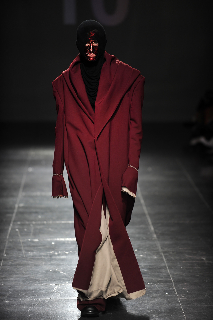 Biker. Bushido codes and Bosozoku Japanese biker gangs were the initial inspirations for Yoshie’s collection. These combined with military garments all evoke notions of Samurai culture which have always been an obsession in Yoshie’s practice. Using a transformable vintage motorcycle coat, she explored a folding method to create an elegant collection with tough sensibility in a modern fashion language. Classic fabrics such as gaberdines and matt drills are fused with gloss and shine to create a modern interpretation of the subject. The silhouettes combine volume with function establishing Yoshie’s design DNA.