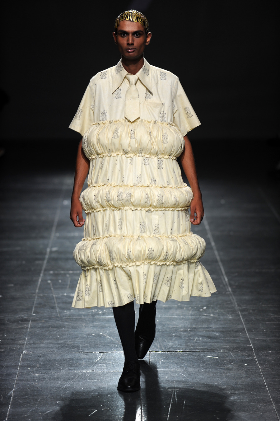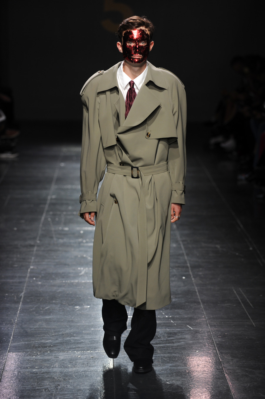 Tchotchkes. American slang referring to small shiny objects that are only decorative and not functional defines the concept of Lele’s collection. Inspired by extravagant visuals from the 1920s, specifically the photography series ‘Bright Young Thing’ by Cecil Beaton, a world of self-indulgent and extreme elegance, hedonism formed her muse. Characters from the group present themselves wearing extremely fitted tailored suits and ties, glossy hair, juxtaposed with sequin dresses and ruffled shirts challenging menswear identities. Lele investigates traditional menswear garments including the trench coat and tailored blazer with elongated silhouettes.