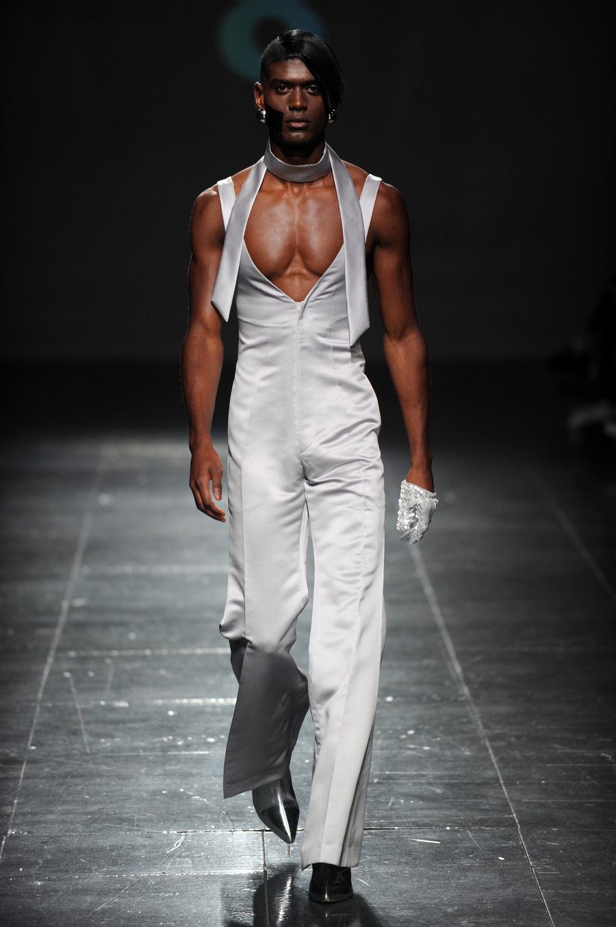 Unveiling Identity. Nym Promprasert fuses the elegance of couture with a touch of late 1990s grunge, transforming men’s clothing, particularly tailored jackets. These jackets are artfully manipulated, wrapped, twisted, and draped to reconfigure the wearer’s proportions. Transparent materials, such as silk chiffon or stretchy shiny fabrics, are thoughtfully incorporated to accentuate and reveal the wearer’s silhouette. This transparent aspect reinforces the concept of self-confidence and self-acceptance. In a harmonious fusion of femininity and masculinity, elements typically found in women’s fashion, including corsets, hook-and-eye closures, and boning, are effortlessly integrated into masculine garments.