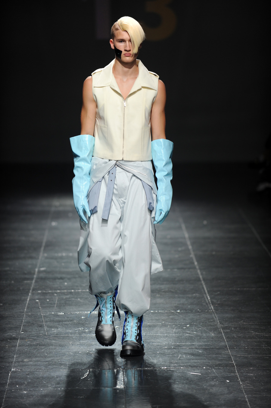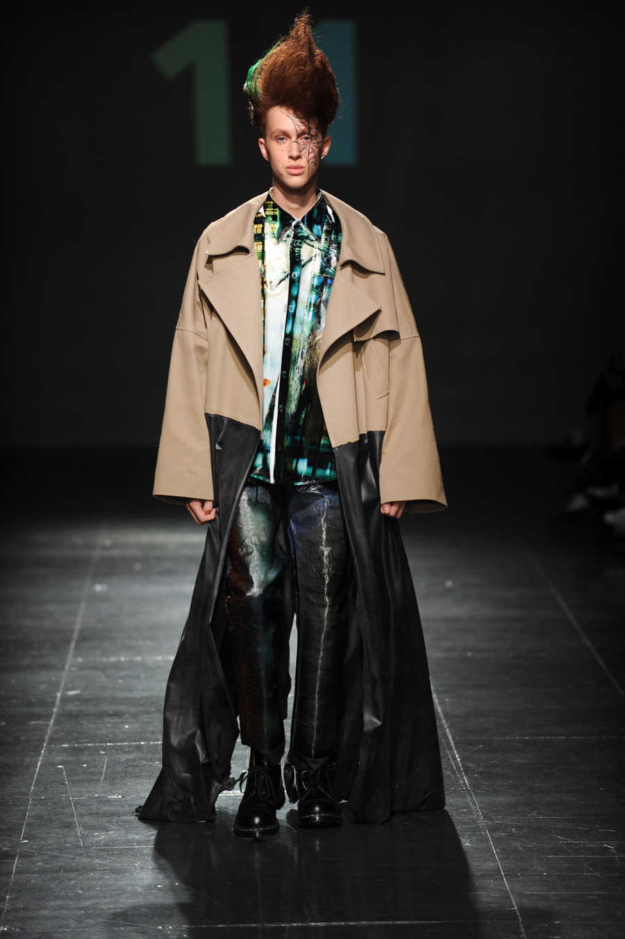 served DIY 90s in a collection combining the ideas behind modular buildings, stationery and 90’s indie music culture created through the use of classic menswear pieces including the duffle coat and parka. These classics have been deconstructed and re-imagined, reflecting the modular nature of modern-day buildings, materials and colours and made more contemporary through the application of materials such as vinyl and acrylic alongside timeless wools and denim. The silhouettes give a more relaxed, street-wear feel to the collection and the accompanying stationery-inspired accessories inspired by and in homage to Judy Blame.