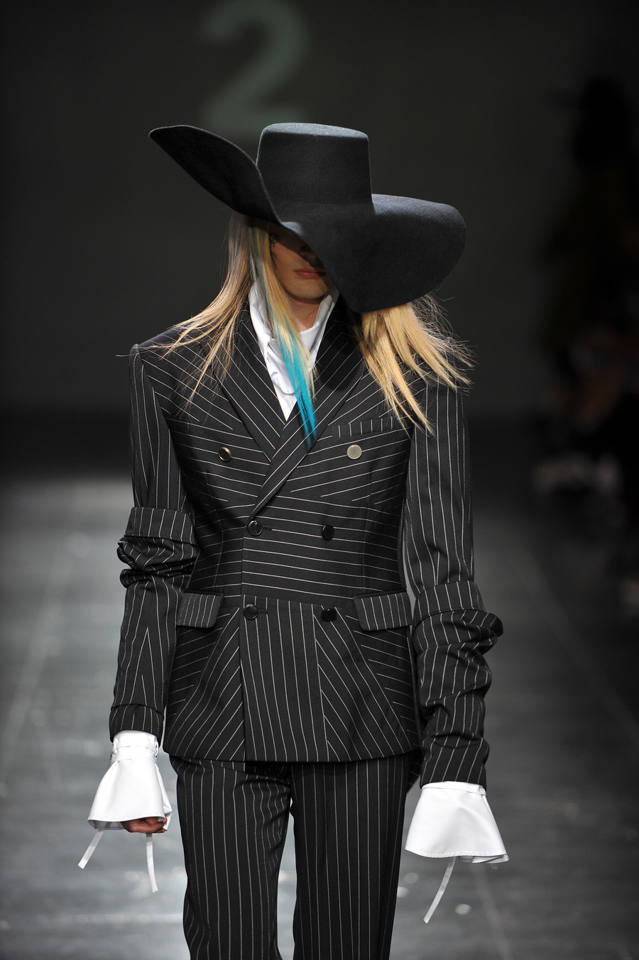 delivered Full Metal Dandy. Inspired by black metal music and researching some of the first black metal bands in Norway, metal iconography and satanic symbolism. His silhouette is a reference to the cape of a Norwegian shepherd and is further combined with menswear tropes of the Dandy & the Flâneur. Playing with nails as an iconic symbol, Dai transforms his garments into living sculptures that are visually recognisable within the genre.
