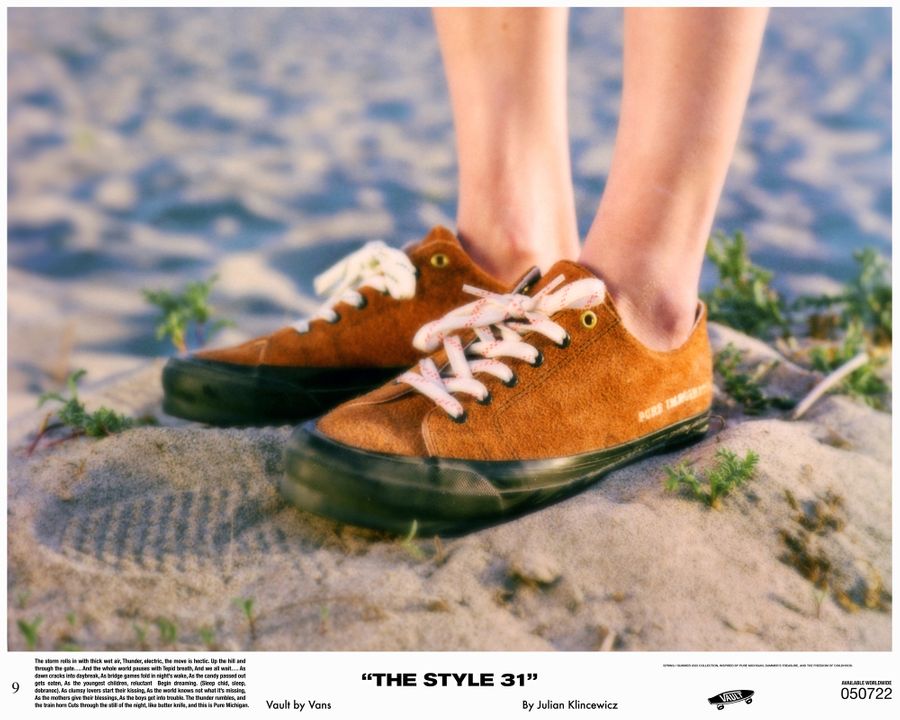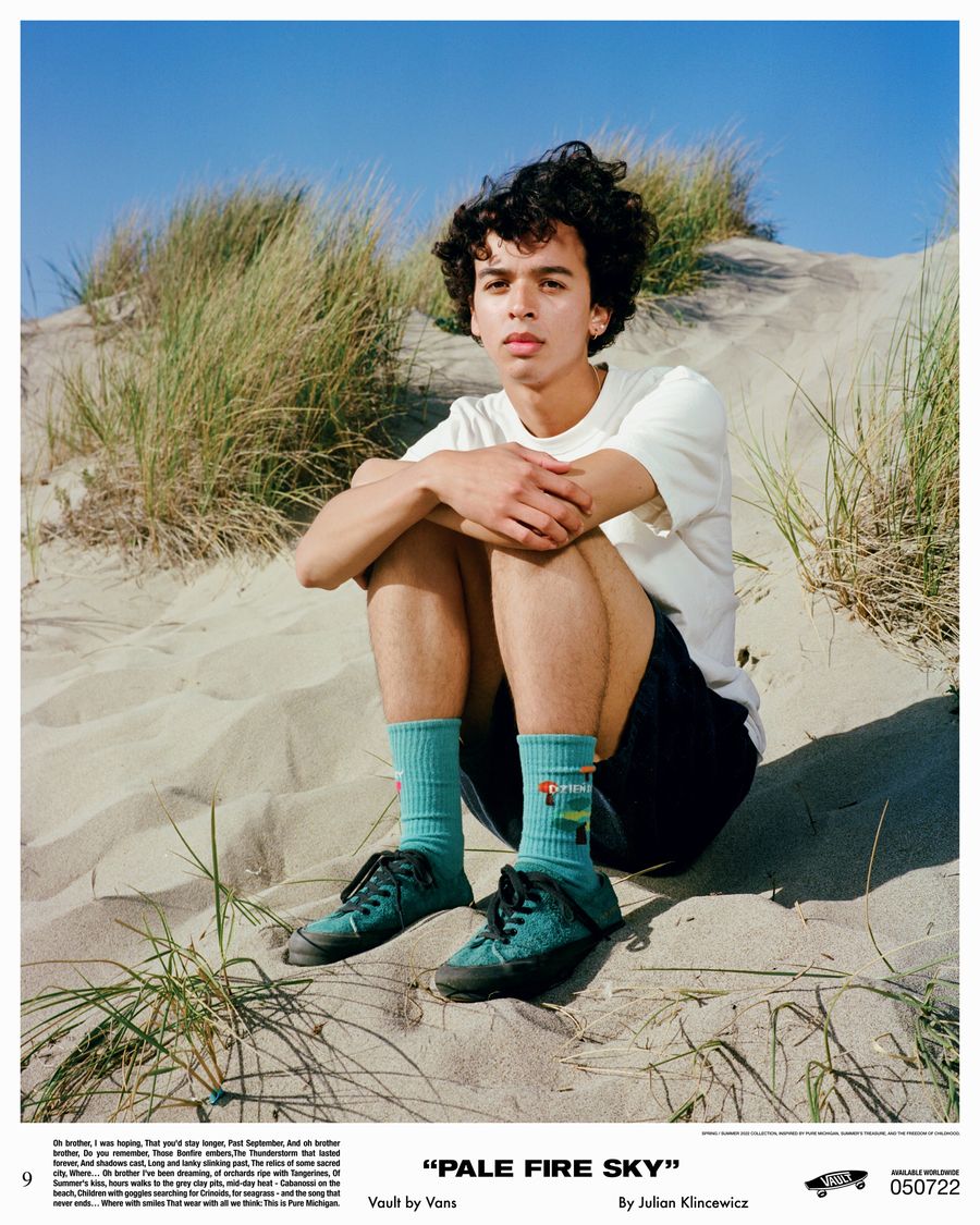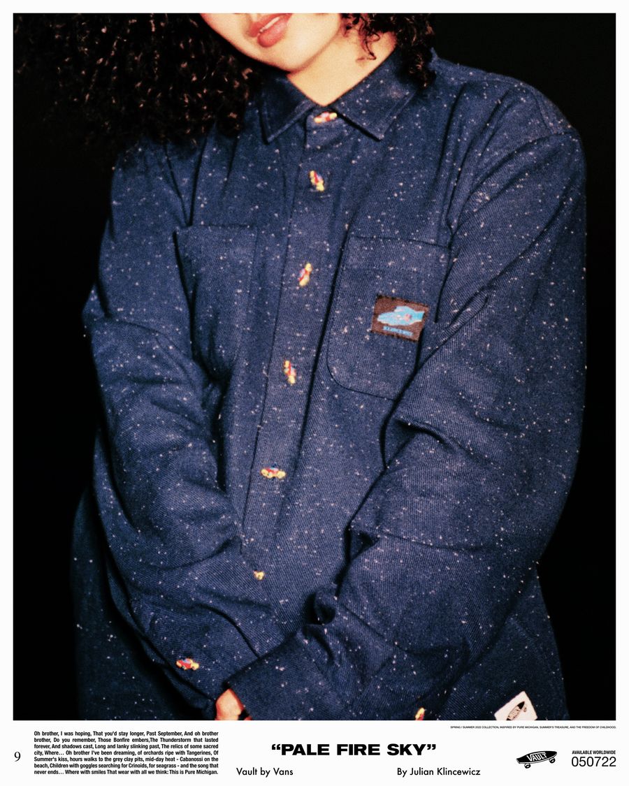 Each piece from the Vault by Vans x Julian Klincewicz footwear and apparel assortment was designed with intention and purpose. Julian tapped into his early career aspirations of becoming a shoe designer, summer experiences in Michigan, and the lifecycle of shoes worn throughout an entire summer to develop his designs. He landed on two central themes that carry throughout the collection: “PURE IMAGINATION”, which represents his childlike optimism built on a world of imagination and “PALE FIRE SKY”, which represents the energy of his more angsty teenage years.