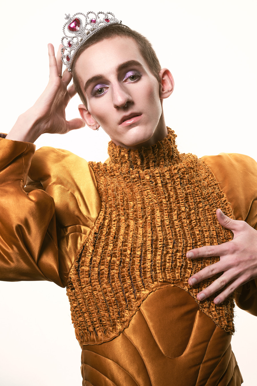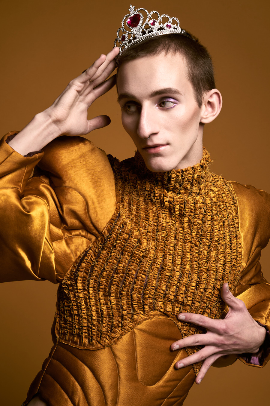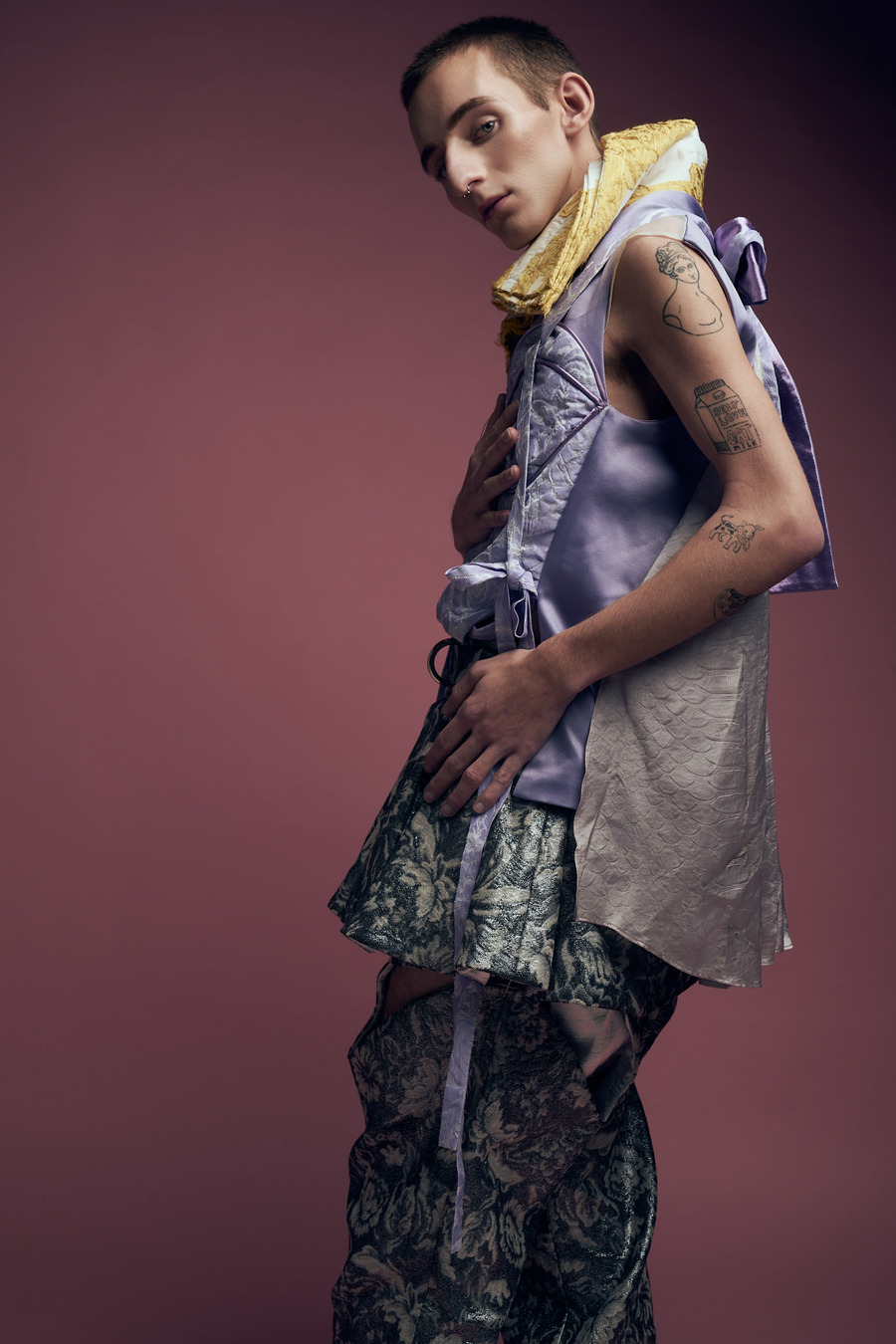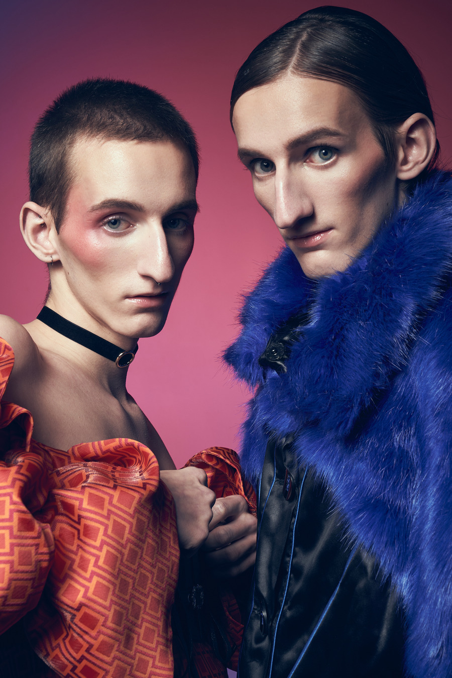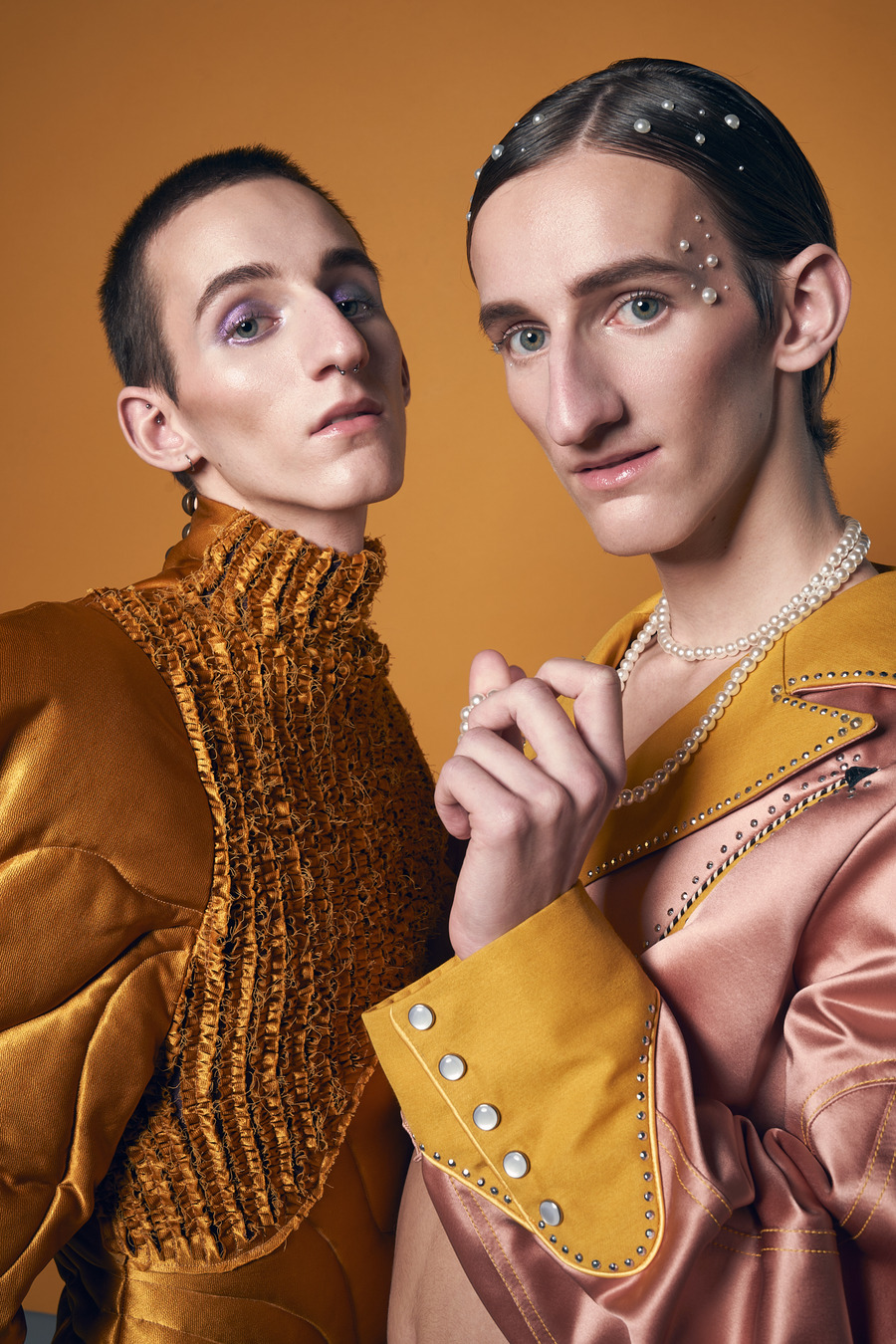 “Twin models Syl & Tybe are signed with No Babes Agency, a Belgian non-profit that questions taboos around beauty ideals, seeking to add diversity to the fashion industry by sharing the raw story of real people and showing that it is okay to be vulnerable in our differences. In the models’ own words: “We both have a big nose. We never struggled with it, but we received many negative comments about it. At times, it was tough. But in the end, it shaped us into who we are today—confident about our noses, and we even like to accentuate them. We were also bullied in the past because of our sexual orientation and for being more feminine. Fortunately, our family and close friends are very supportive and we have found a place in the beautiful LGBTQIA+ community.”