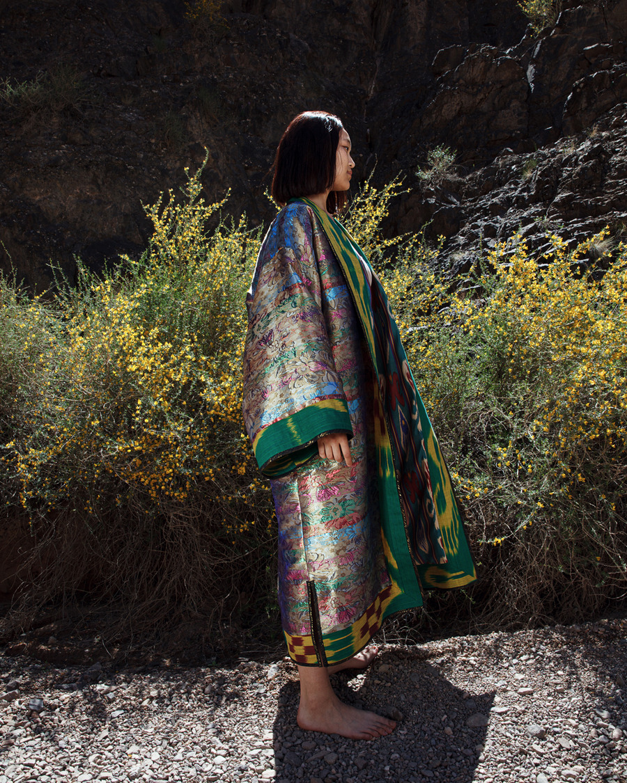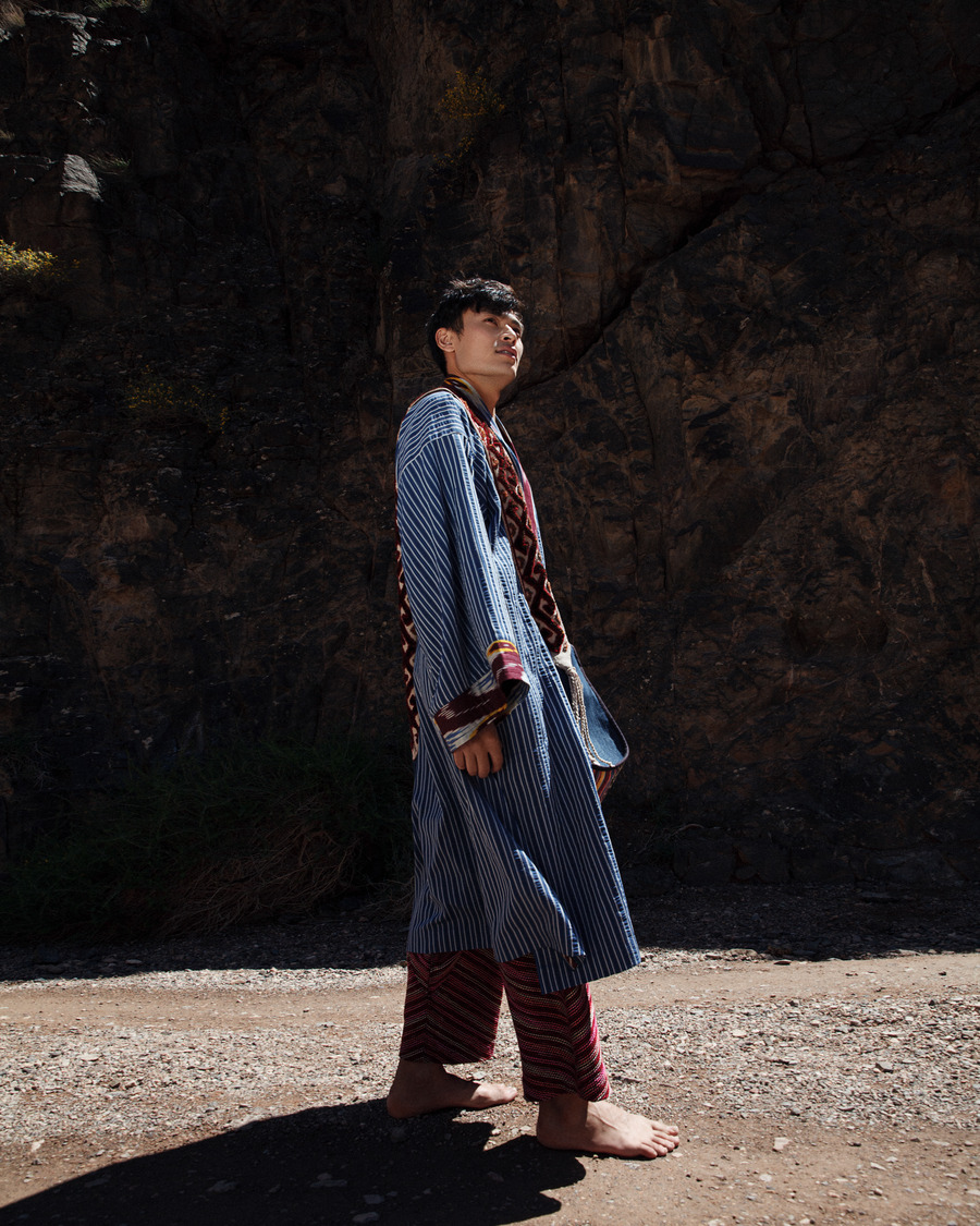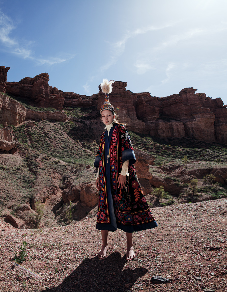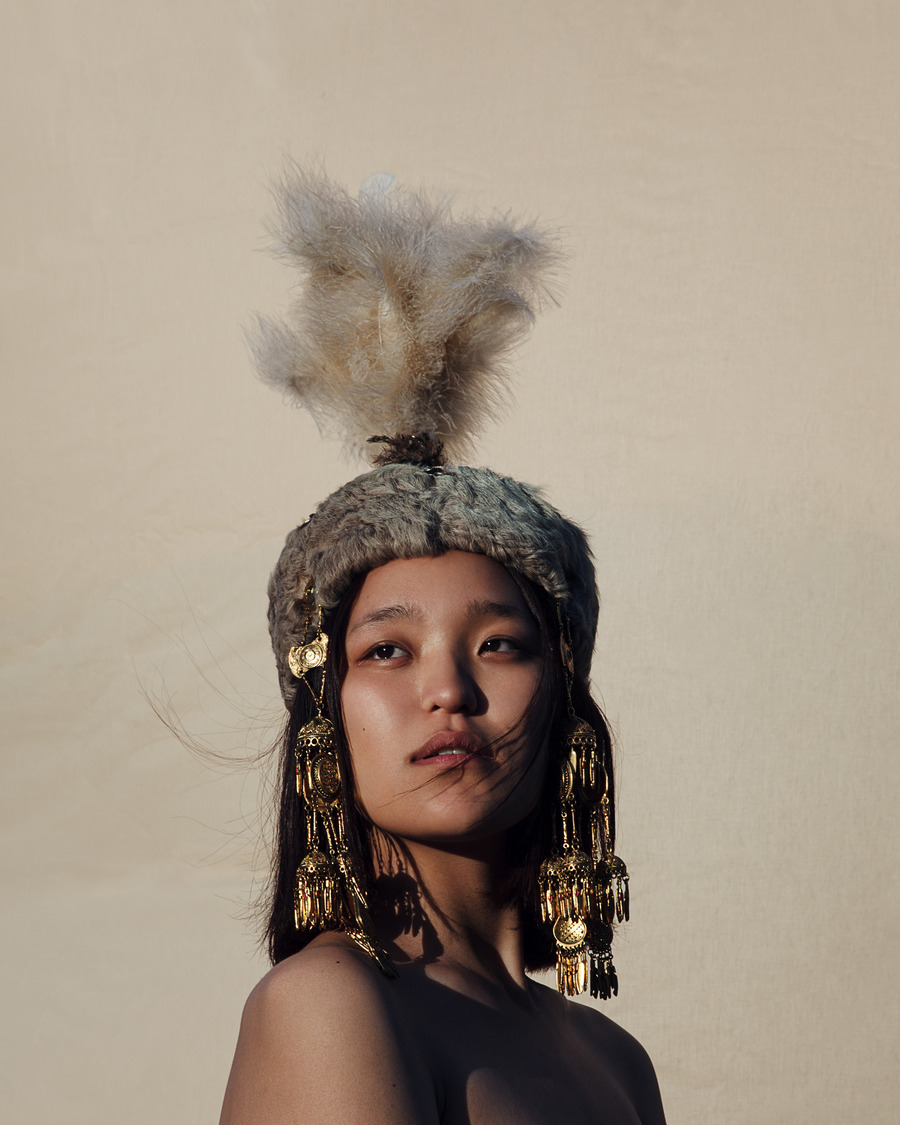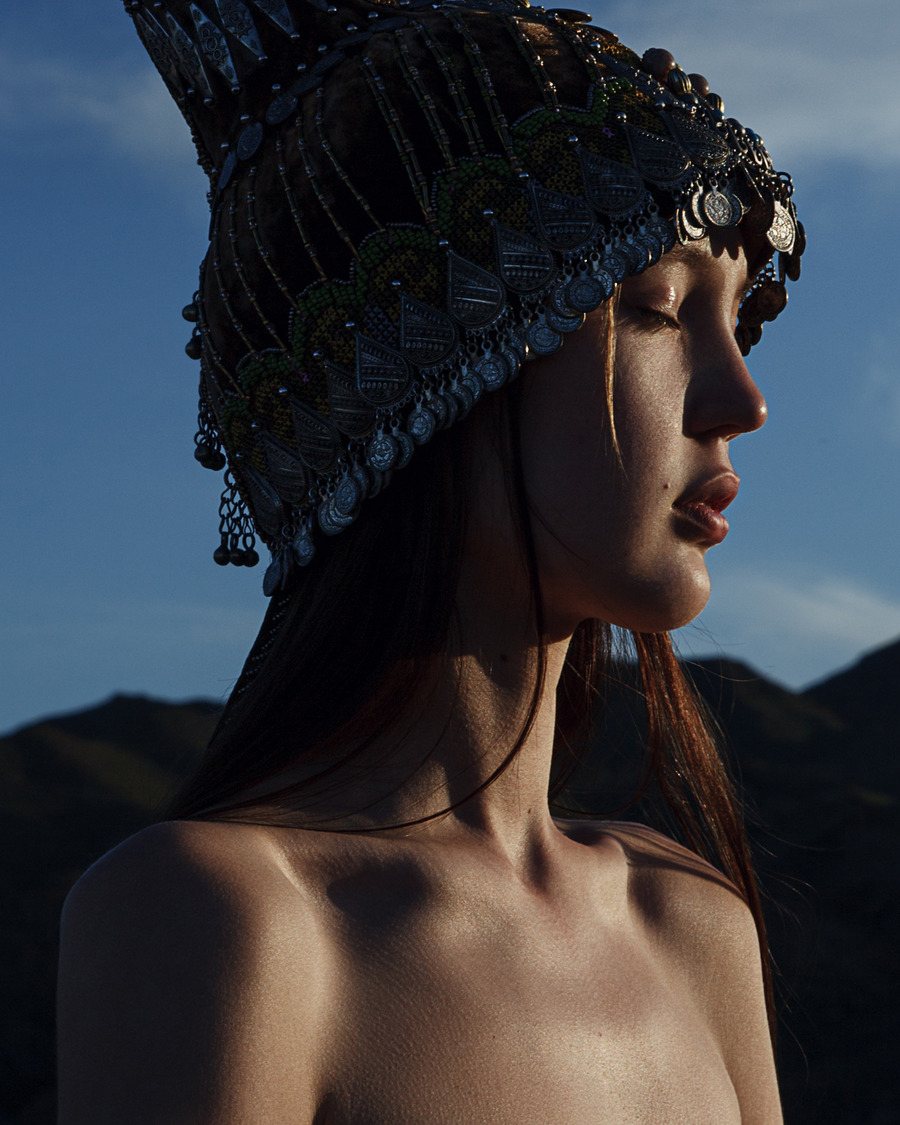I thought that my journey back would be a perfect opportunity to show more people the unique qualities of my people and country. The location and idea immediately popped up in my mind. The models are dressed in national costumes, they’re an interpretation of the Kurak art. The vibrant colours are believed to protect the wearer from curses, hexes and bad luck. One of the main practices in this specific art style is to use pieces of cloth and other patches that were received as gifts at important events. Kurak is the art of delicate care towards the material and spiritual. This is the art of protection against bad forces and conservation of the national spirit. The hats are called Saukele – ancient Kazakh headwear. A wedding headdress is worn for the first time only after marriage, for about a year, and then it is taken off and put on only on big holidays.