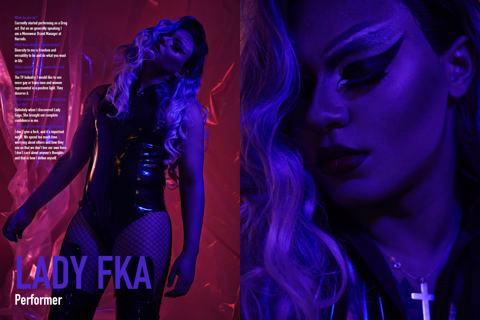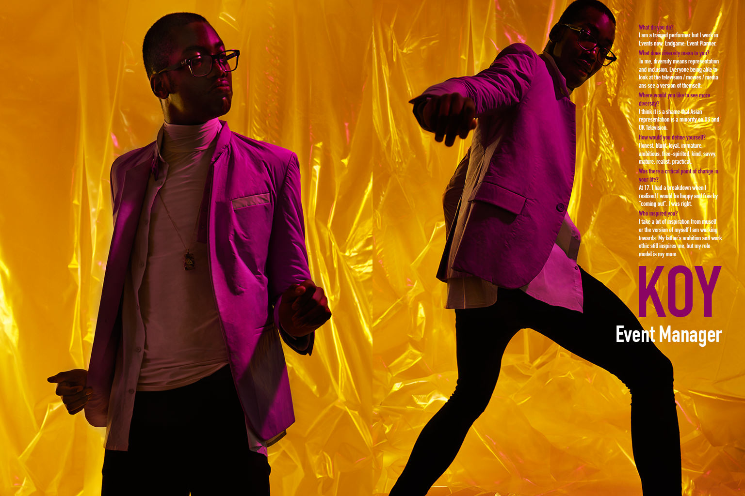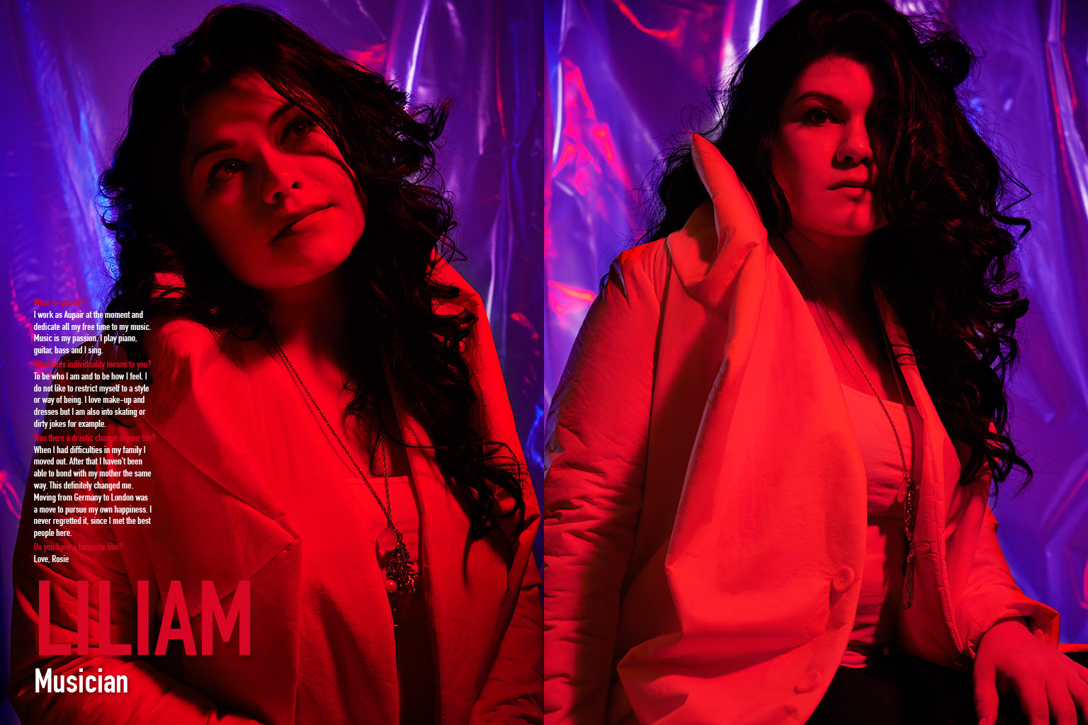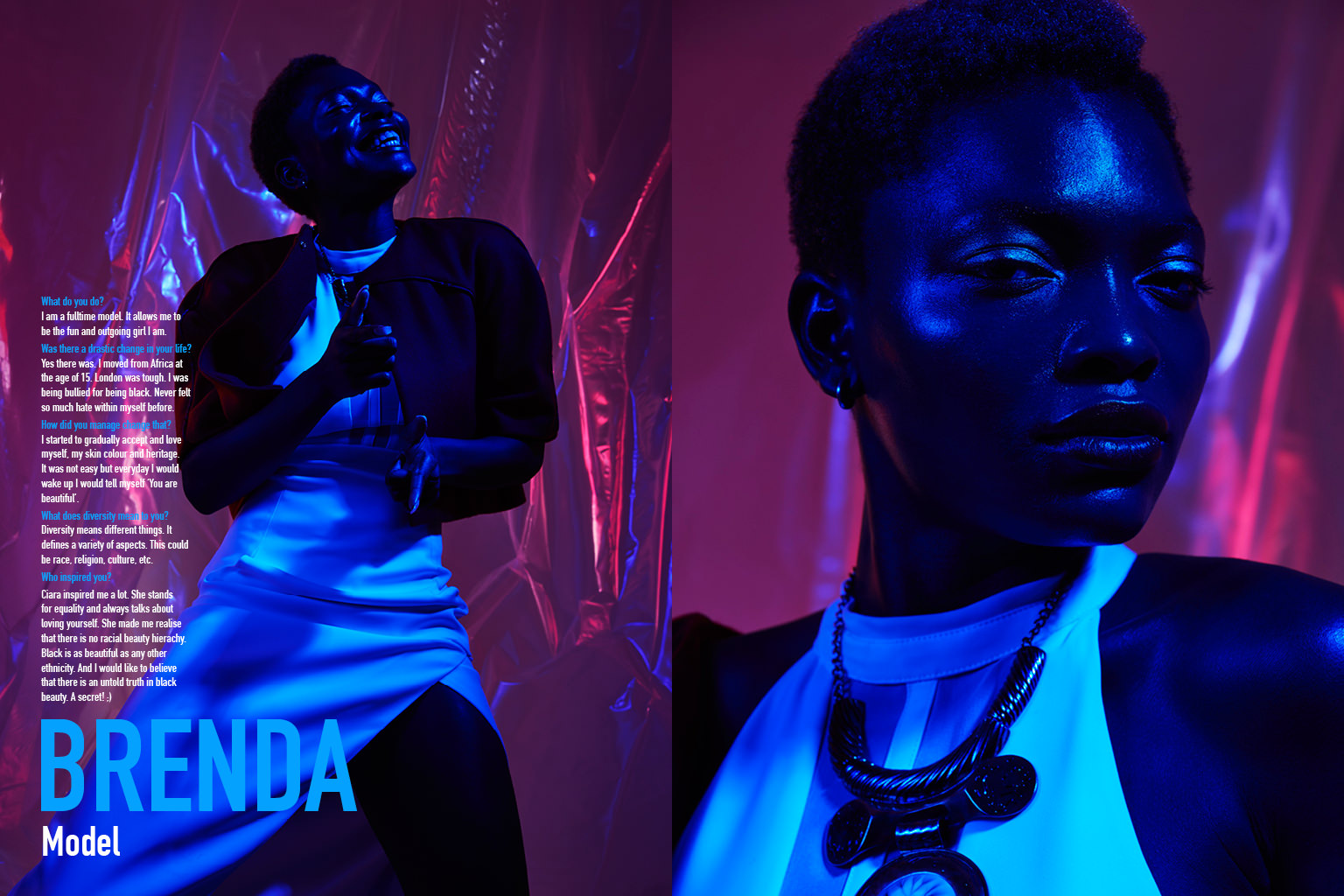 “This project’s aim was to celebrate London’s diversity. You hear a lot about the people in London who already made it or are on the verge of a break through. However you hardly hear about the people among us, the people living everyday lives just like us. This project is supposed to celebrate the undiscovered beauty of London, showcasing it’s everyday diversity, all based around the entertainment business. Whether it is events or film, music or fashion, there are a lot of unheard voices out there that want to be heard or seen. Each individual was picked due to a specific quality, that may very well be considered as a minority in their respective field. They were asked to bring a piece of jewellery that is dear to their heart as well as choose an item from the styling rail, which they identify most with. Followed by a questionnaire for them to fill out, the team created the colour scheme and way of representation based on their survey. This speed up the process of actually getting to know the subject in more depth. During their performance of shooting, each individual could also pick the music that would support their session. Having a broad song variety from Rihanna’s Work, classical music, Panic at the Disco, up to Ru Paul’s Sissy that Walk. The aim of the shoot was to raise these individuals to some sort of icon. Using bold colours to really draw the attention to them as well as to get rid of hair colour, skin colour and other differences. Essentially the project is aimed to take in all their diverse aspects and features, put them aside and show them in as an individual iconic personality.”