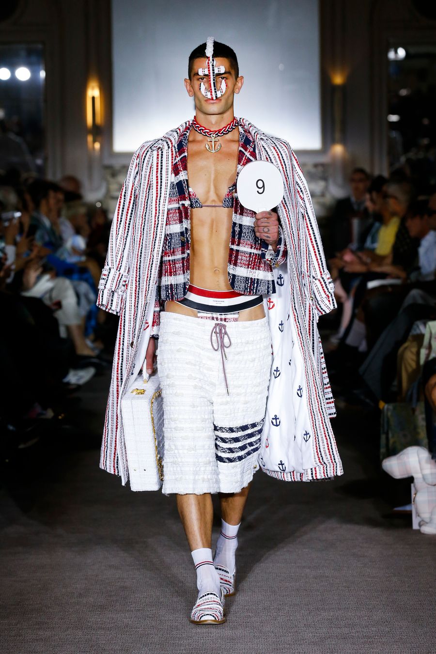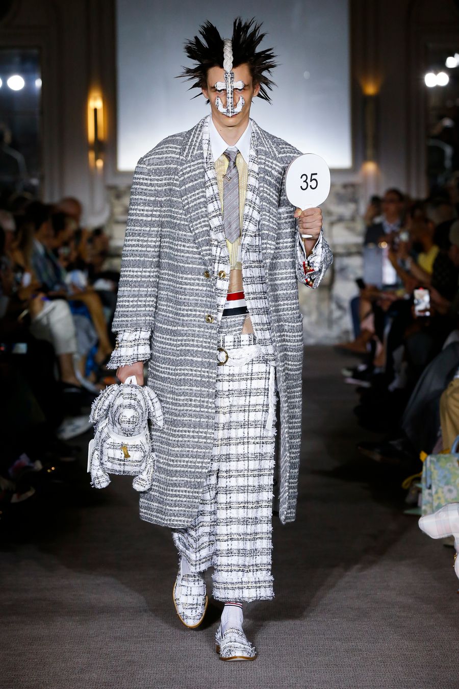 Also part of the clothing were mini shorts, long trench coats, sloped shoulders, moulded set-in shoulders and trompe l’oeil skirts. Thom Browne, known for challenging the norms of uniforms proved once more to be an expert in giving classic tailoring a new twist and in showing his collection as part of a highly conceptual runway presentation which gave him and the brand worldwide recognition.