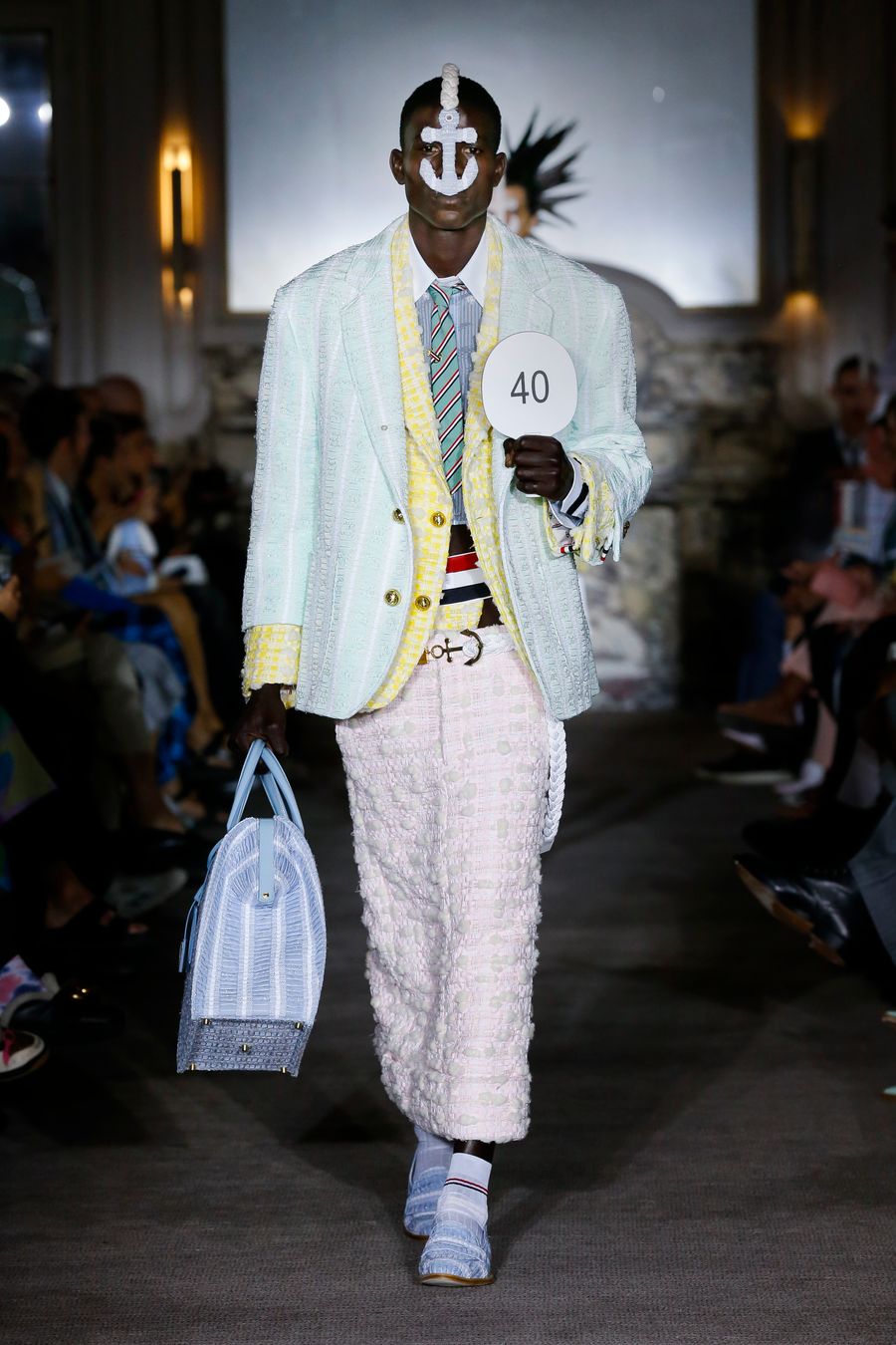 Thom Browne presented his Spring/Summer 2023 menswear collection during the men’s Paris Fashion Week. With this collection, Thom Browne is once more breaking established rules of classic tailoring and is giving a twist to the office and business look. The tweeds of the collection were custom developed in the south of France with materials such as chenille, denim, leather and lace. The theme of the collection was “period couture” which was underlined by a teaser the brand published on their socials prior to the show in which they insisted not to be late for the show.