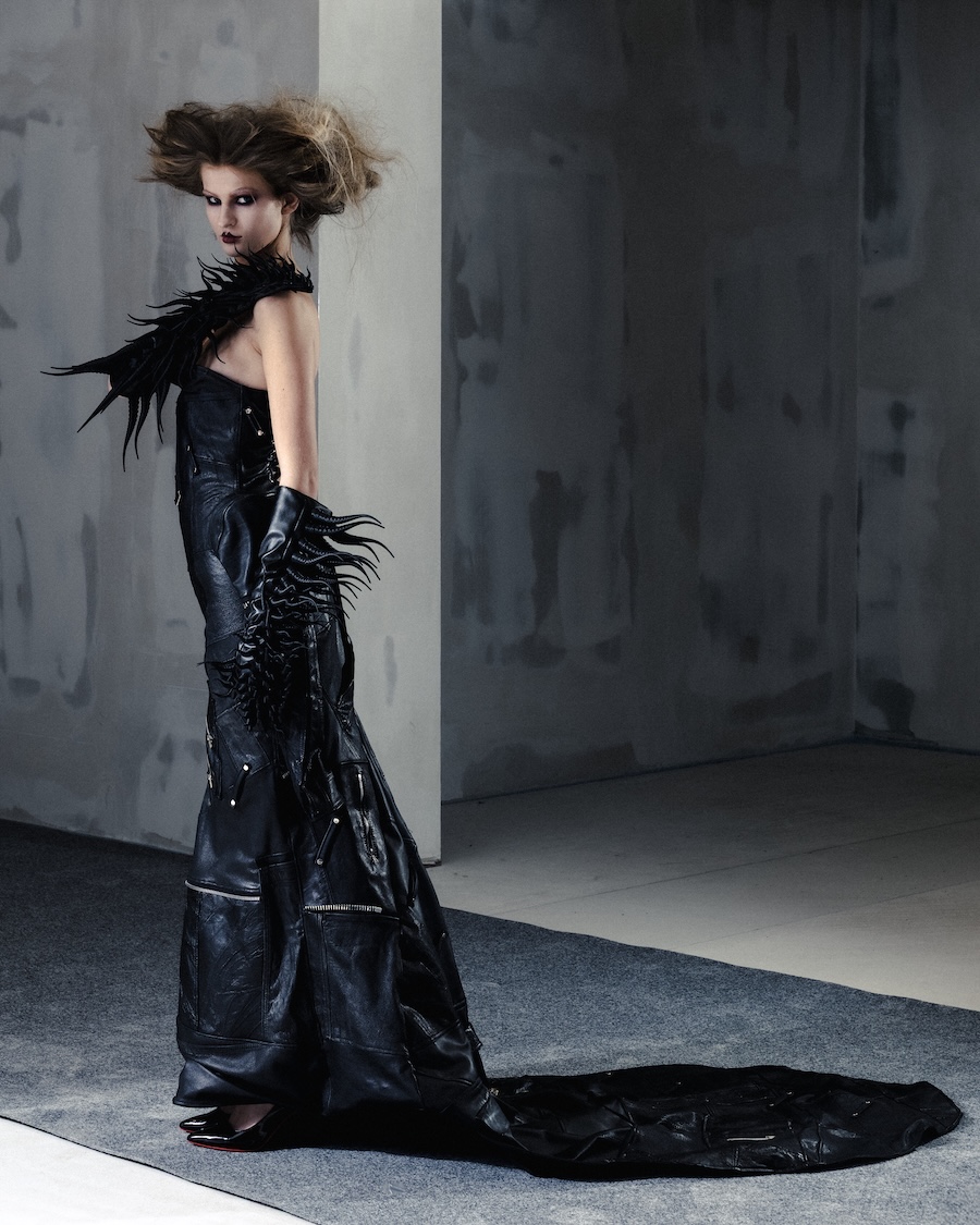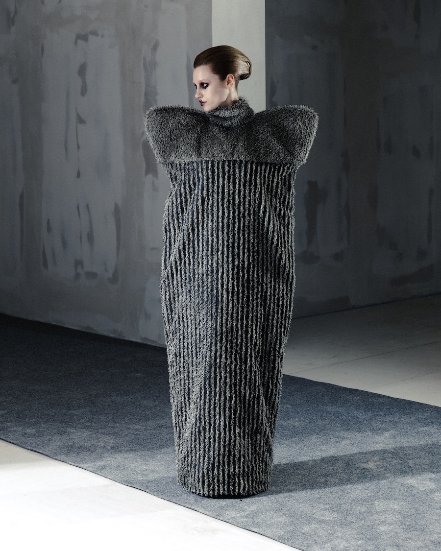 The opulent silhouettes in this collection pay homage to historical sartorial elements from the 17th and 18th centuries. Volume is manipulated, shifted, exaggerated, and distorted to provoke a purposeful “deformation” of the body, thereby challenging conventional ideals of beauty and proportion. Hanisch aims to illustrate that the concepts of protection and visual distinction can coexist, ultimately serving as a form of empowerment.