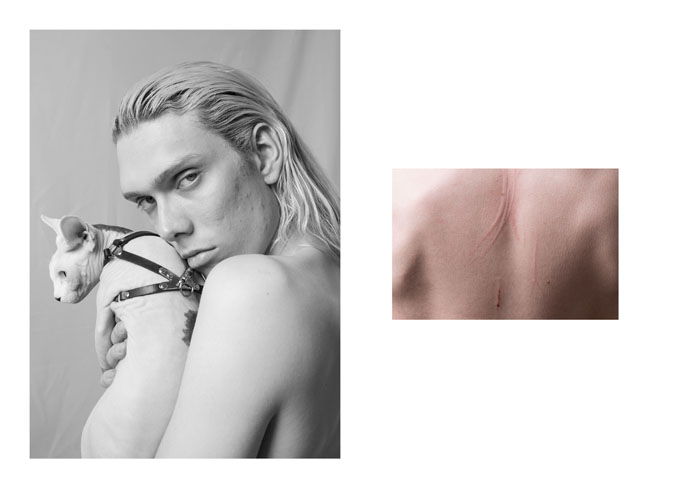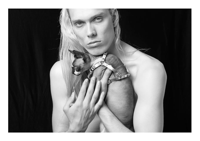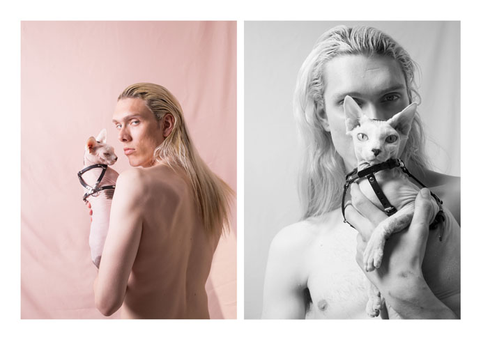 A KALTBLUT exclusive. Shot by photographer Anastasia Muna. Model Úlfar Logar with his feline friends takes us back to our animalistic nature with accessories from Tineola designs. Hair and make up by Victoria Filina.