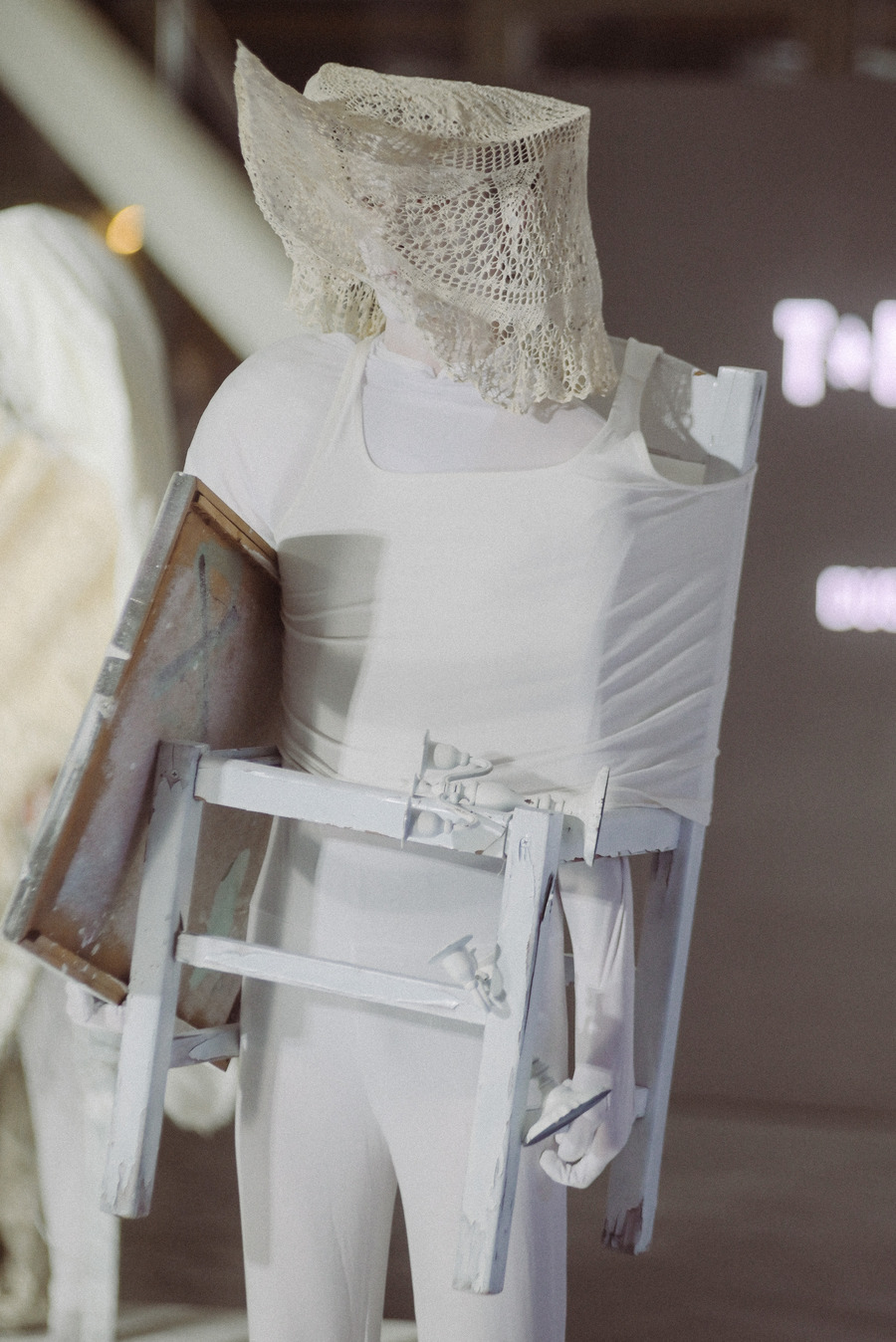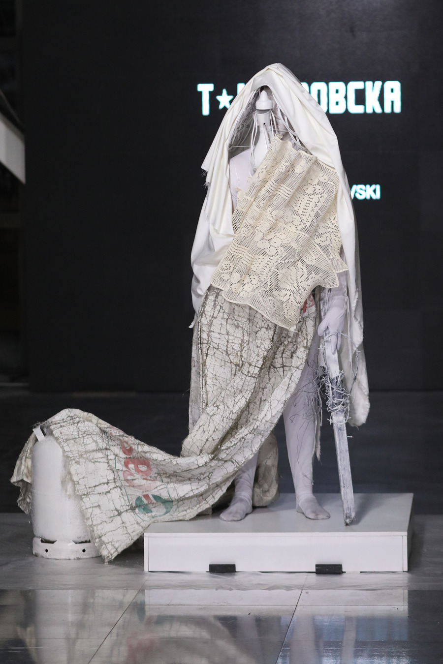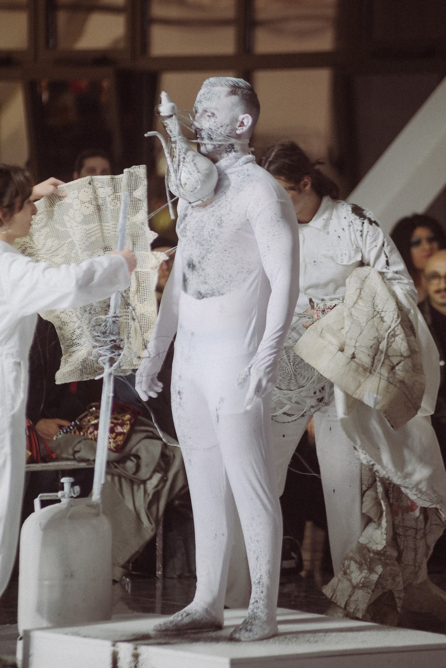 We were extremely grateful to be working with music artist Aka Thesaur, who also created the music for my ‘Mind Your Mind’ collection. For this occasion, he got inspired by the doily sculptures I had made from my grandma’s old doilies, which were part of the looks at the performance. This meant there were elements of traditional Macedonian songs incorporated into the ambiental music he created. In addition to this, it so happened that a lot of the objects we had used were resembling traditional Macedonian objects, so as the audience had gathered, there was an element of cultural disruption of tradition in the performance. This was not, a conscious aim for us, as we kept the process very organic and spontaneous, but we were very excited to have allowed the audience space to interpret the performance in their own way, and with that continue the life of the project, beyond the 15-minute presentation.