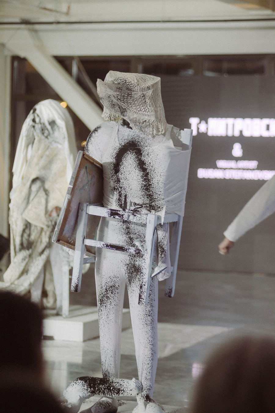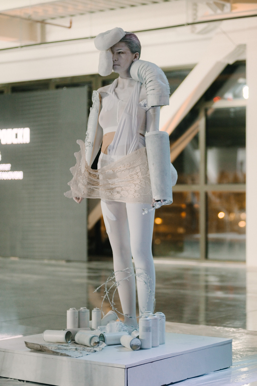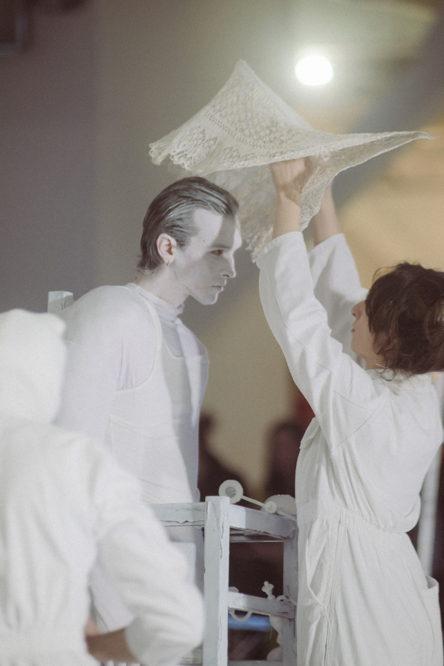 We were extremely grateful to be working with music artist Aka Thesaur, who also created the music for my ‘Mind Your Mind’ collection. For this occasion, he got inspired by the doily sculptures I had made from my grandma’s old doilies, which were part of the looks at the performance. This meant there were elements of traditional Macedonian songs incorporated into the ambiental music he created. In addition to this, it so happened that a lot of the objects we had used were resembling traditional Macedonian objects, so as the audience had gathered, there was an element of cultural disruption of tradition in the performance. This was not, a conscious aim for us, as we kept the process very organic and spontaneous, but we were very excited to have allowed the audience space to interpret the performance in their own way, and with that continue the life of the project, beyond the 15-minute presentation.