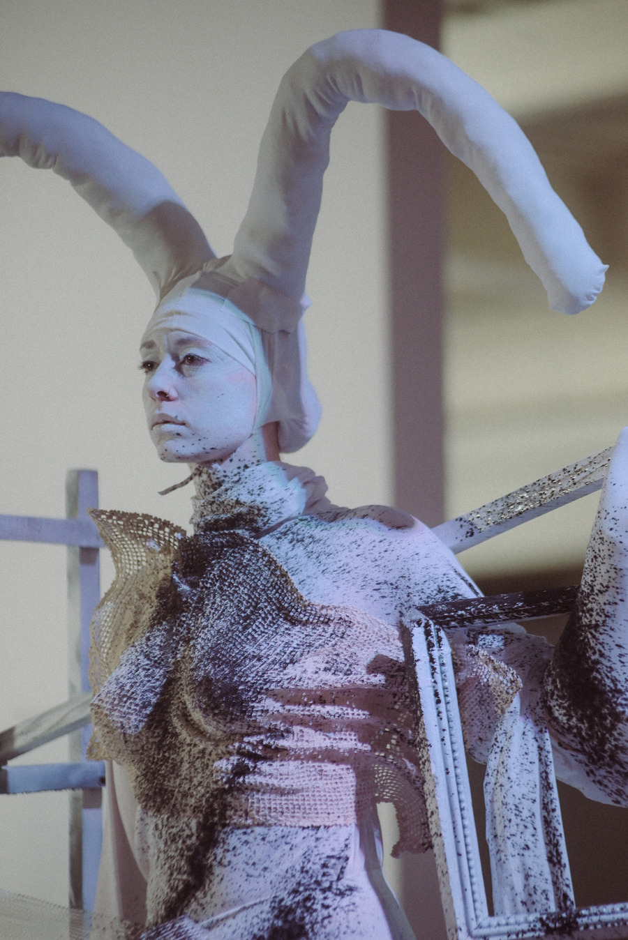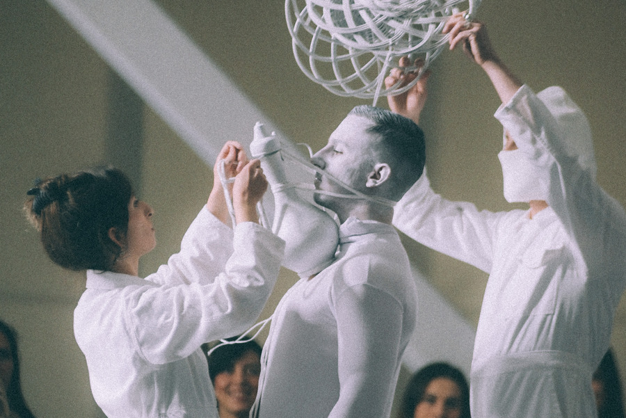 While exploring the relationship between the body and the 3D objects we started thinking about the ability of objects to distort the body. Unlike clothes, which usually adjust to the body, using 3D objects meant that the body had to adjust to ‘the clothing’, changing its natural state and morphing into a new part-human part-object entity, which we like to call a live sculpture.”