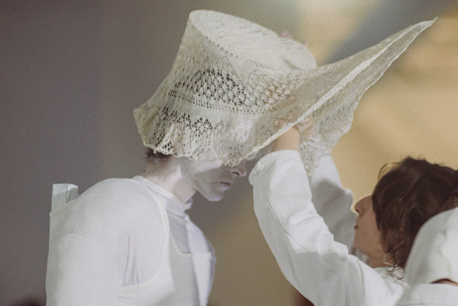 The spontaneity in the creative process was also dictated by the remote work we did. With me being in London and Dushan in Skopje we had nothing else but IG chats, video calls and those disappearing images you can send, to rely on. We both worked on separate elements of the looks. Dushan was gathering and curating the objects, while I was working on the doily sculptures and headpieces. This meant we only had a few days prior to the presentation, once I arrived in Skopje, to assemble the actual looks. It felt extremely liberating not to have to spend weeks on perfectly finishing hems, and just allow the moment to guide us, while we roughly tied things together with elastic, strings and tape.