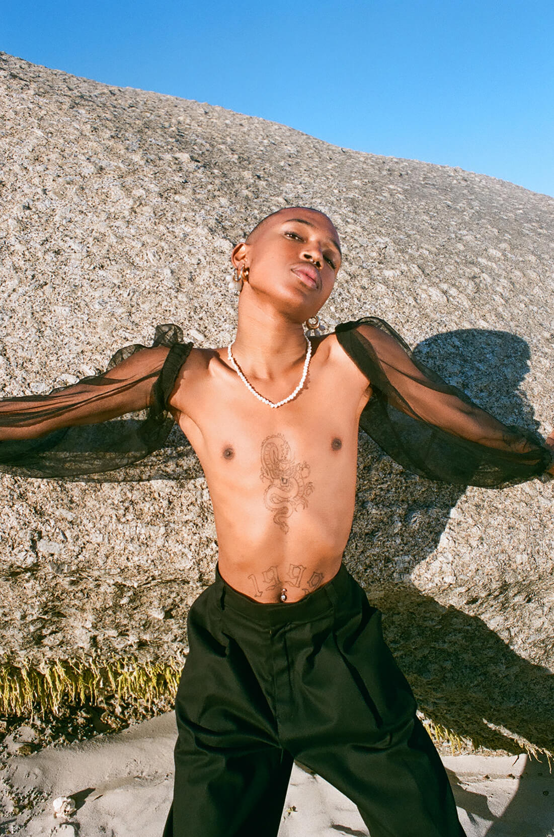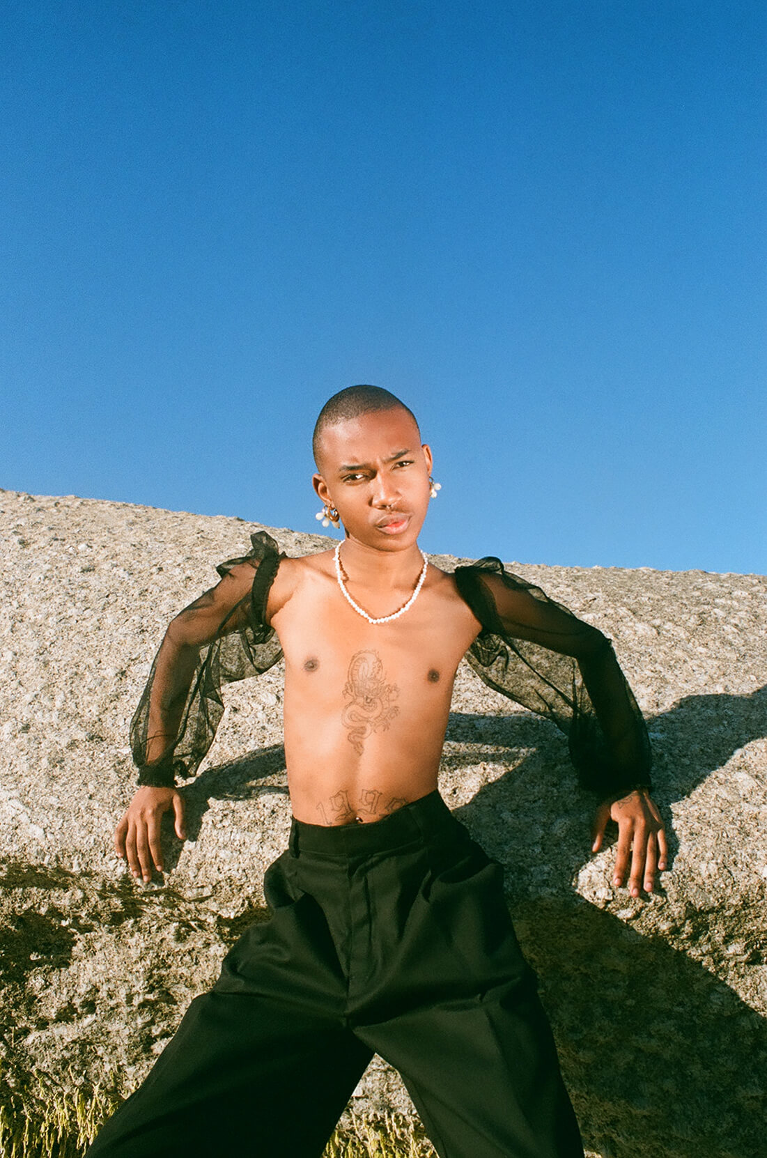 A KALTBLUT exclusive editorial and fashion film. Photography by Andréa Loupis. Model is Nkululeko Masemola. Fashion Film by Nicholas Loupis. Creative Direction & Styling by Terence Masamuna. Brands are W35T by Nicola West, Pichulik, Pina Jewels, Margot Molyneux and Stiebeuel.