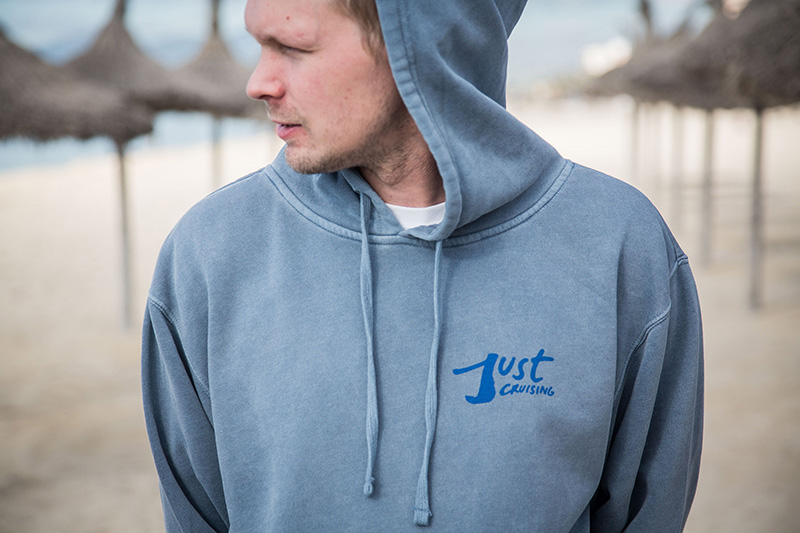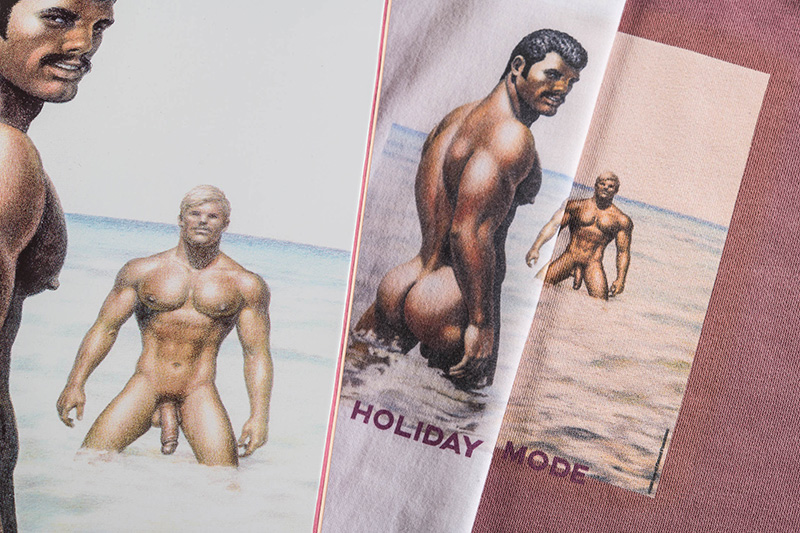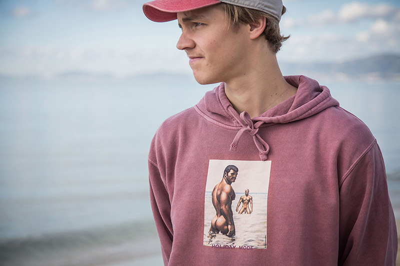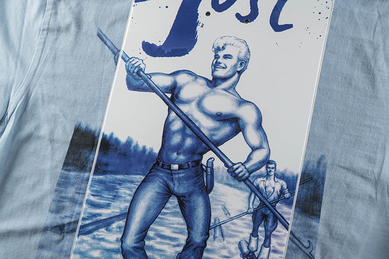 The collection includes a real treat for Tom of Finland fans: The ”Just Cruising” deck and apperel features an early drawing of a happy lumberjack cruising down a river on a log – a scene of Finnish agrarian life. It ended up on the cover of Physique Pictorial, an early gay pin-up magazine, in 1957, marking the first time Tom’s work was published in the USA.