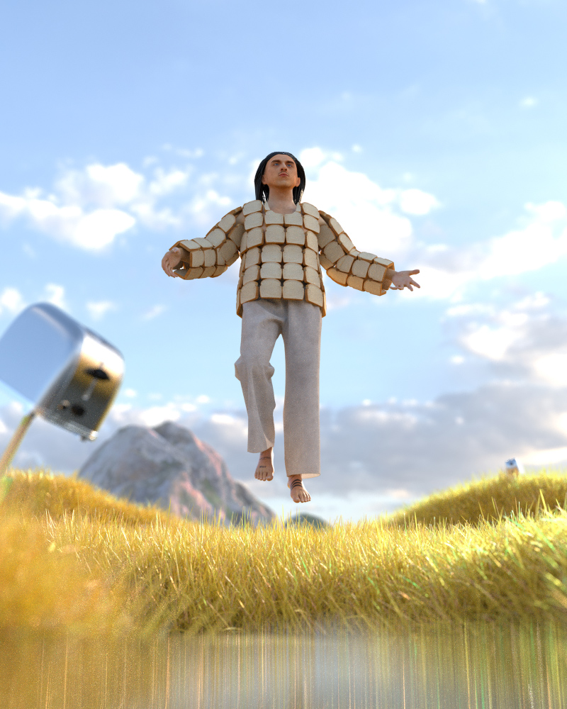 The AR items bundle by Tommy Cash is united by the surreal infusion of Post-Soviet aesthetics and consists of 3 digital items: a soviet car transformer, a virginity leaf, and a bread jacket. The NFT by the artist who is known for using his platform to confront uncomfortable prejudices as a champion of inclusivity, sexual freedom, and body positivity, is repurposing the imagery of Adam’s Fig Leaf with new meaning for the modern age.