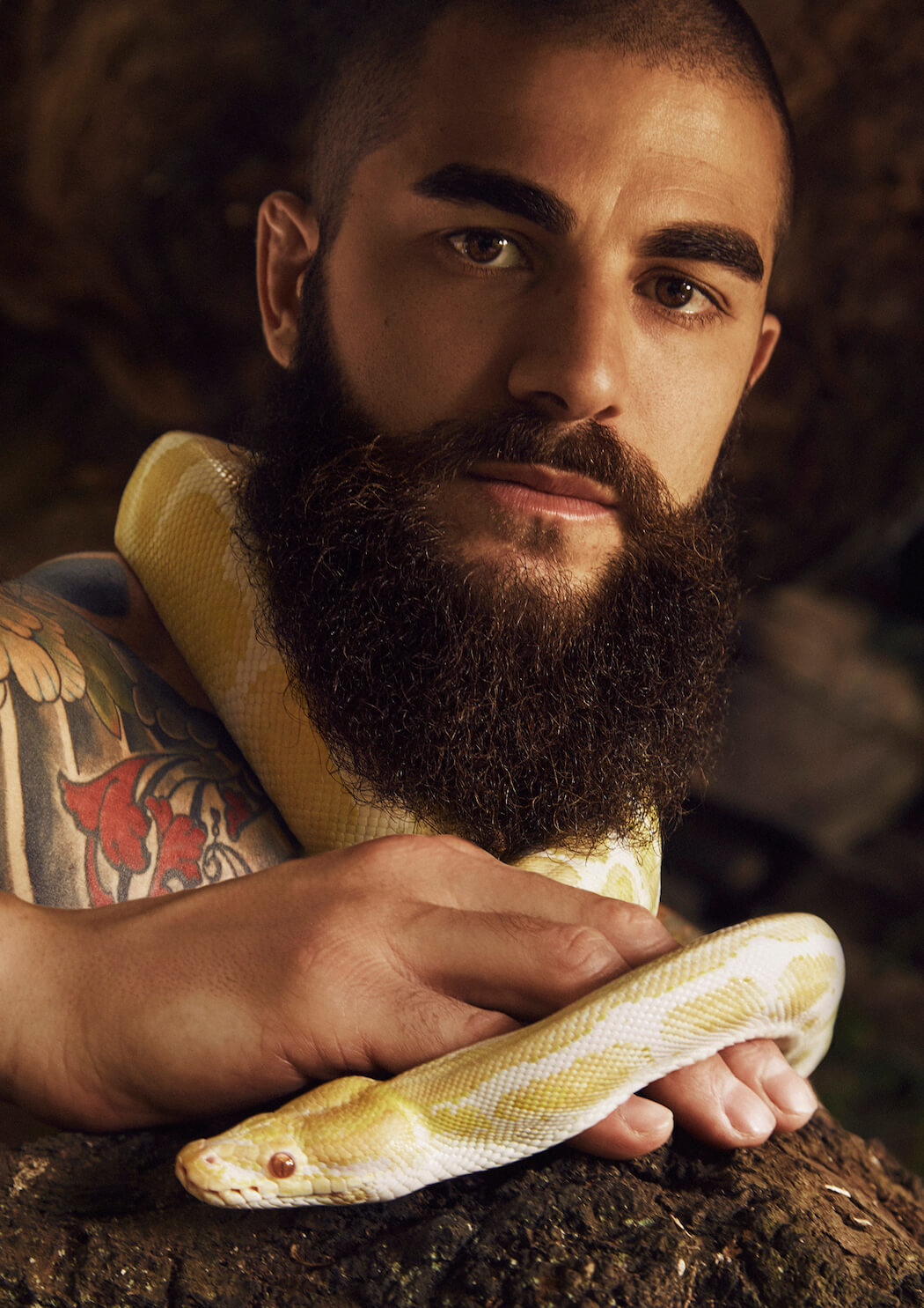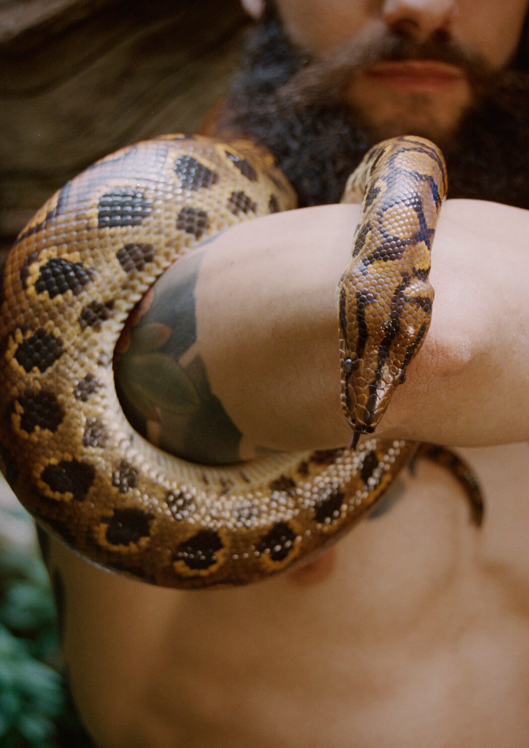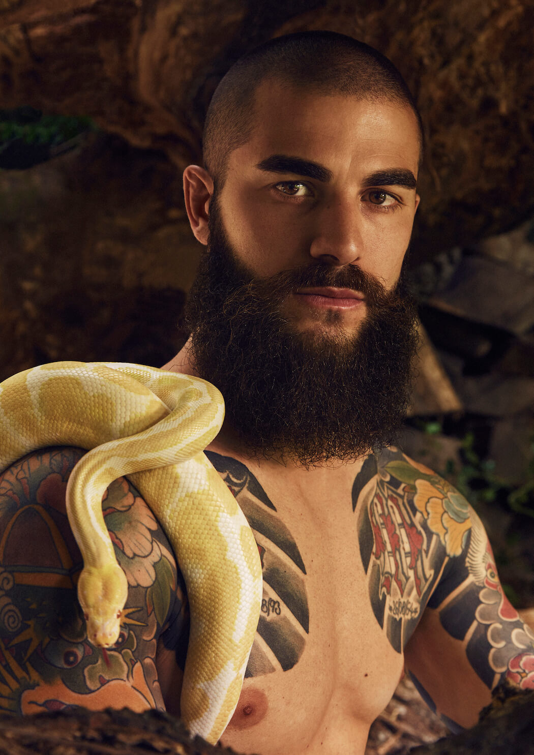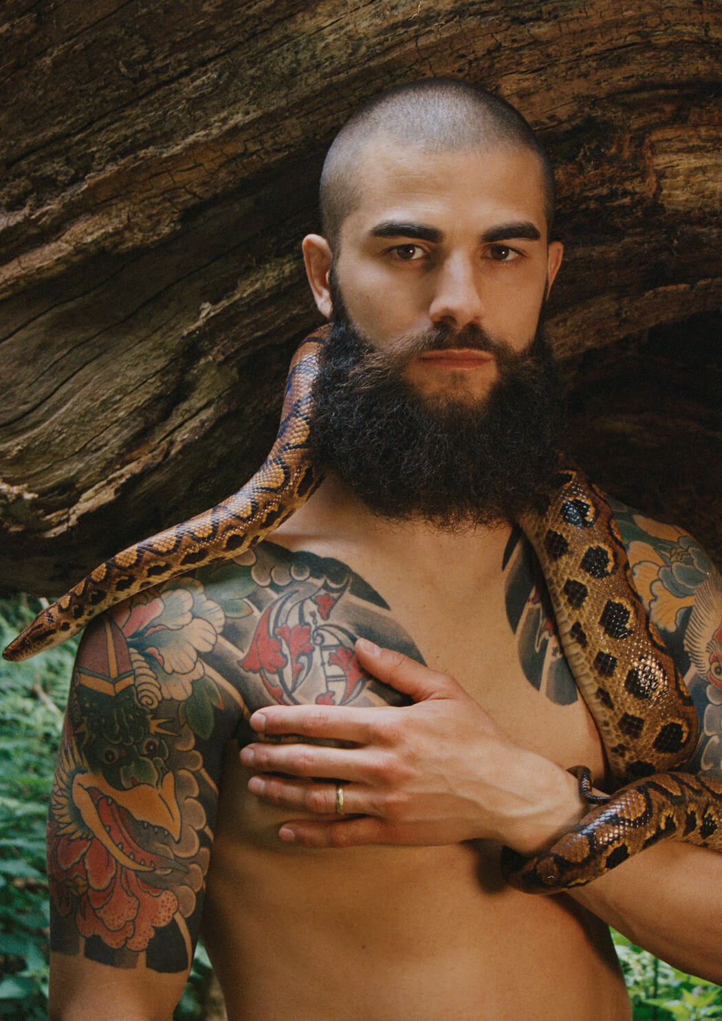 A KALTBLUT exclusive. Photography by Eddie Blagbrough. Model is Antonio (Tony) Vacca. “I’m Eddie and I’m a photographer based in London. I shoot mostly portraits and menswear fashion. During the lockdown, there was no way of shooting any fashion as the PR offices were closed. If I wanted to shoot then I would’ve had to come up with a different way of shooting. As soon as we were allowed to visit someone else outside I decided to do a socially distanced shoot with Tony Vacca with only his snakes. Tony is a chef and has been furloughed while restaurants remain closed. He models part-time and he also trains in martial arts, which is how he achieved his physique. His wife is a performer and together they own 8 snakes, which are used in the performances. Together with his snakes, I wanted to showcase Tony and his amazing tattoos outdoors in nature!”