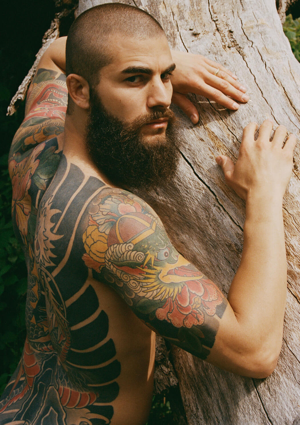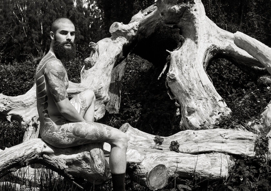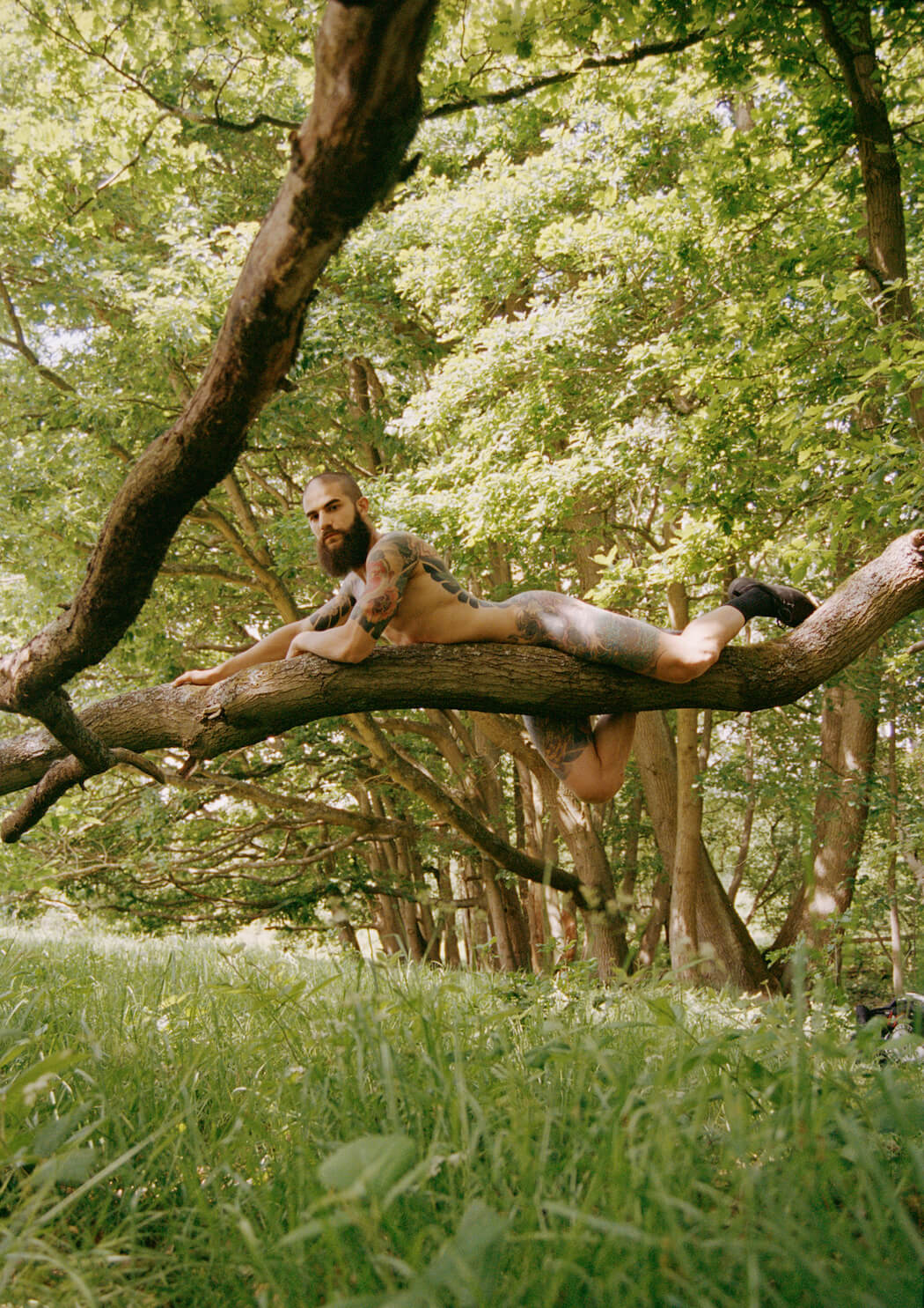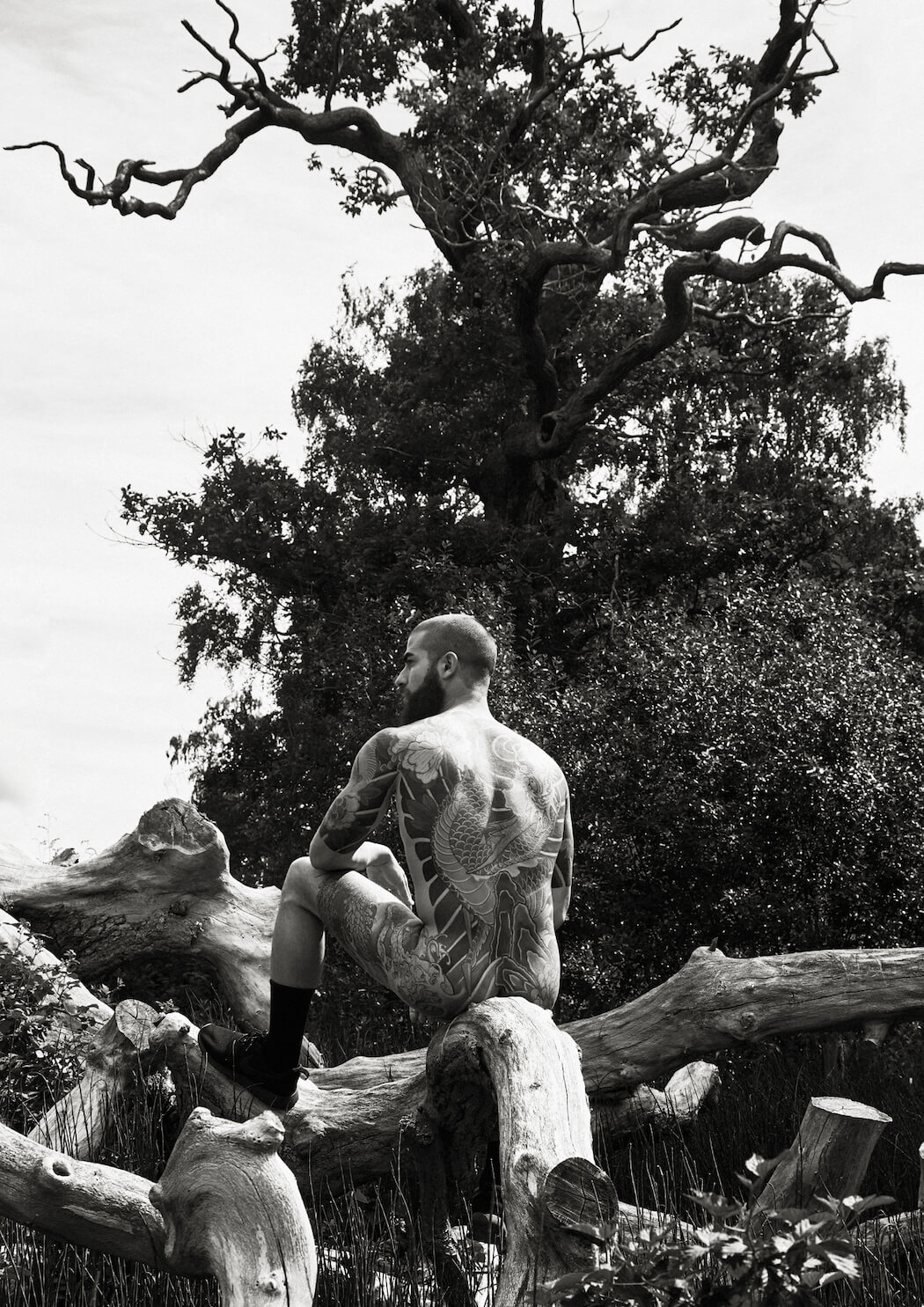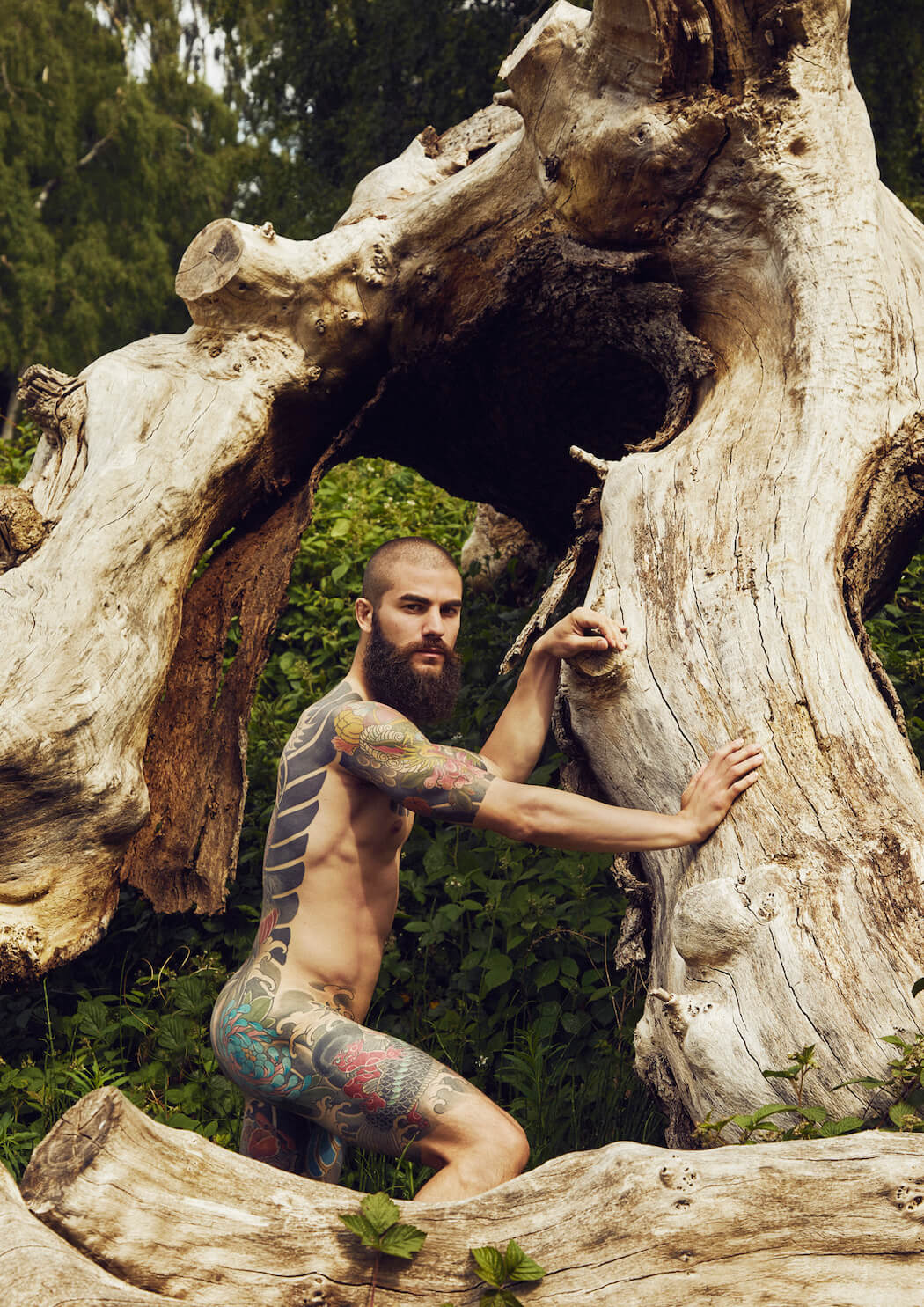 A KALTBLUT exclusive. Photography by Eddie Blagbrough. Model is Antonio (Tony) Vacca. “I’m Eddie and I’m a photographer based in London. I shoot mostly portraits and menswear fashion. During the lockdown, there was no way of shooting any fashion as the PR offices were closed. If I wanted to shoot then I would’ve had to come up with a different way of shooting. As soon as we were allowed to visit someone else outside I decided to do a socially distanced shoot with Tony Vacca with only his snakes. Tony is a chef and has been furloughed while restaurants remain closed. He models part-time and he also trains in martial arts, which is how he achieved his physique. His wife is a performer and together they own 8 snakes, which are used in the performances. Together with his snakes, I wanted to showcase Tony and his amazing tattoos outdoors in nature!”