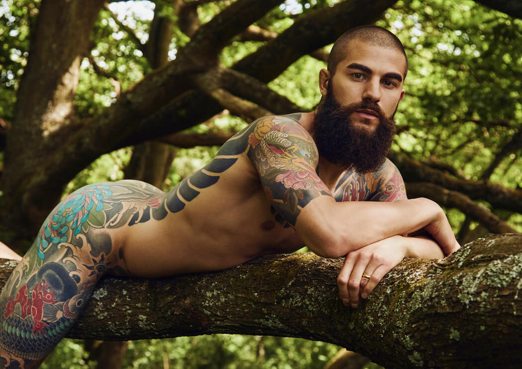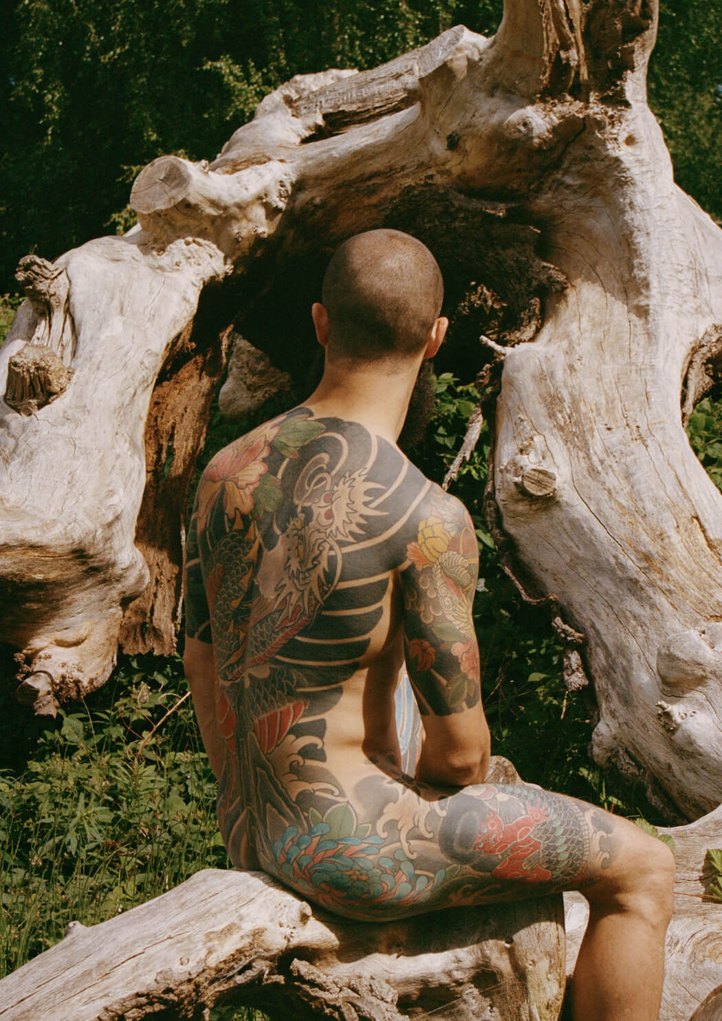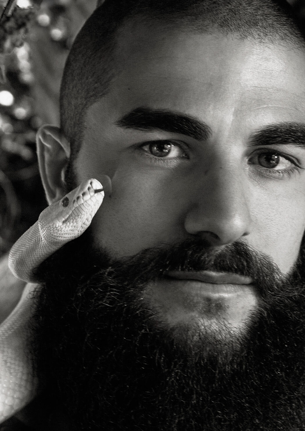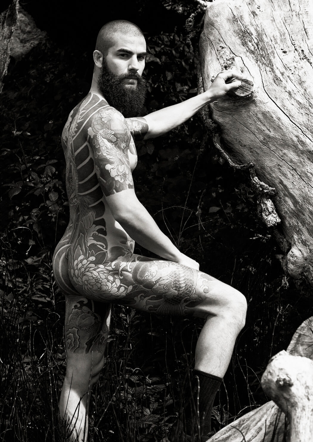 A KALTBLUT exclusive. Photography by Eddie Blagbrough. Model is Antonio (Tony) Vacca. “I’m Eddie and I’m a photographer based in London. I shoot mostly portraits and menswear fashion. During the lockdown, there was no way of shooting any fashion as the PR offices were closed. If I wanted to shoot then I would’ve had to come up with a different way of shooting. As soon as we were allowed to visit someone else outside I decided to do a socially distanced shoot with Tony Vacca with only his snakes. Tony is a chef and has been furloughed while restaurants remain closed. He models part-time and he also trains in martial arts, which is how he achieved his physique. His wife is a performer and together they own 8 snakes, which are used in the performances. Together with his snakes, I wanted to showcase Tony and his amazing tattoos outdoors in nature!”