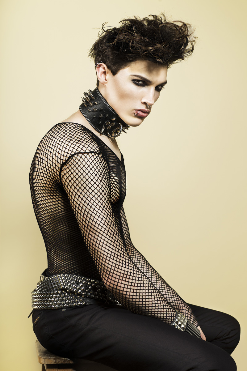 The Goth Guy: Net/Mesh top- Beautiful Freak, Trousers- Nudie, Rivet Belt 1- Jimmy Choo for HM, Rivet Belt 2- The Stylist wardrobe, Rivet Collar- The Stylists wardrobe, Rivet bracelet- Camden Stable Market, Silver brick bracelet- Mango