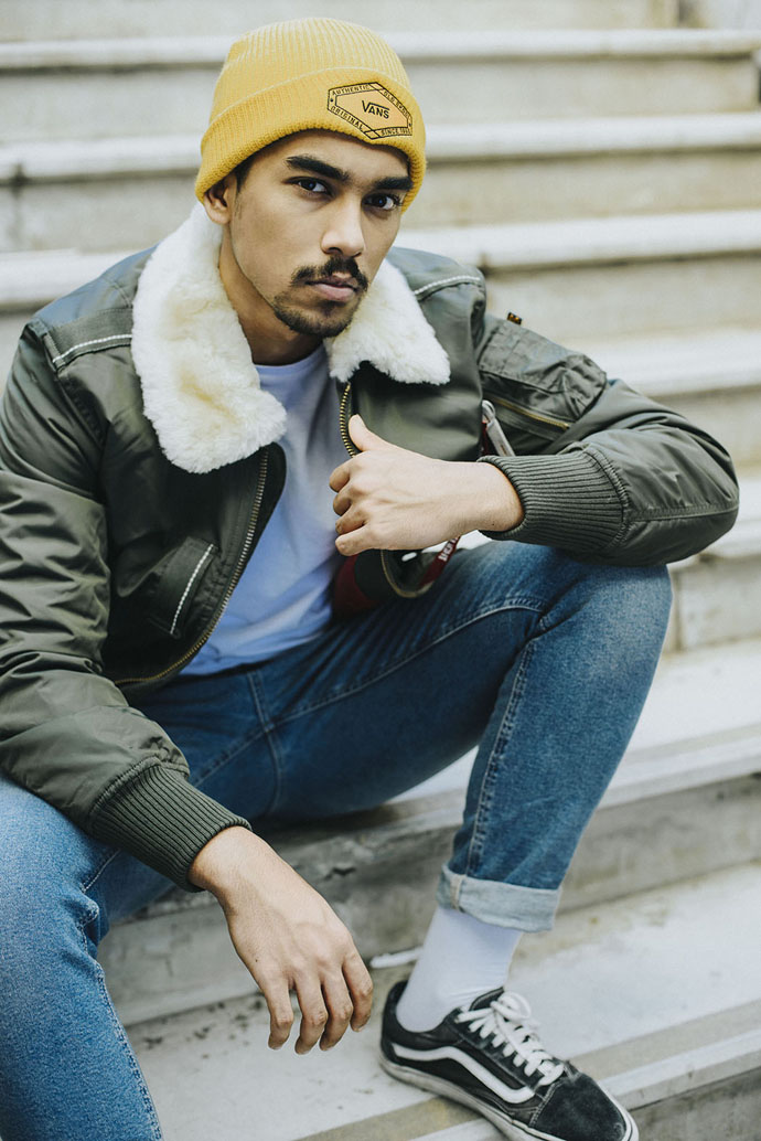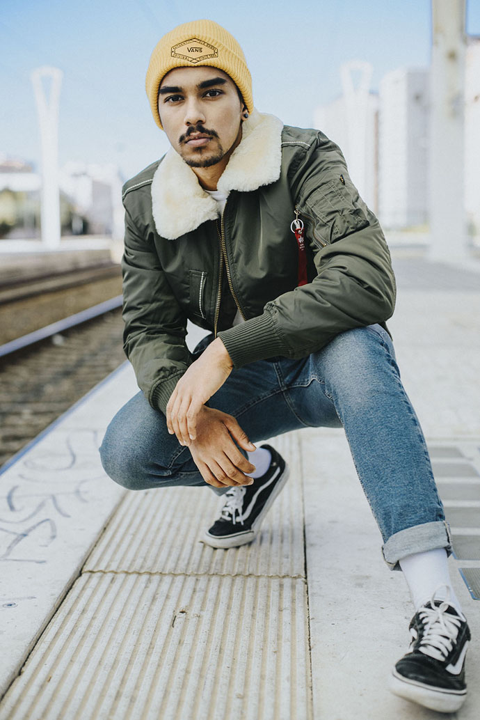 A KALTBLUT exclusive menswear editorial. Photography by Inês Machado. Model is Ziyad signed at Onway Models. Make up & Styling by Cláudia Galapito using fashion by Alpha Industries, Vans, Son of a Gun, H&M, Zara, Pull & Bear amongst others.