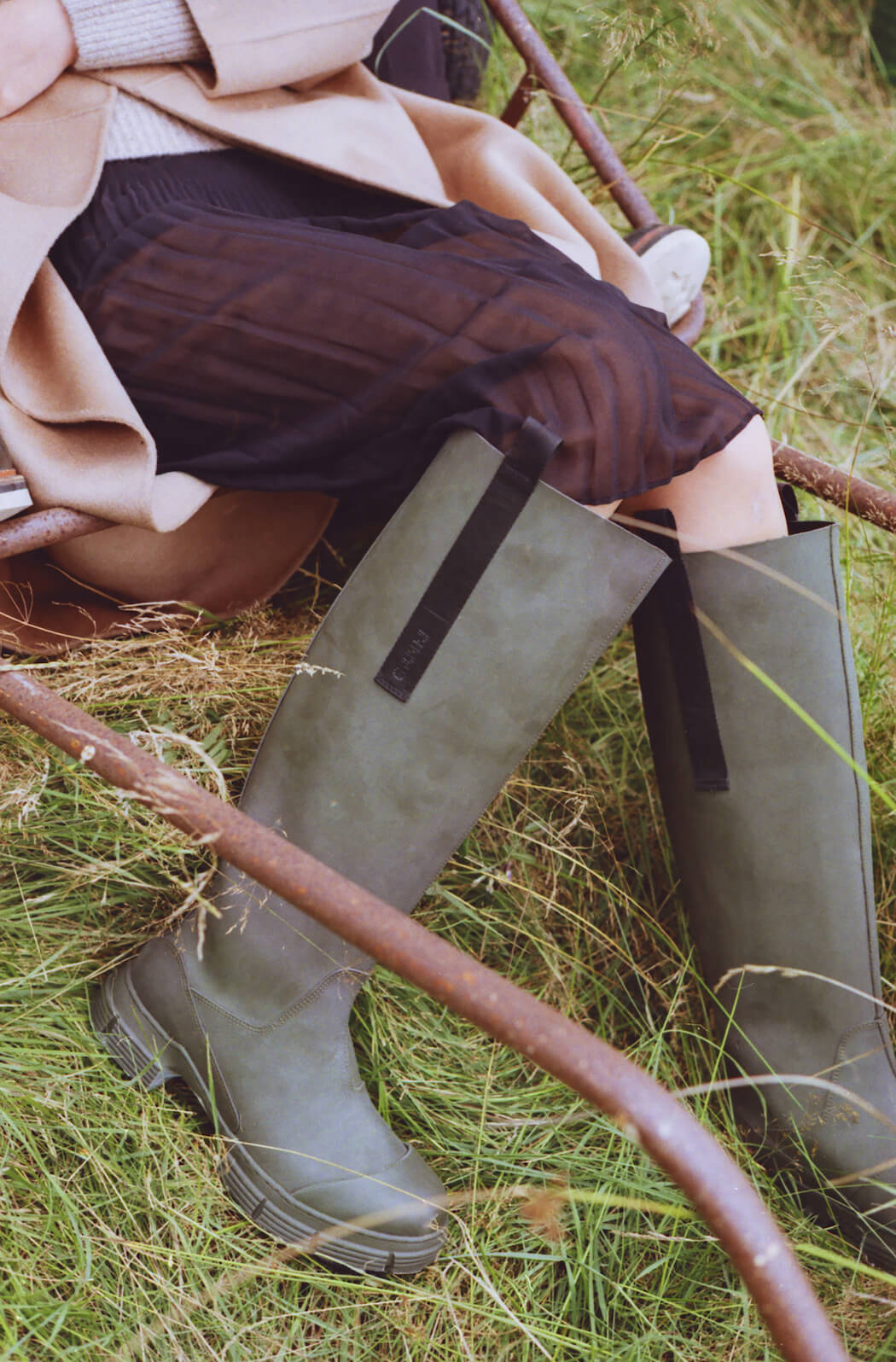 Wrap overdress: Ganni Turtleneck: Vintage Miu Miu Cardigan: Selected Femme Boots: Ganni