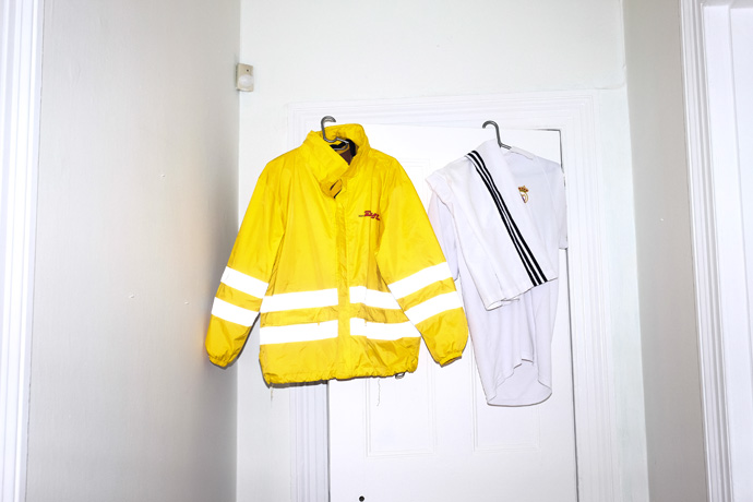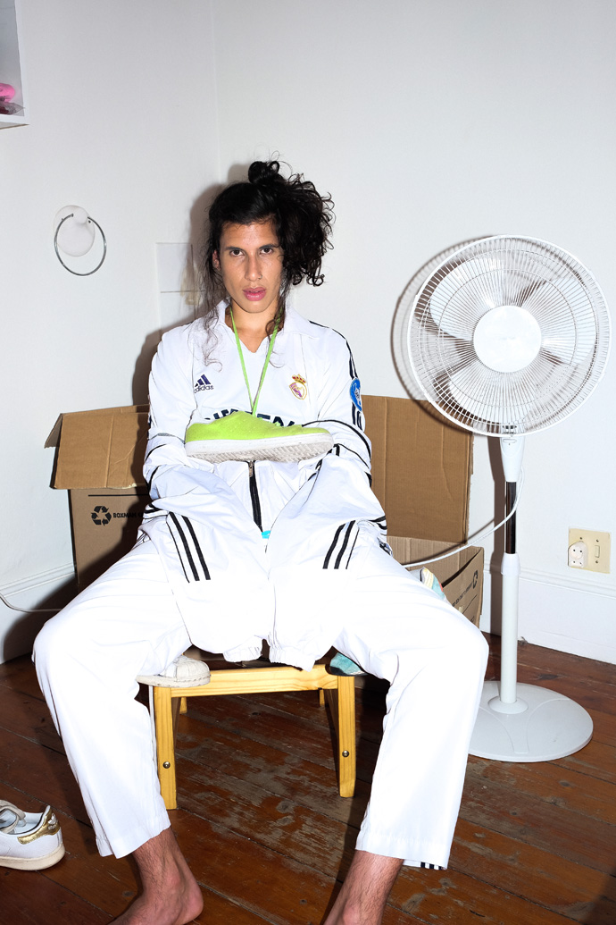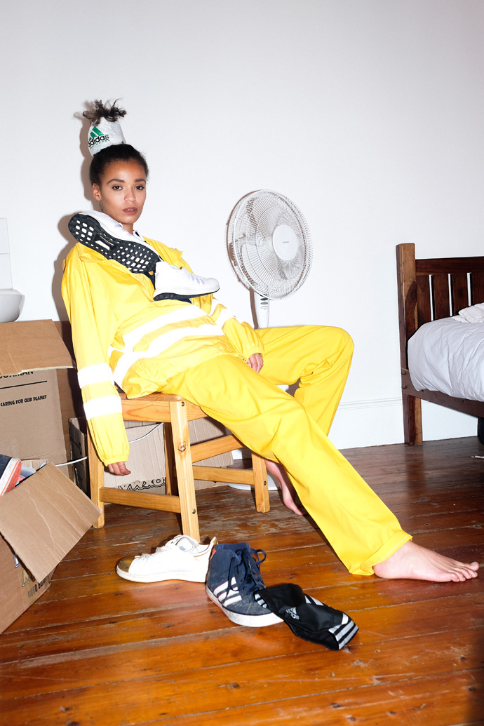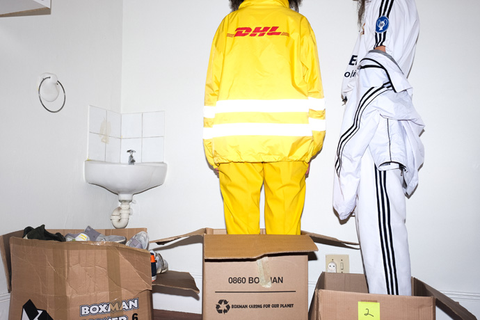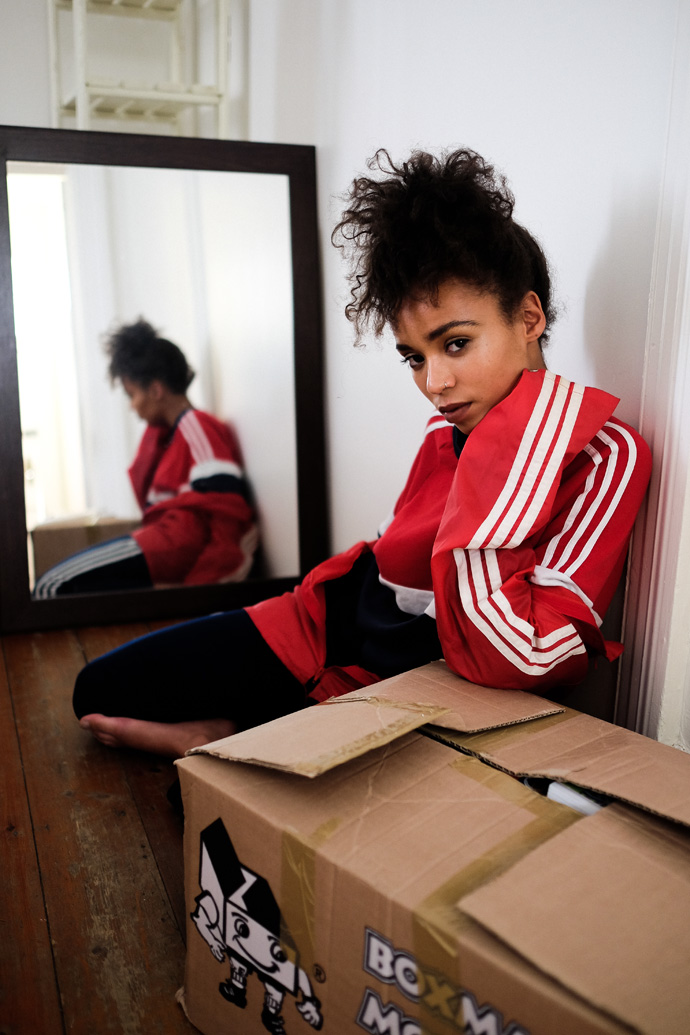 “Sports luxe garments conventionally allow for the wearer of these garments the ability to move freely and actively whilst simultaneously embodying a clean and edgy style. In choosing to style the shoot with these garments and place the boxes from my bedroom within the frames, my aim was to not only comment on the intersection between sportswear and style, but to entice the viewers of the images to think about the multiple ways in which we move, be this the shifting of our personal spaces or the fluidity of our bodies. The Vetements-inspired DHL jacket, complimented by the all-white Adidas tracksuit, further highlighted the concept of movement.