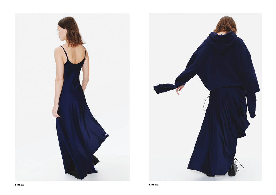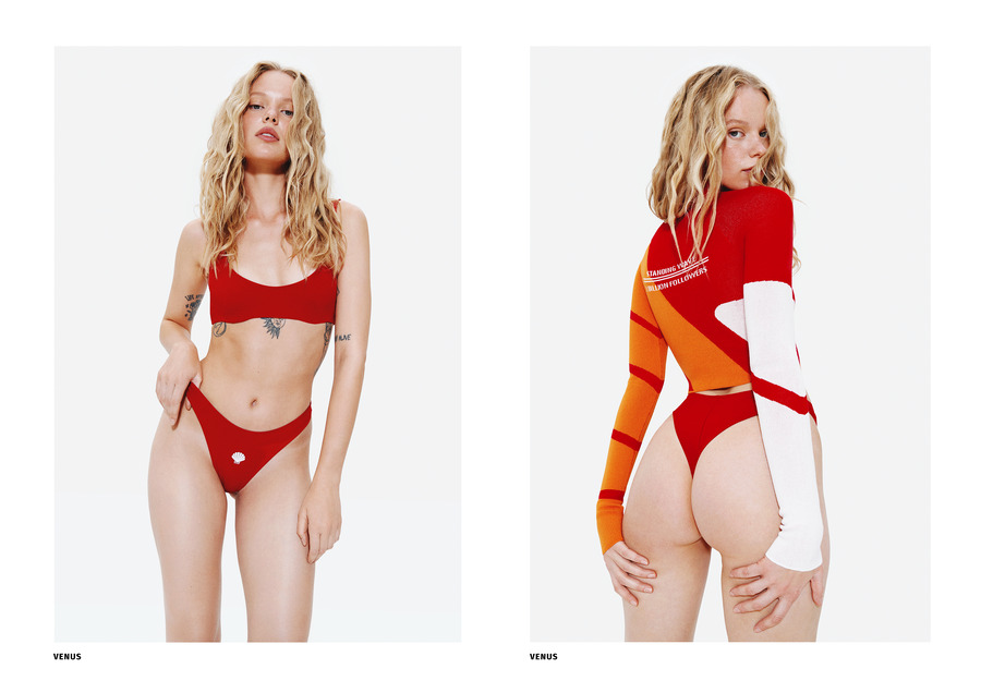 The silhouettes are exactly what you would expect from a TTSWTRS collection. A portion of the designs fit like a second skin; bodysuits, bike shorts, bra tops, and catsuits. The remaining portion is oversized; t-shirts, denim shorts and jacket sets, sweaters and hoodies. Unique styles to this collection are the Siren silk dress and Sleep Wɐlker robe.