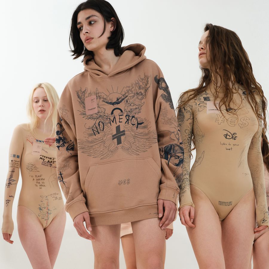 TTSWTRS (which stands for TATTOOSWEATERS) is a00 Ukrainian-based brand that was created back in 2013 as a creative project of designer Anna Osmekhina, a former costume designer and stylist.. Brand’s DNA is the abundance of beige imitating naked skin, basic colours, and tattoos. Anna Osmekhina works with emerging and established global tattoo artists to create the designs on the apparel. Grimes, Nina Kravitz, Irina Shayk, Kourtney Kardashian, Sita Abellan, Nicky Minaj, Lisa Owen, Tommy Cash, Lena Perminova, and many others wear TTSWTRS. Such magazines as Forbes, Dazed, Metal Magazine, Hypebae and many others wrote about the brand.