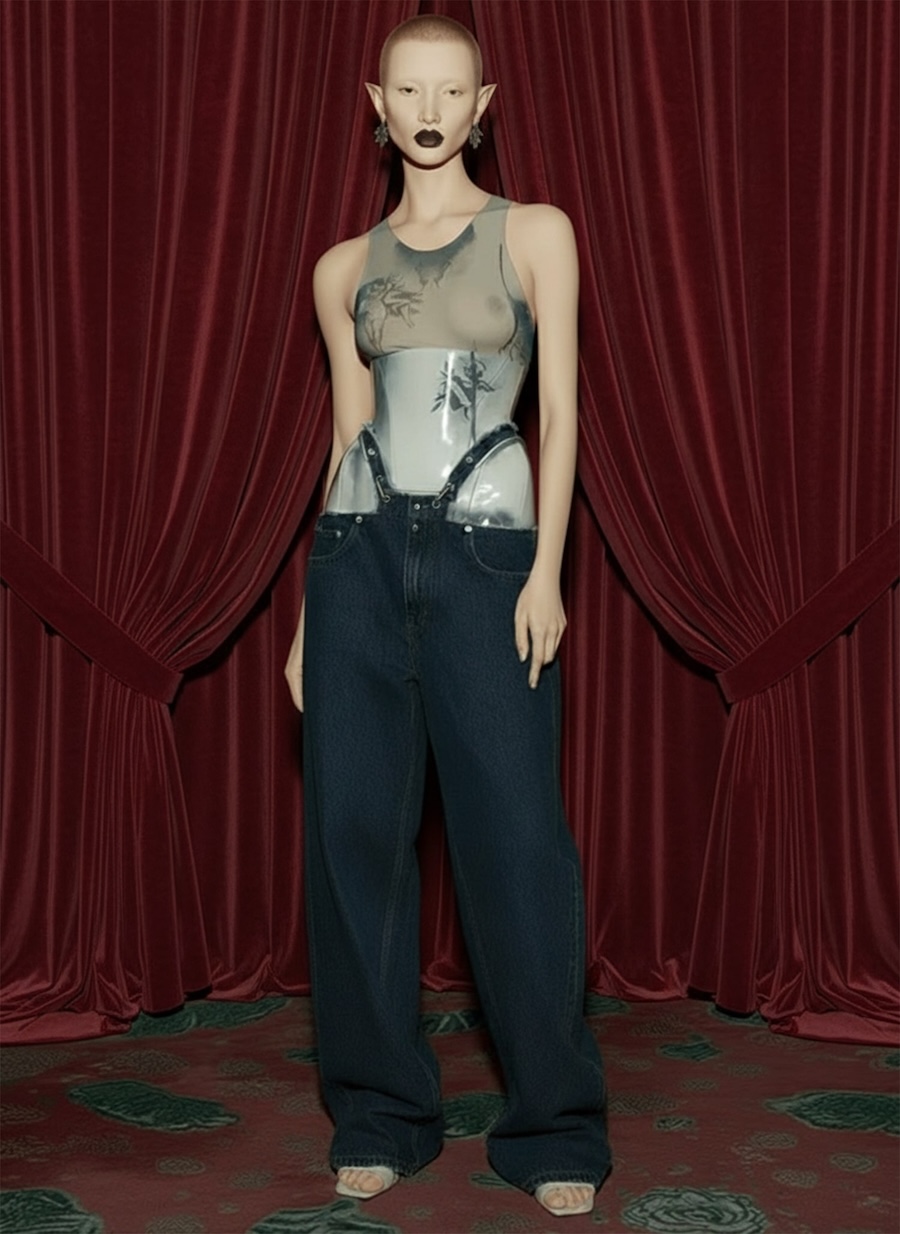 Among the eleven pieces available for purchase, highlights include the transparent Melted bodysuit with voluminous polyurethane embellishments; Skin Couture jeans with adjustable carabiners and zippers for customizable fit; and the Vintage Tattoo jumpsuit adorned with lifelike prints and hand-applied crystals. The collection also showcases the Blur Ink ensemble of corset, top, and pants, the ethereal Aura dress, and the intricate Metamorph fringe dress, which exhibits a waterfall effect with pioneering print techniques.