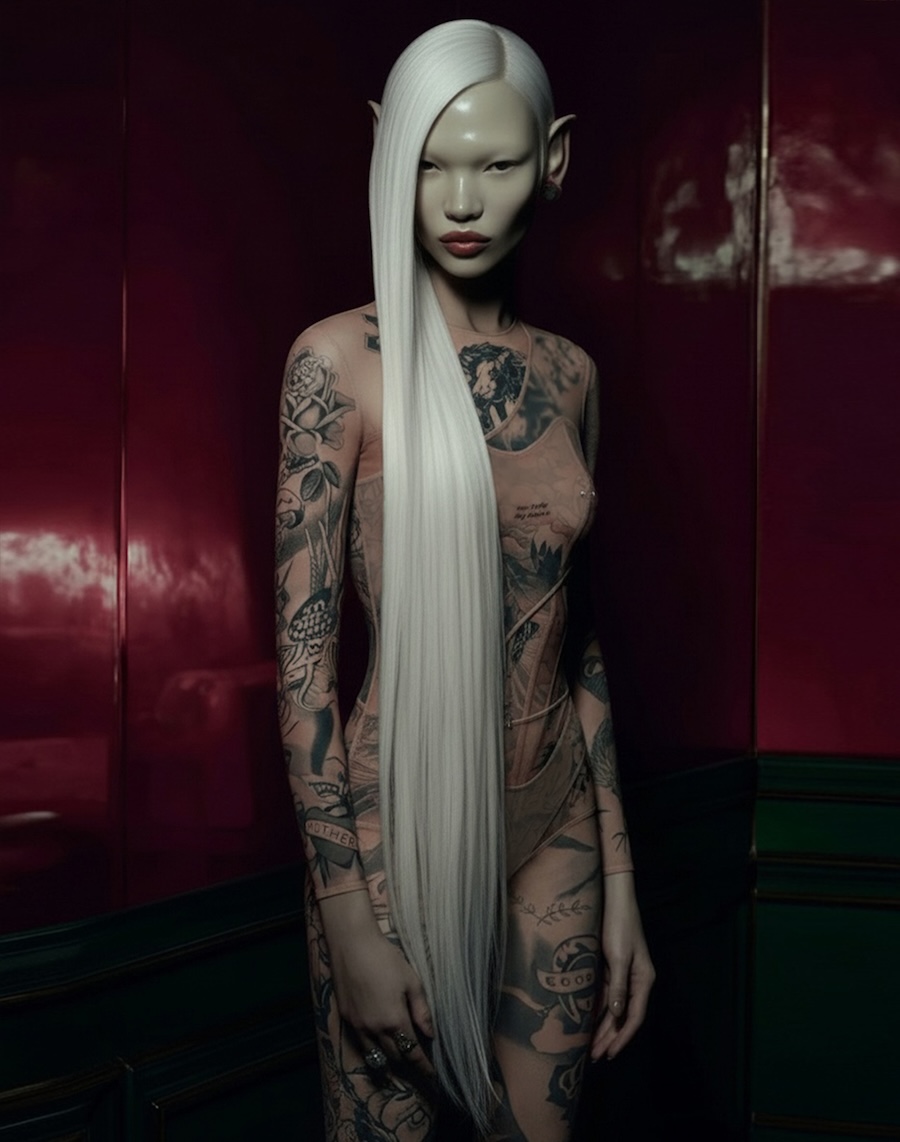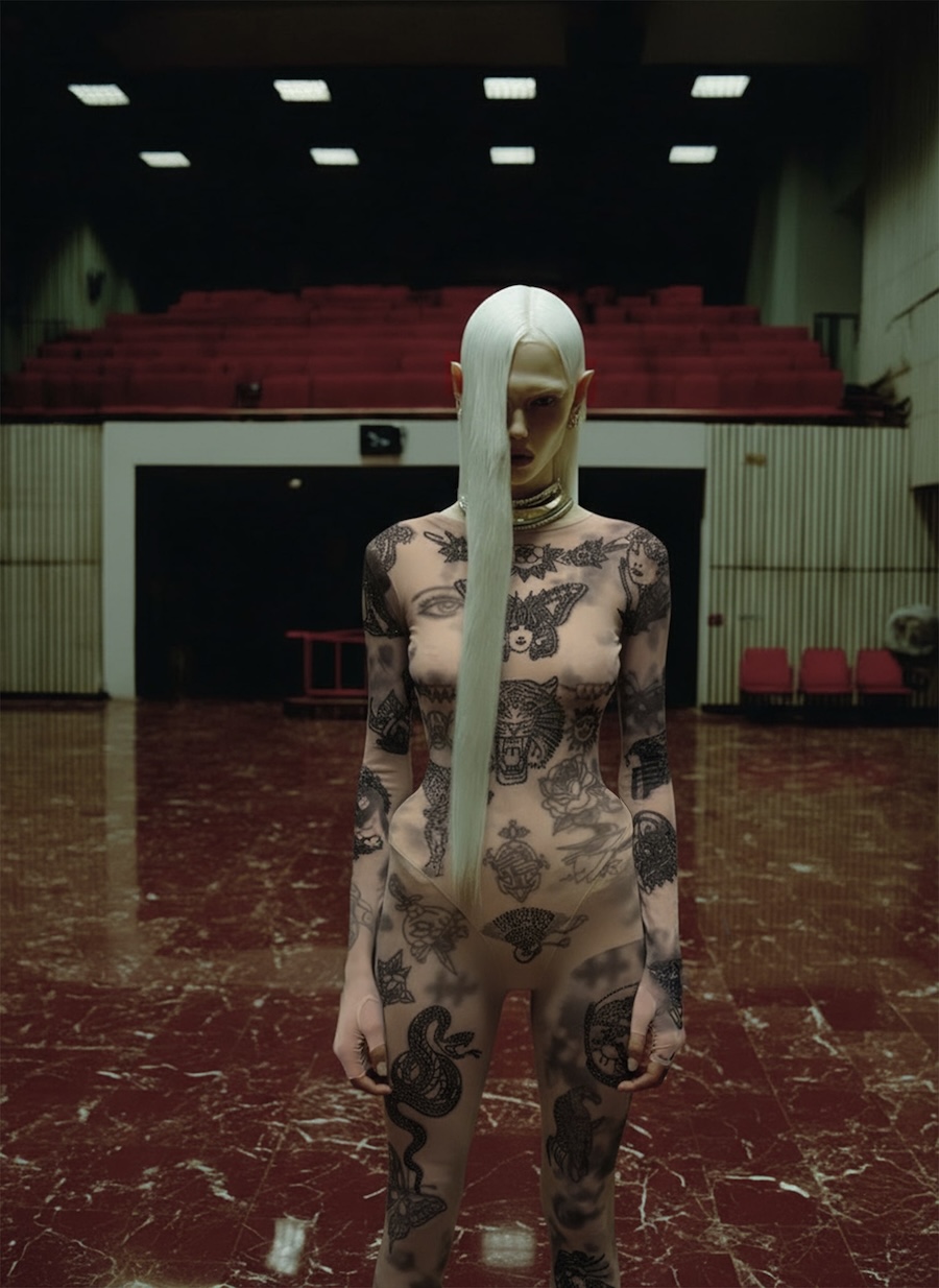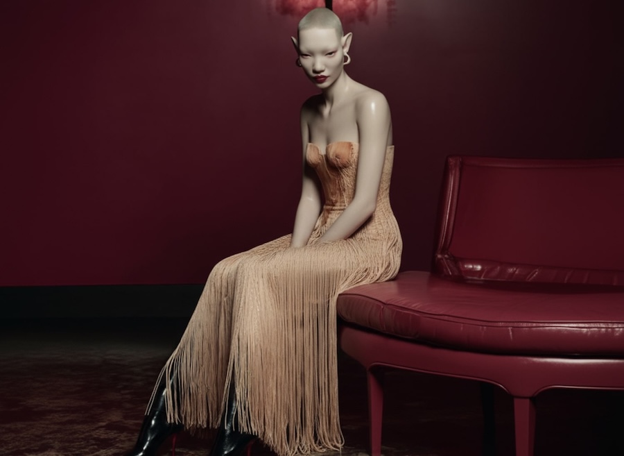Among the eleven pieces available for purchase, highlights include the transparent Melted bodysuit with voluminous polyurethane embellishments; Skin Couture jeans with adjustable carabiners and zippers for customizable fit; and the Vintage Tattoo jumpsuit adorned with lifelike prints and hand-applied crystals. The collection also showcases the Blur Ink ensemble of corset, top, and pants, the ethereal Aura dress, and the intricate Metamorph fringe dress, which exhibits a waterfall effect with pioneering print techniques.