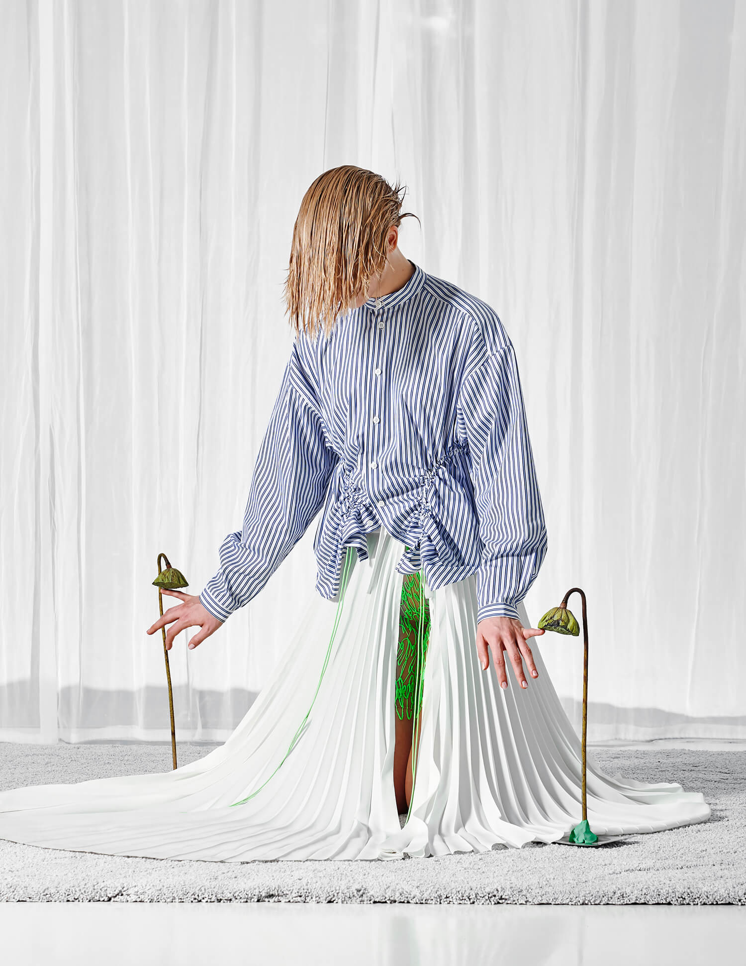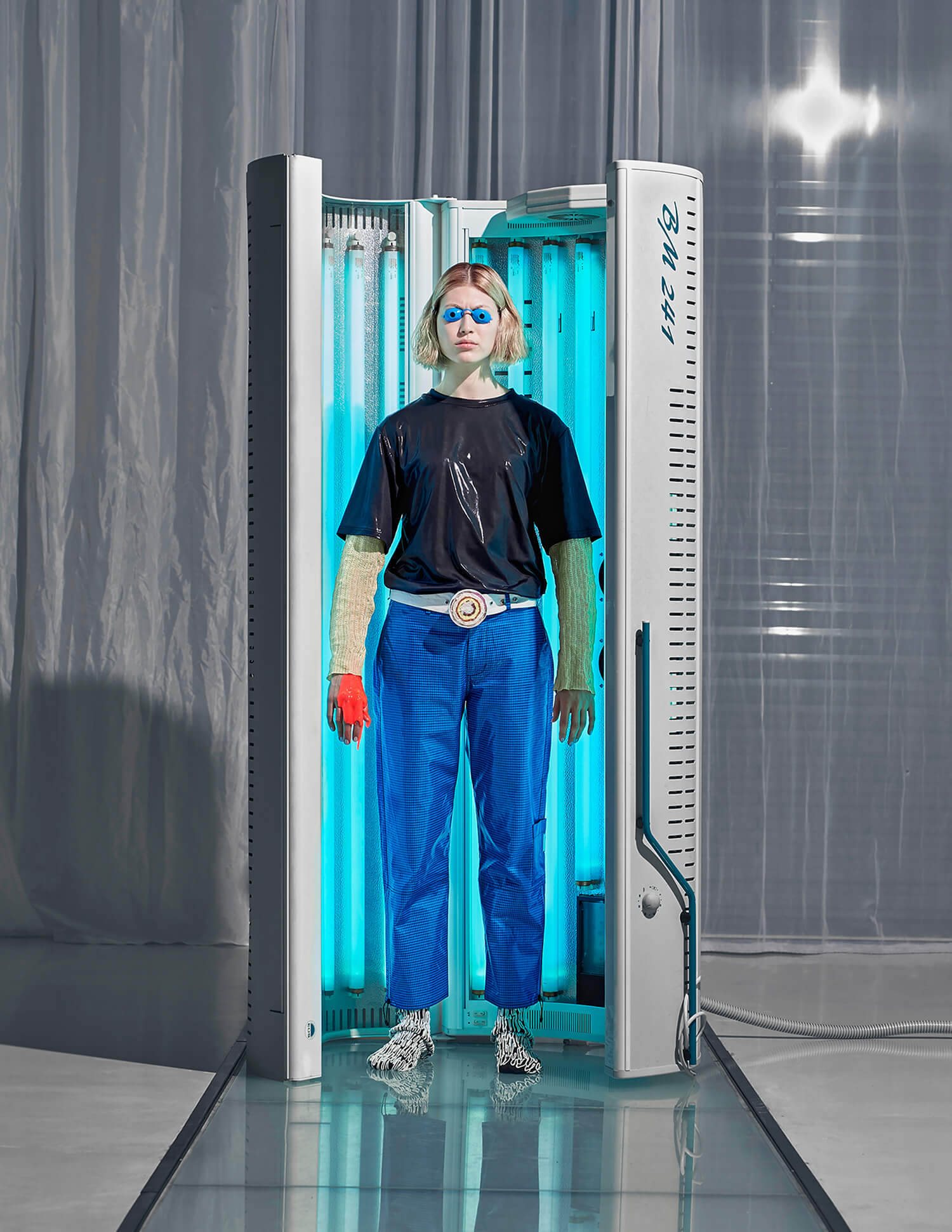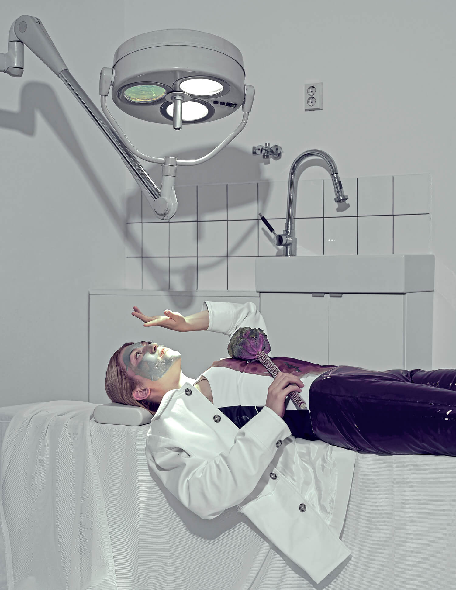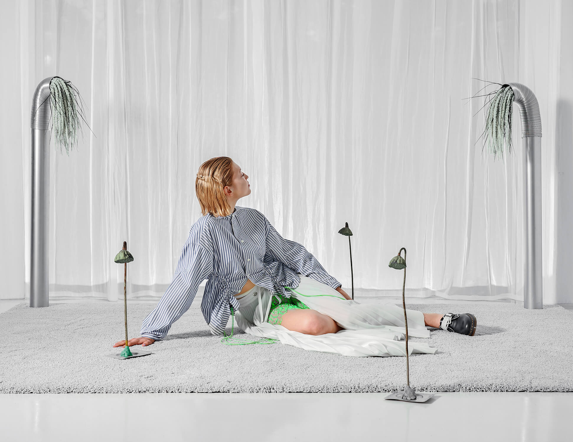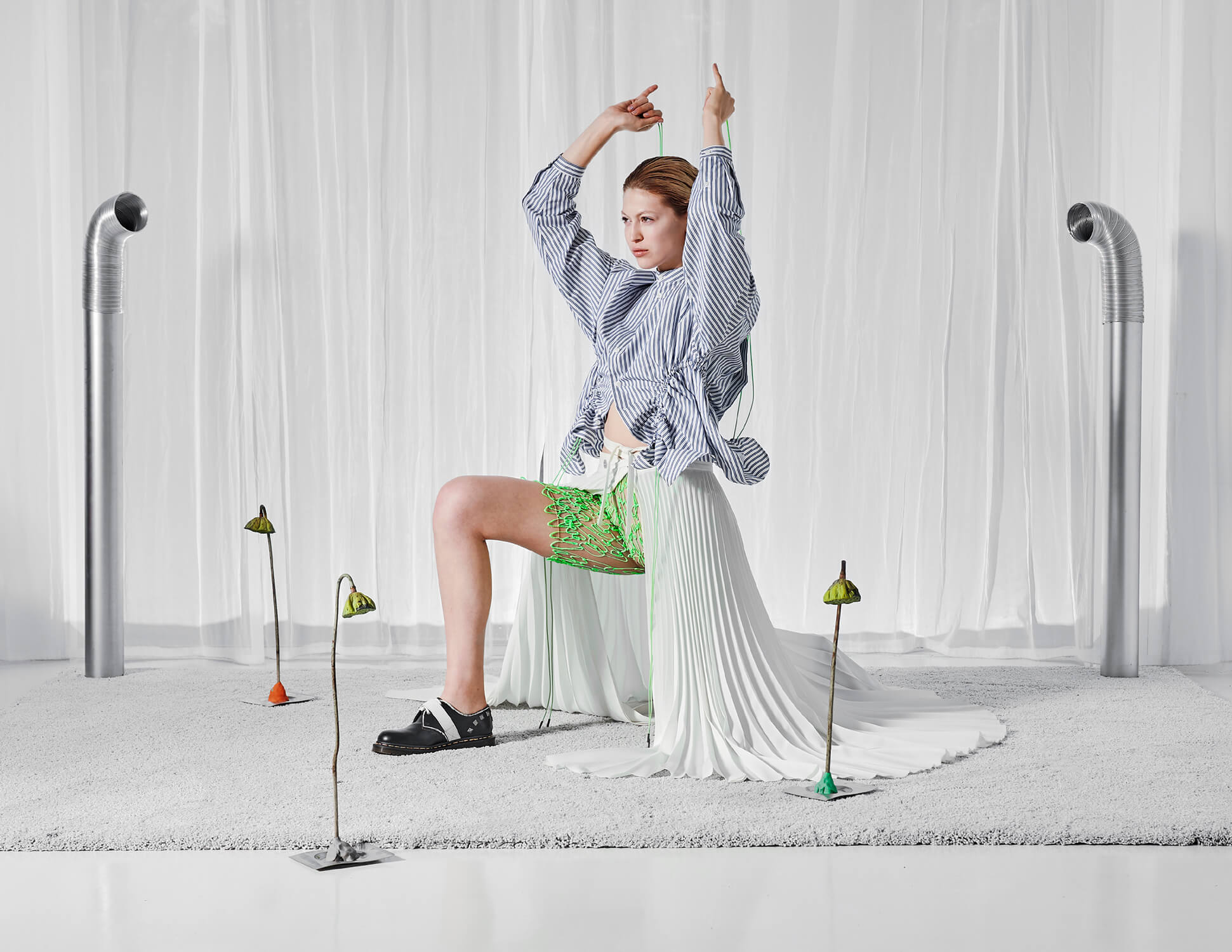 A KALTBLUT exclusive. Photo & Video by Maxim Egorov. Model is Sophie Freund from SMC Model Management. Styled by Anina Wolff. Hair & Make up by Claudia Fischer. Set design by Marcus Vinicius de Queiroz. Location: Bridge Studios Berlin. Fashion by Anina Wolff, A.W.A.K.E. Mode, Dr. Martens, Gentle Monster, Hope, Kasia Kucharska, MSGM, Our Legacy, Pinko, Rabens Saloner, Schepperheyn.