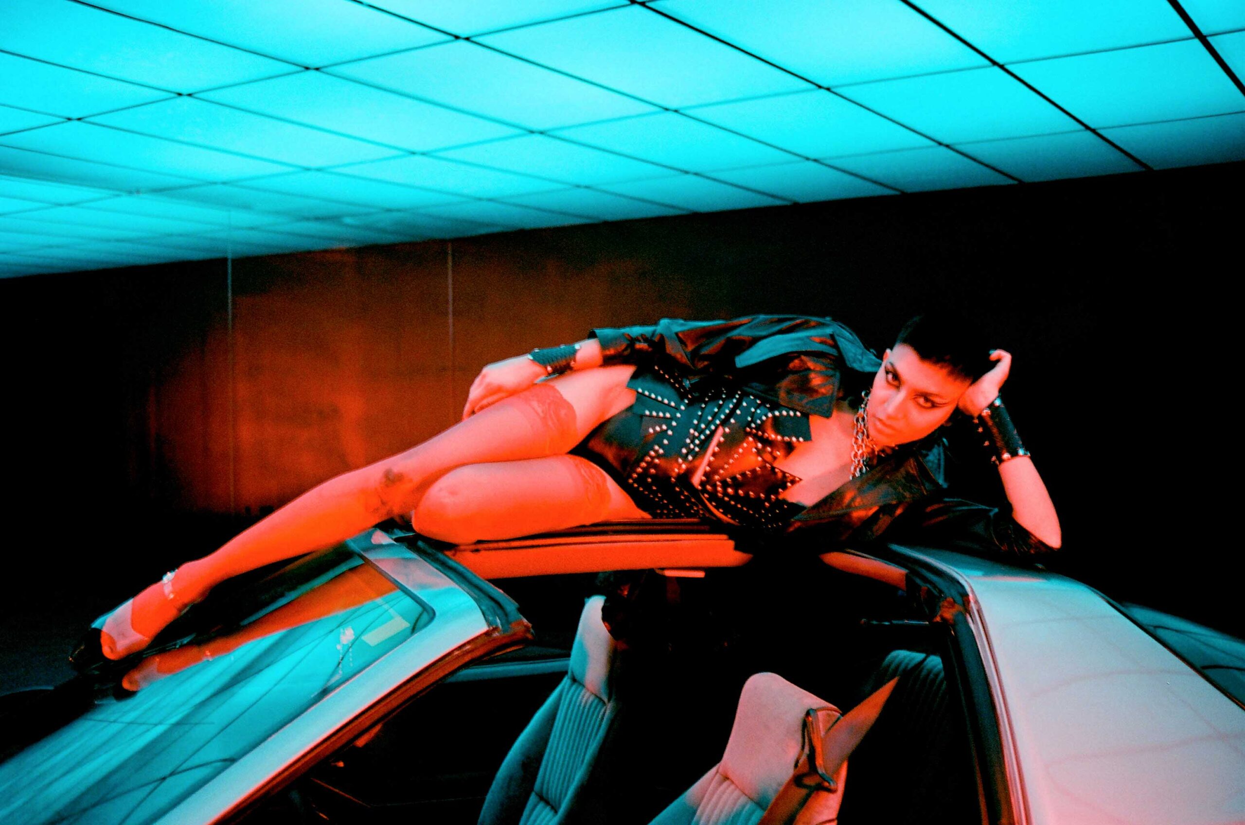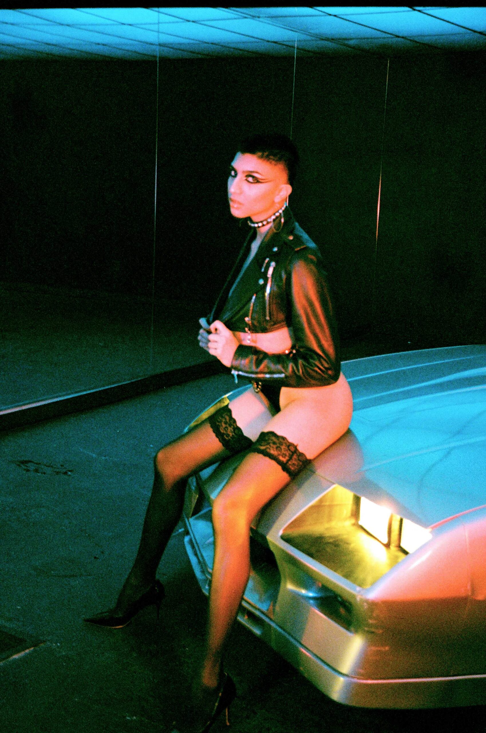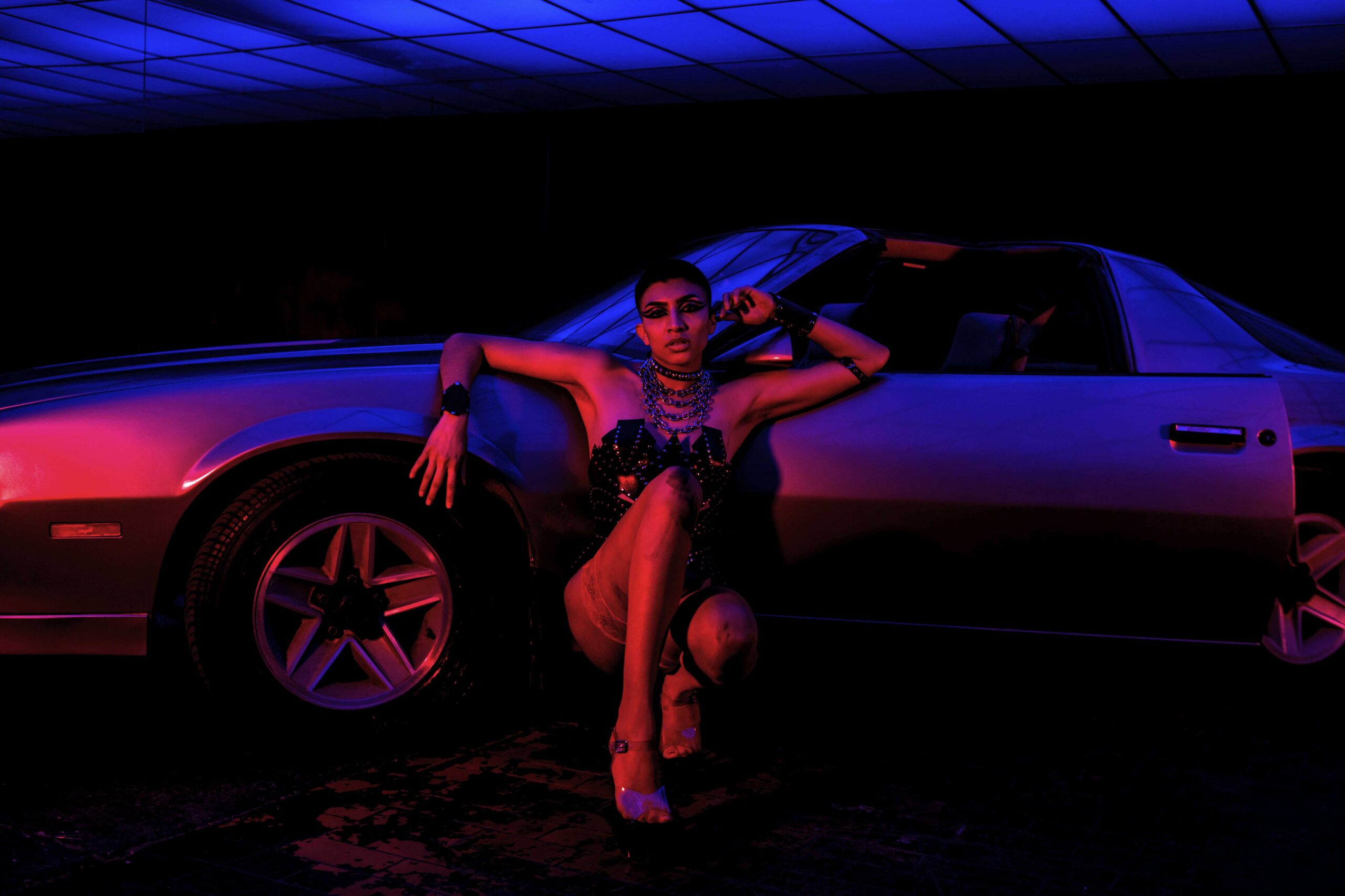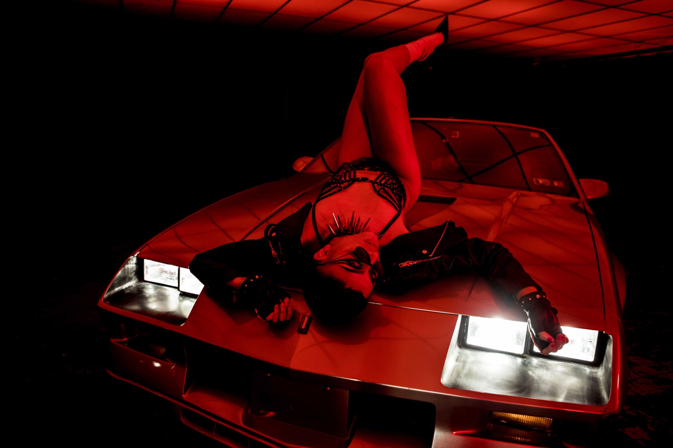 A nostalgic homage to the 1980s, inspired by the iconic heavy metal scene and its rebellious attitude. Leather fashion and empowering armours, strong contrast and extreme saturation, are inspired by the dark ambience of classic horror while simultaneously adding a sensual twist. Model, Alex Beltran, drives the dominating essence of the unapologetic spirit of the 80s straight into the psyche of the viewer. Studded leather and the steel of an ’83 Camaro transports us to the indulgent sensations of that decade.