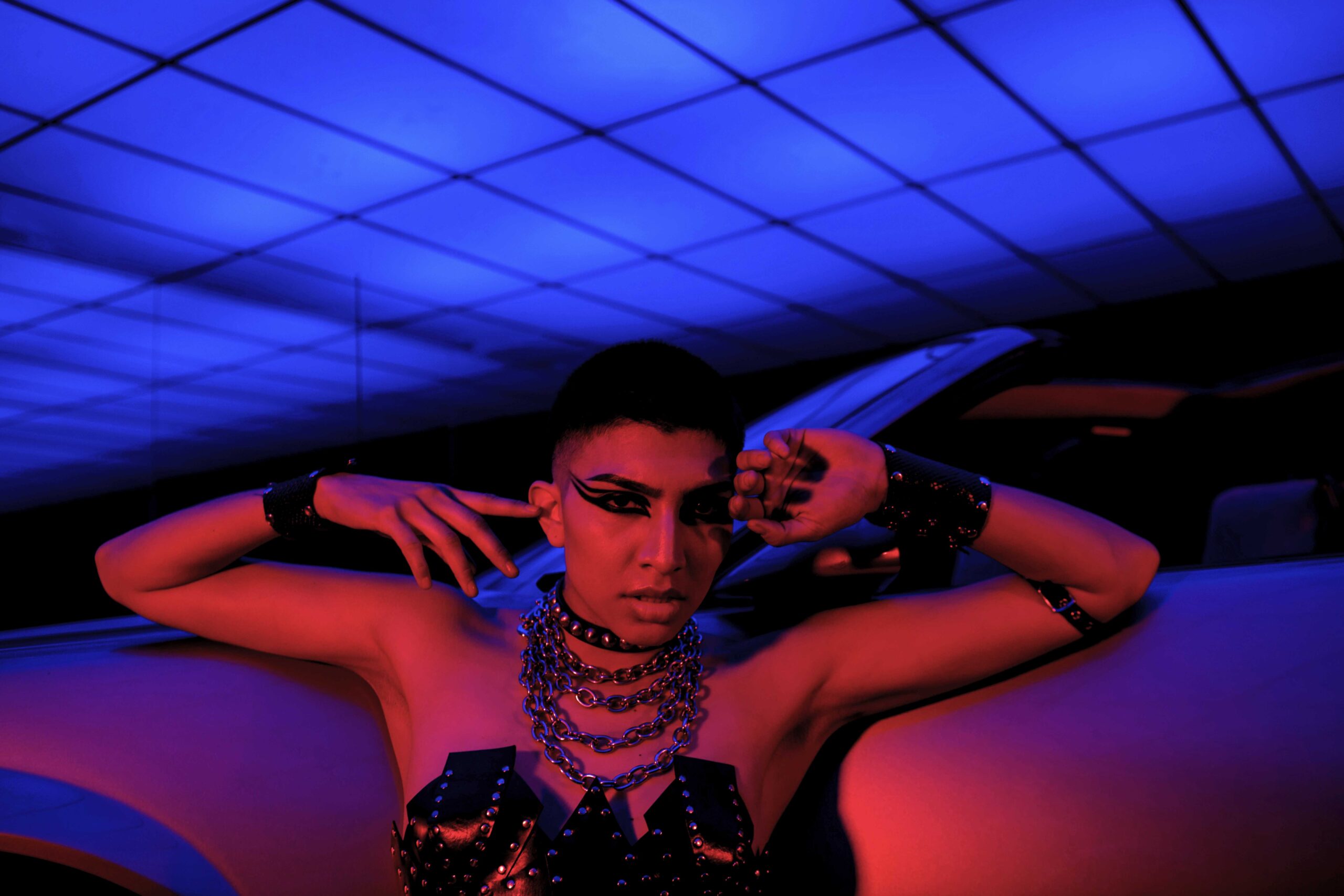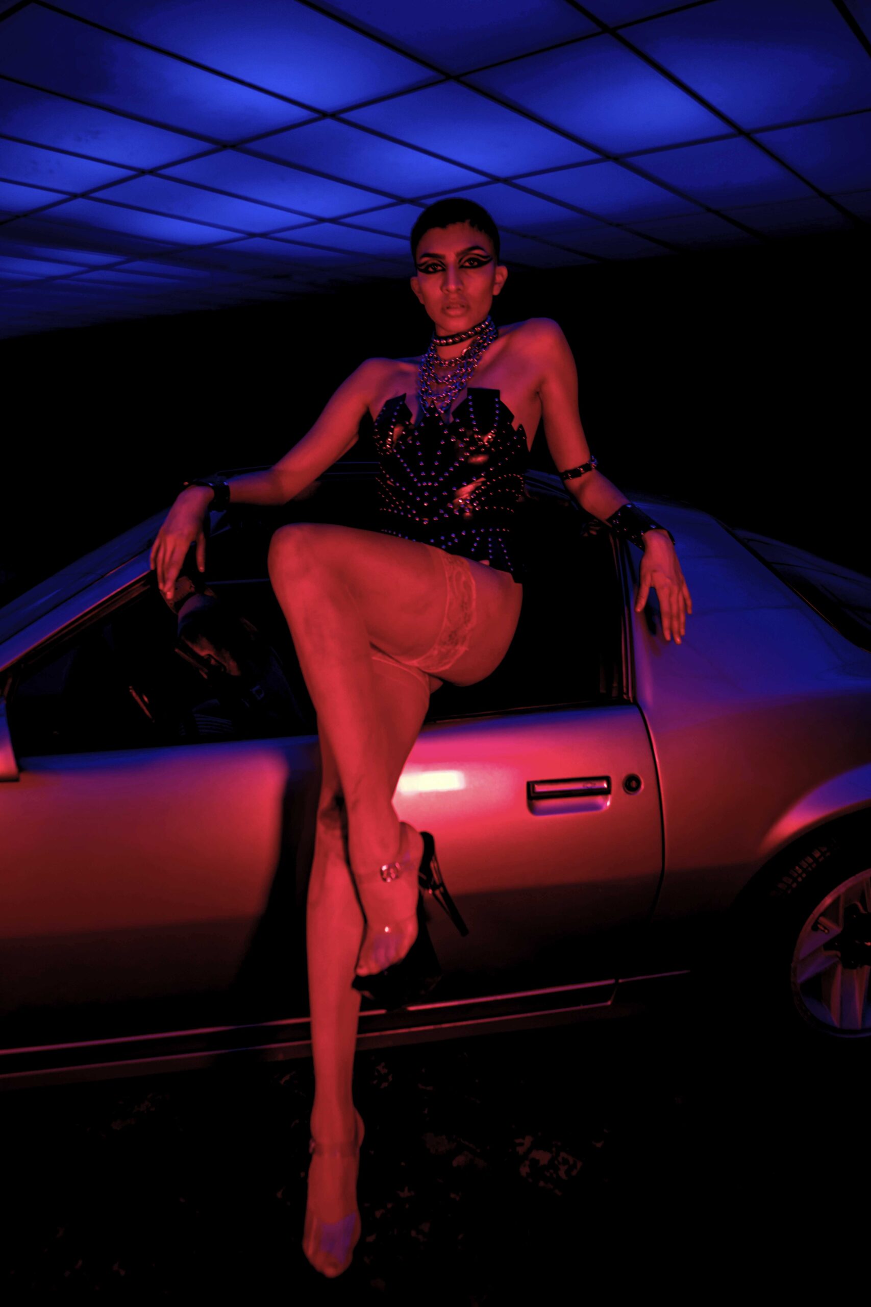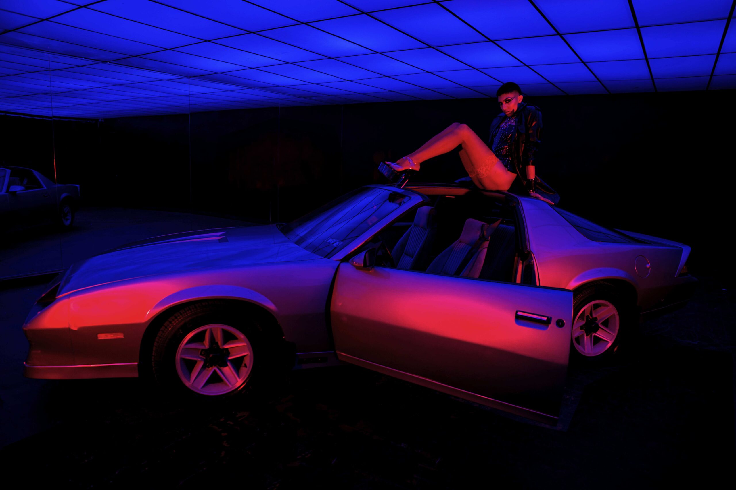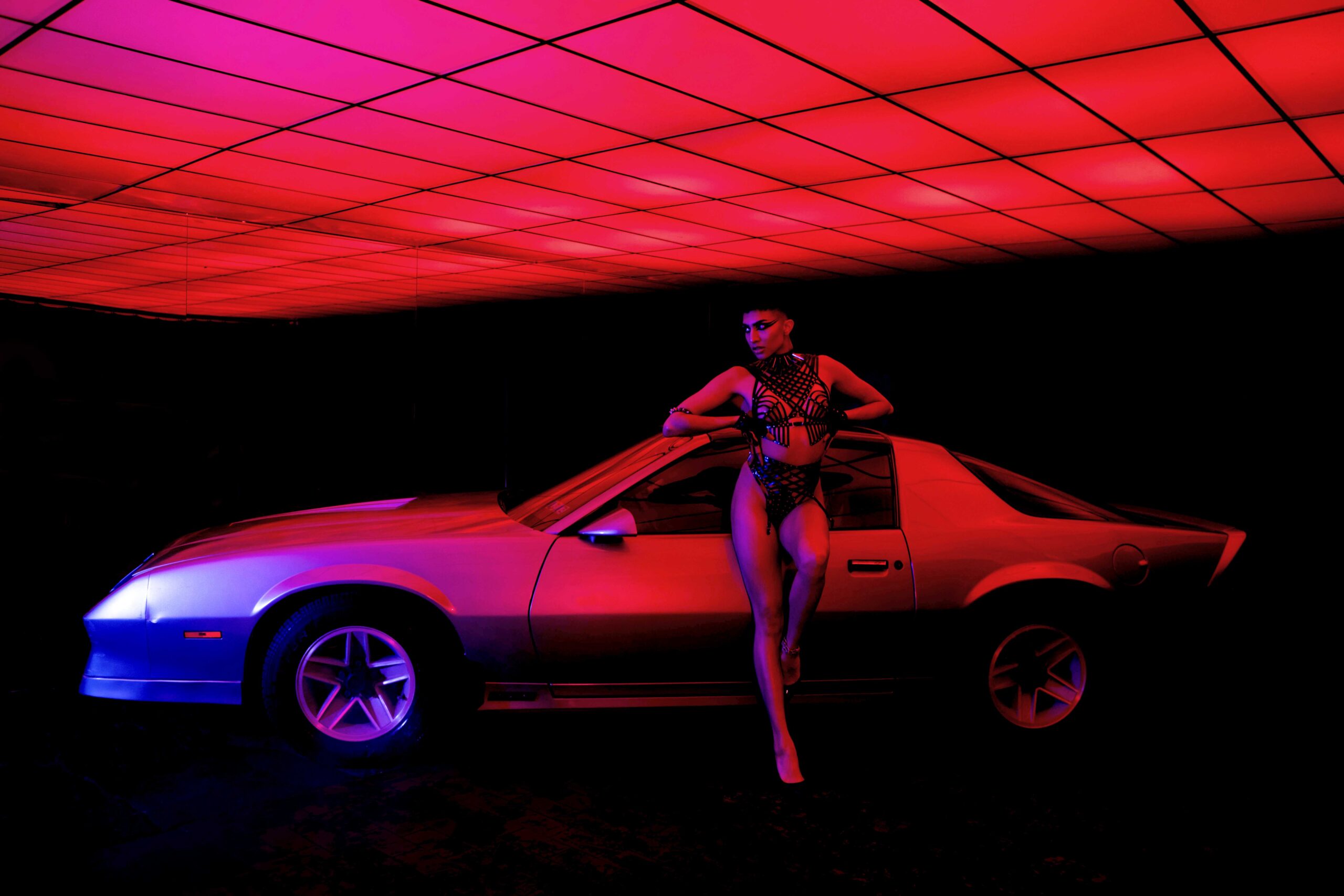 A nostalgic homage to the 1980s, inspired by the iconic heavy metal scene and its rebellious attitude. Leather fashion and empowering armours, strong contrast and extreme saturation, are inspired by the dark ambience of classic horror while simultaneously adding a sensual twist. Model, Alex Beltran, drives the dominating essence of the unapologetic spirit of the 80s straight into the psyche of the viewer. Studded leather and the steel of an ’83 Camaro transports us to the indulgent sensations of that decade.