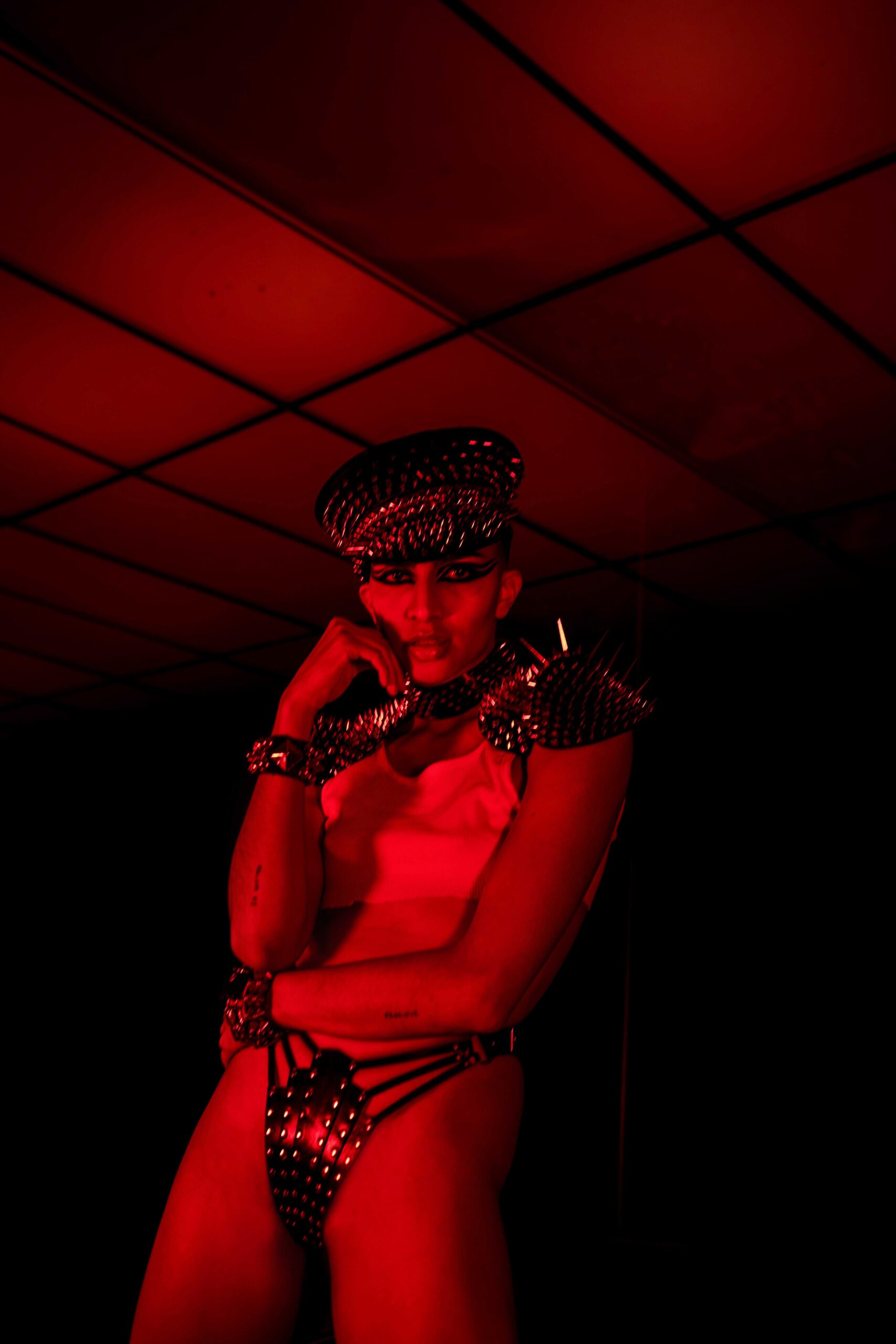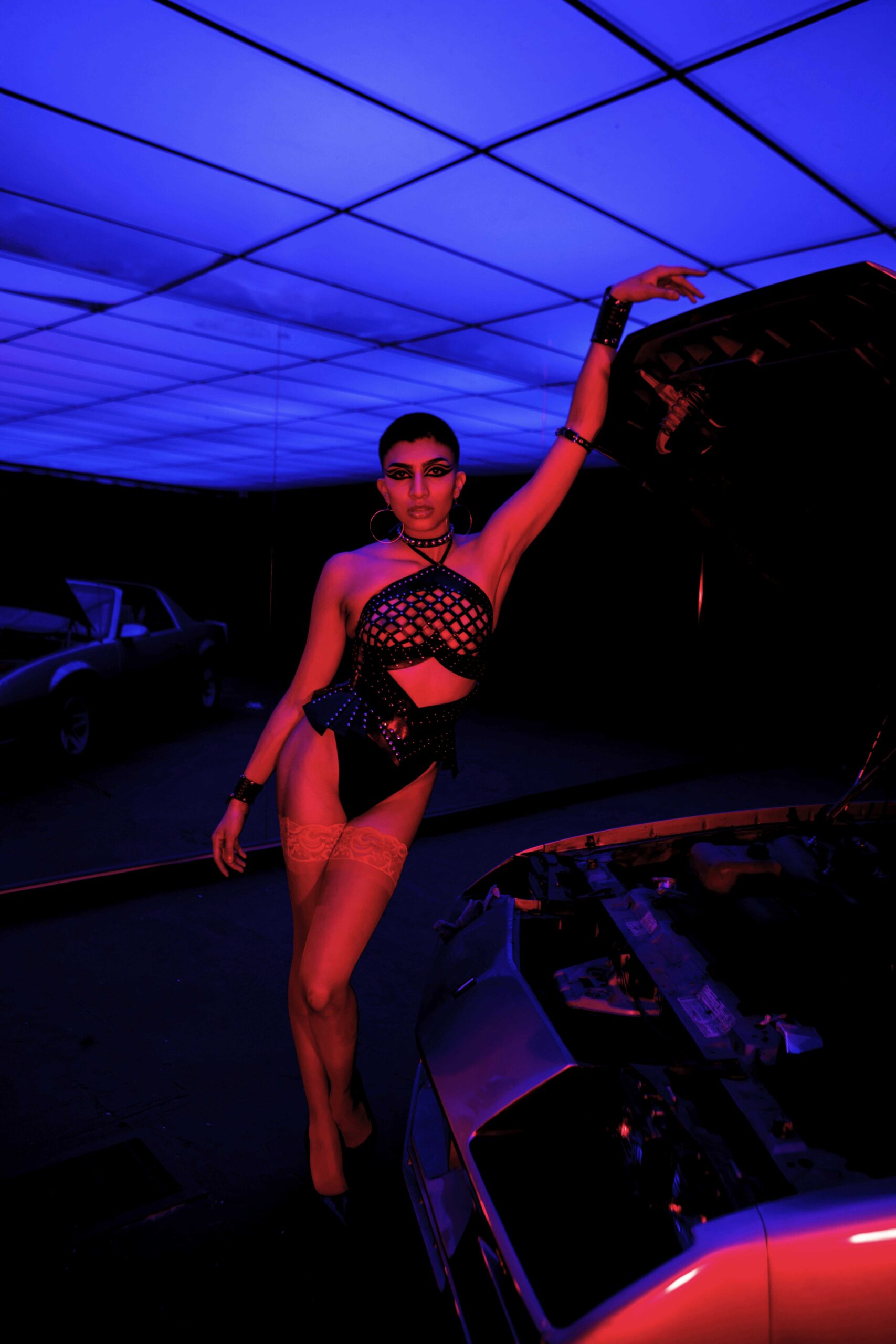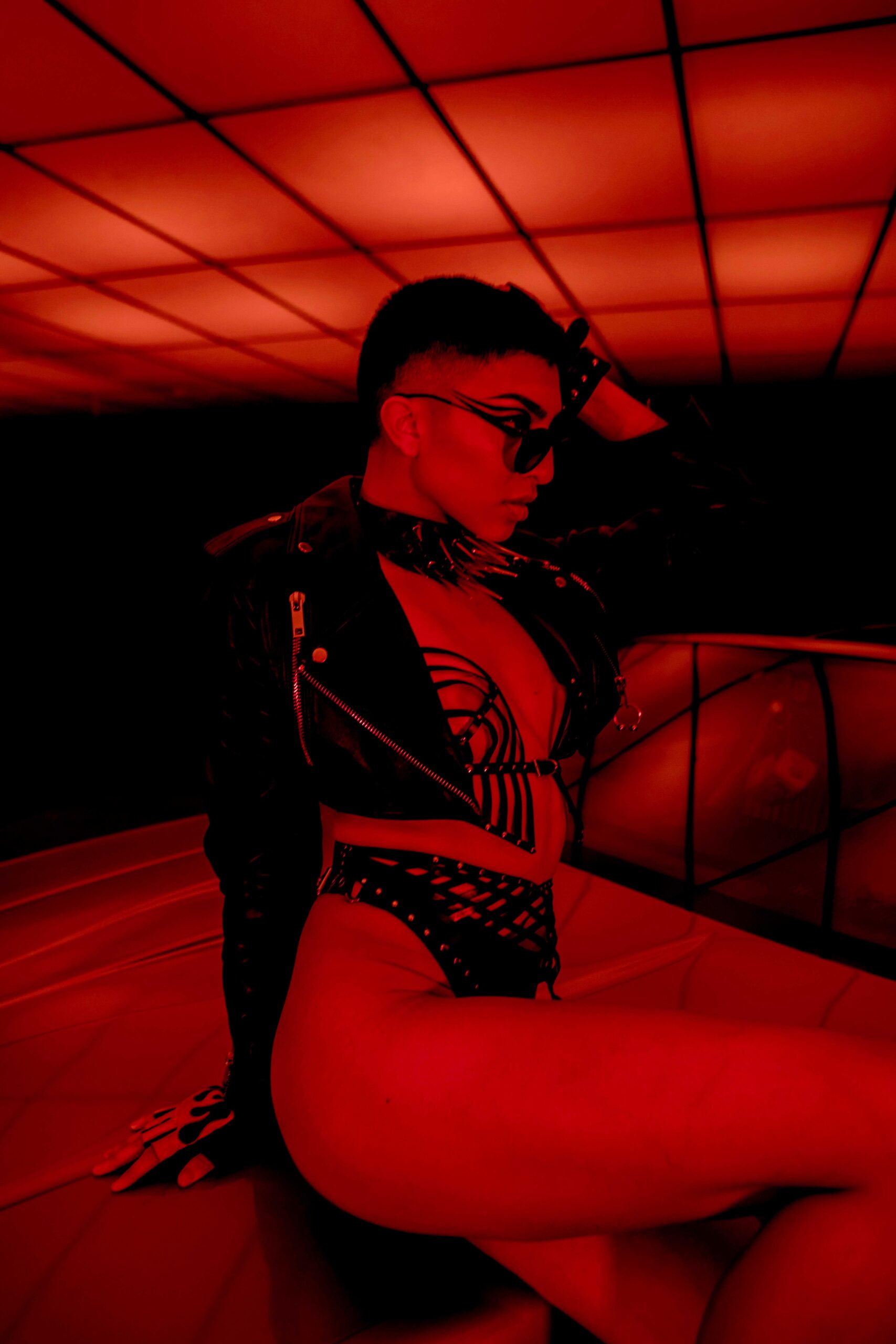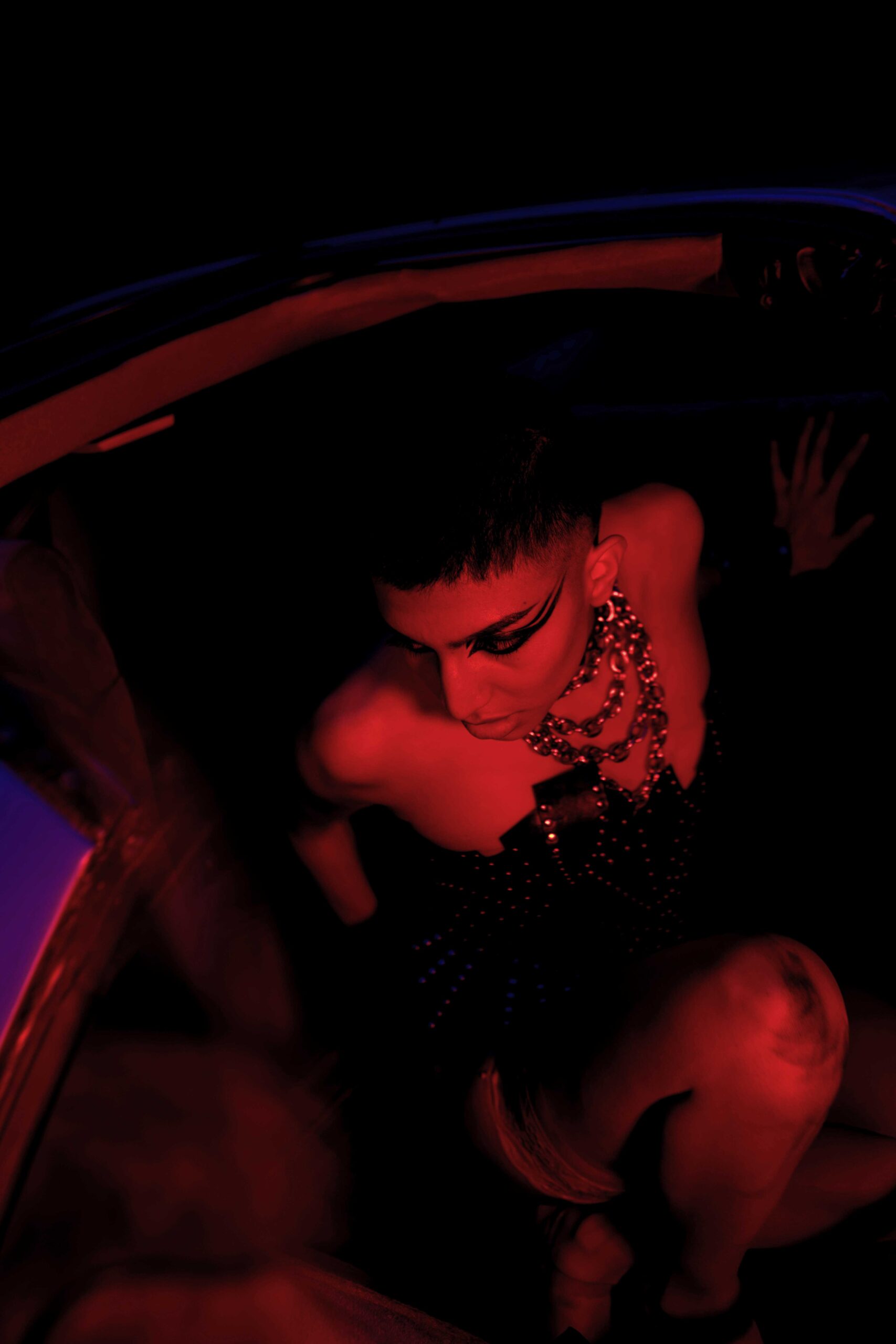 A nostalgic homage to the 1980s, inspired by the iconic heavy metal scene and its rebellious attitude. Leather fashion and empowering armours, strong contrast and extreme saturation, are inspired by the dark ambience of classic horror while simultaneously adding a sensual twist. Model, Alex Beltran, drives the dominating essence of the unapologetic spirit of the 80s straight into the psyche of the viewer. Studded leather and the steel of an ’83 Camaro transports us to the indulgent sensations of that decade.