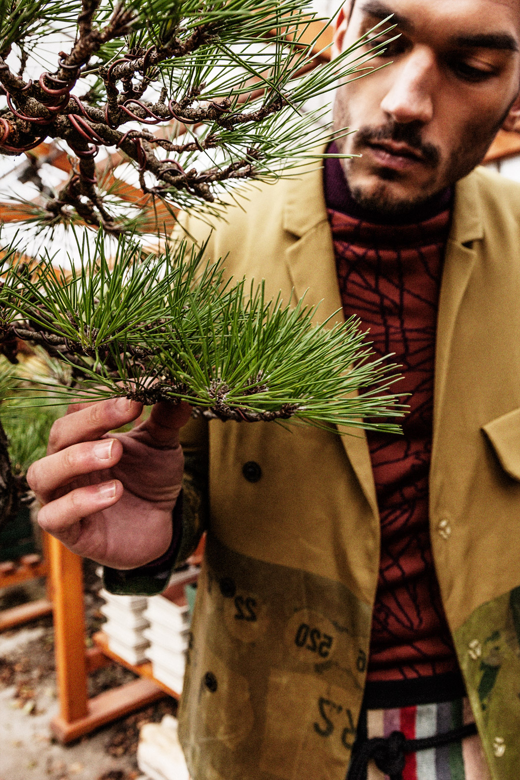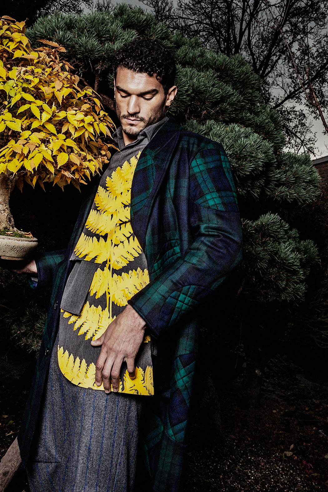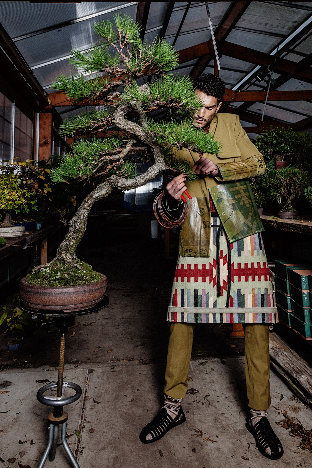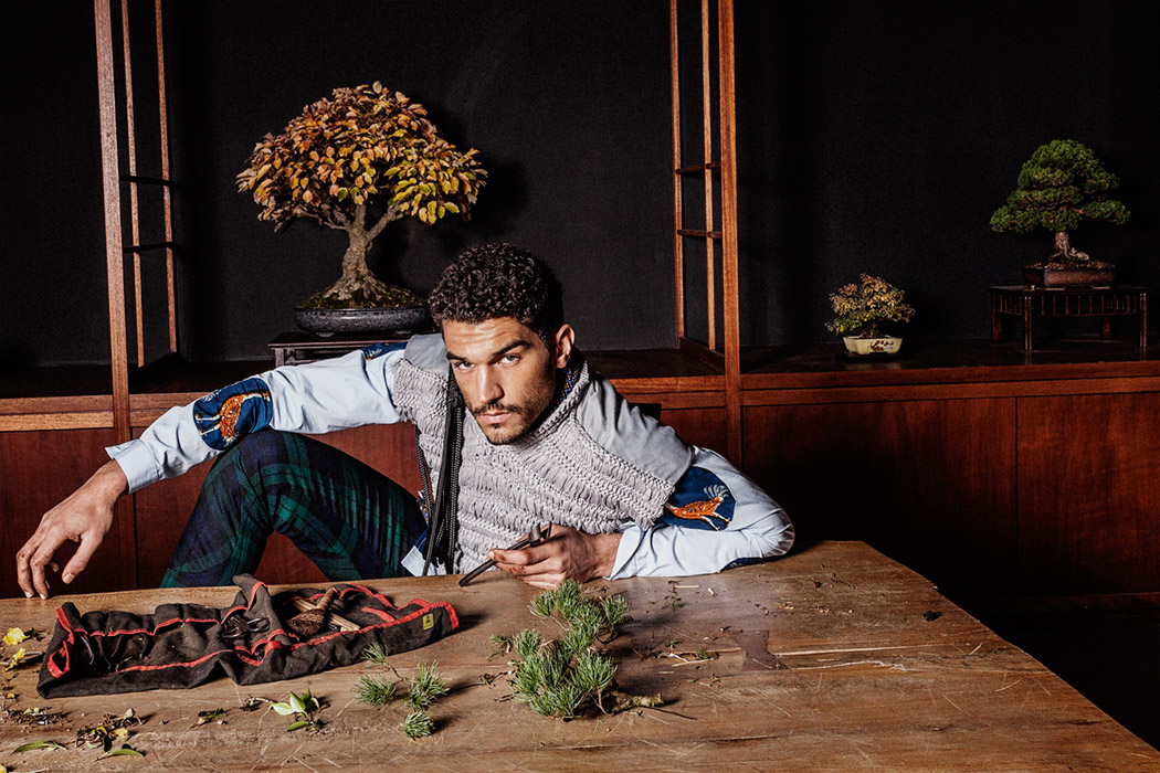 A KALTBLUT exclusive menswear editorial. Photography by Tatchatrin Choeychom. Model is Robin Pijls signed at Republic Men. Styling by Julieta Piacenza Vanderhoeven. Hair and make up by Lily Yeh. Location by Deshima Bonsai Studio. Fashion by Boaz van Doornik, Joosje Were, Gino Anthonisse, Johanna Bas Backer and Weekday.