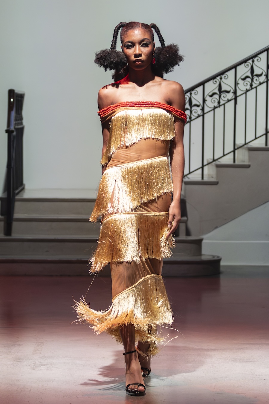 The show’s holy grail? A cascade of golden fringe drapes the body like liquid sunlight, shimmering with every step. The sheer underlayer keeps it modern and sensual, while the bold red beadwork across the shoulders pulls the whole thing back into the realm of ceremony. It’s part disco shimmer, part sacred offering, clothing that doesn’t just dress the body, but animates it.