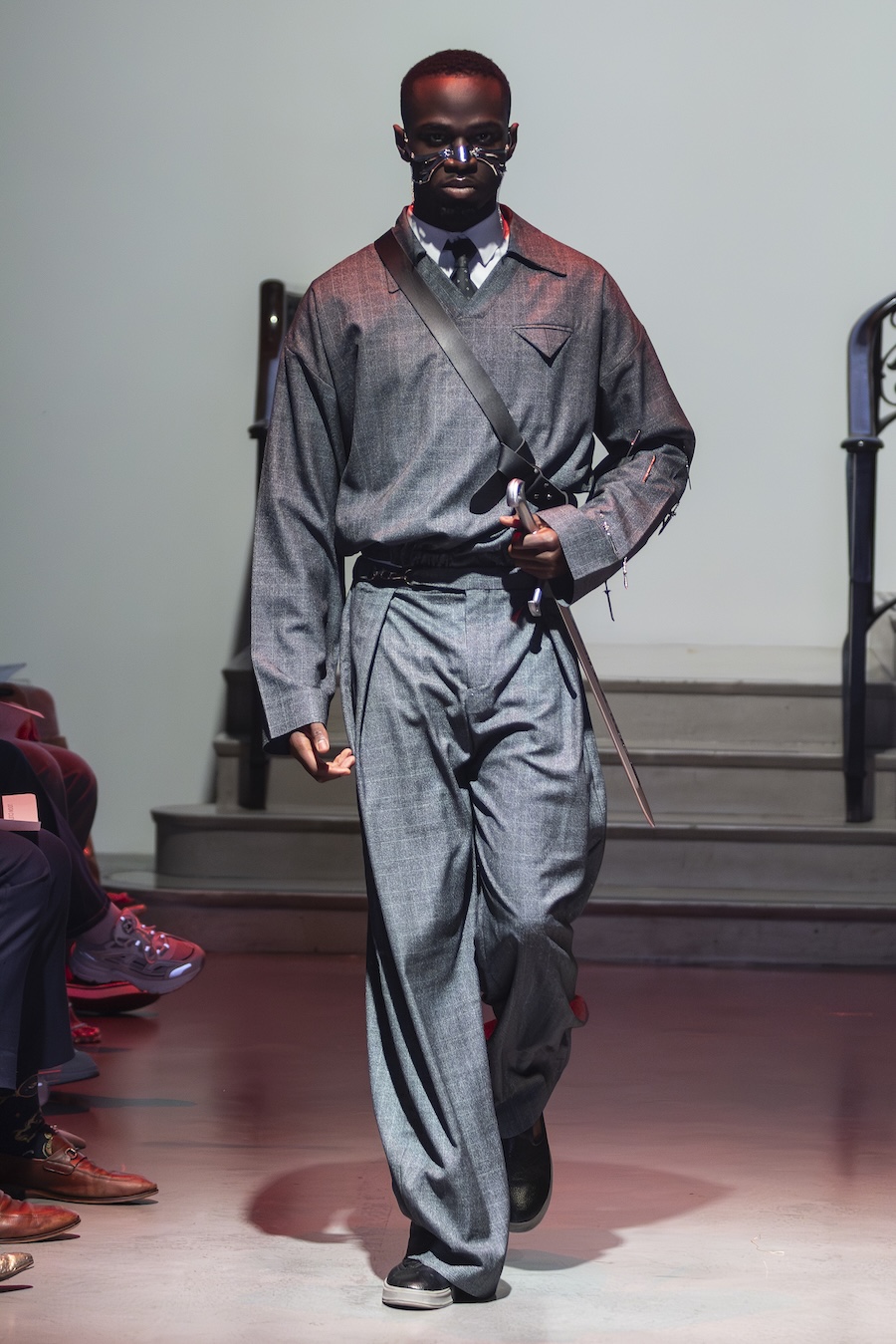 At first glance, the collection was anchored in refined wardrobe staples: jackets, trousers, coats. But Odetomi treated these not as static templates, but as canvases for reinvention. Weighted bell sleeves swung with theatrical gravity, while angular shoulders sharpened the body into something sculptural, almost otherworldly. The standout was a tailored jacket-and-trouser set adorned with a sword and silver facial jewellery, turning the model into a figure suspended between warrior and prophet. It was menswear reframed as mythology.