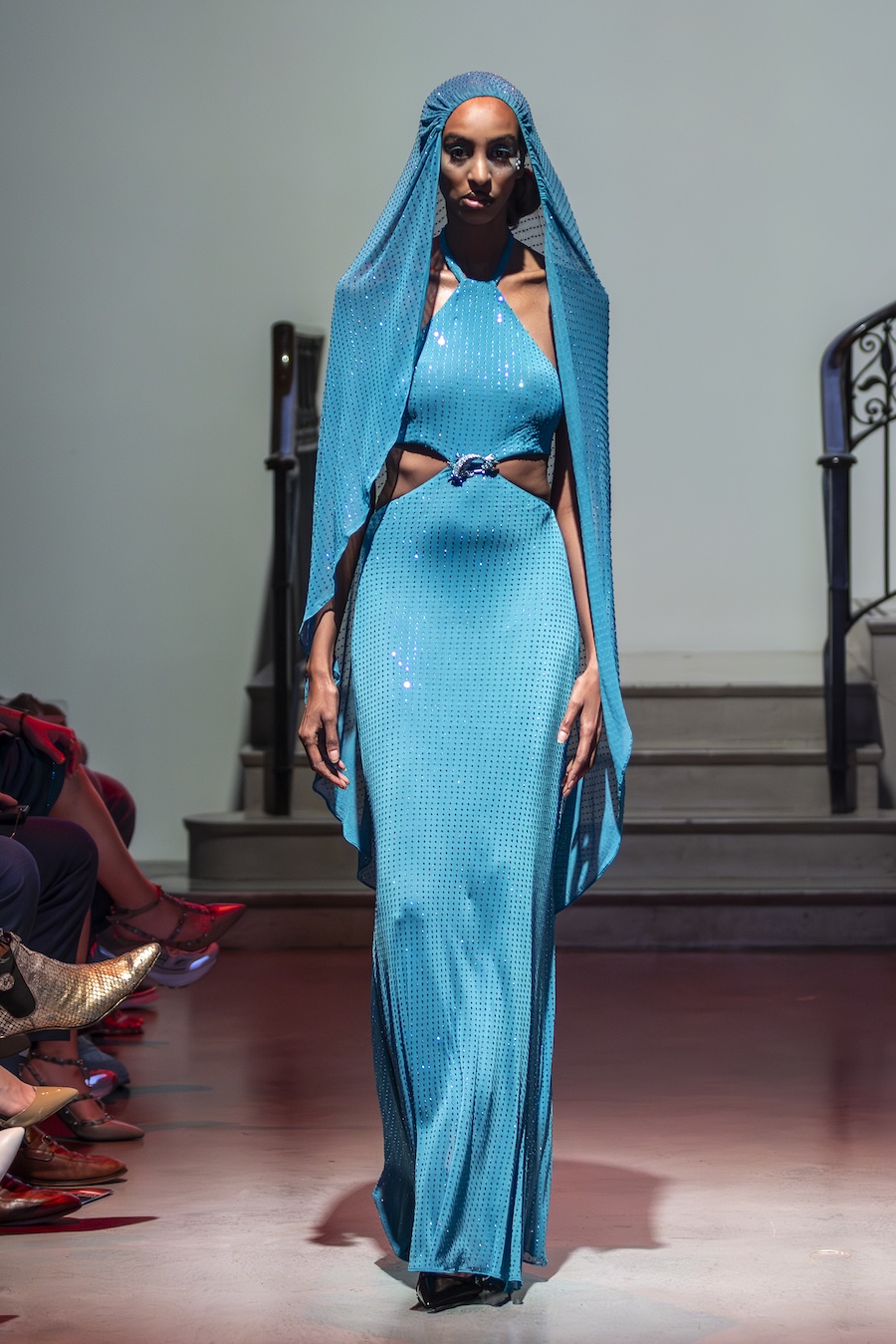 The collection’s palette and textures echoed the shifting moods of a river. A sea-blue gown lined with jewels shimmered as though it had trapped sunlight lapping at the ocean surface. The halter neckline and cut-out waist add a contemporary sharpness, while the knotted detail at the centre recalls the tying of cloth, a gesture both practical and symbolic in many African traditions. The attached hooded drape transforms the silhouette, elongating the figure into something statuesque, almost divine. It frames the model’s face with quiet reverence, evoking priestess, river goddess, or oracle, without ever tipping into costume. The fabric’s soft ripple across the body reinforces the collection’s theme of water as life force and inheritance.