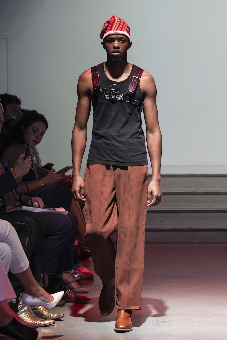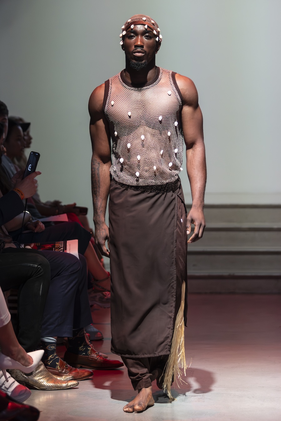 Ebimobowei Daukoru Ayah flips the usual “Mother Nature” script, showing us resilience through a masculine lens. Think wide-legged trousers that move like waves, fishnet overlays that whisper of wounded ecosystems, and cowrie shell details that feel almost priestly. The earthy greens and browns ground the collection in river silt, but the vibe is more myth than mud. It’s equal parts fisherman, eco-warrior, and sea-god runway fantasy. And we are here for it, menswear soaked in serenity is a mood we can fully endorse.