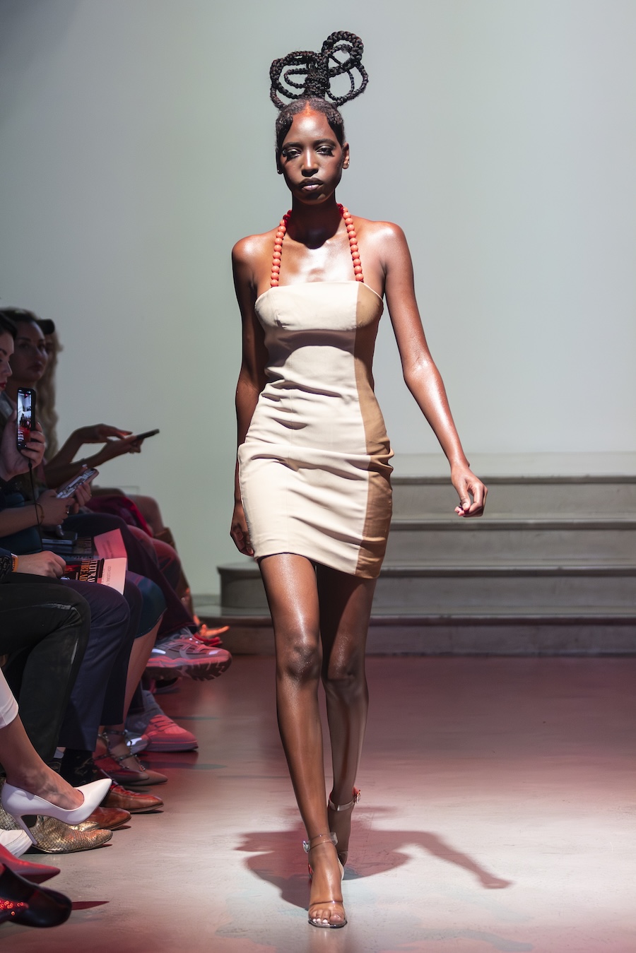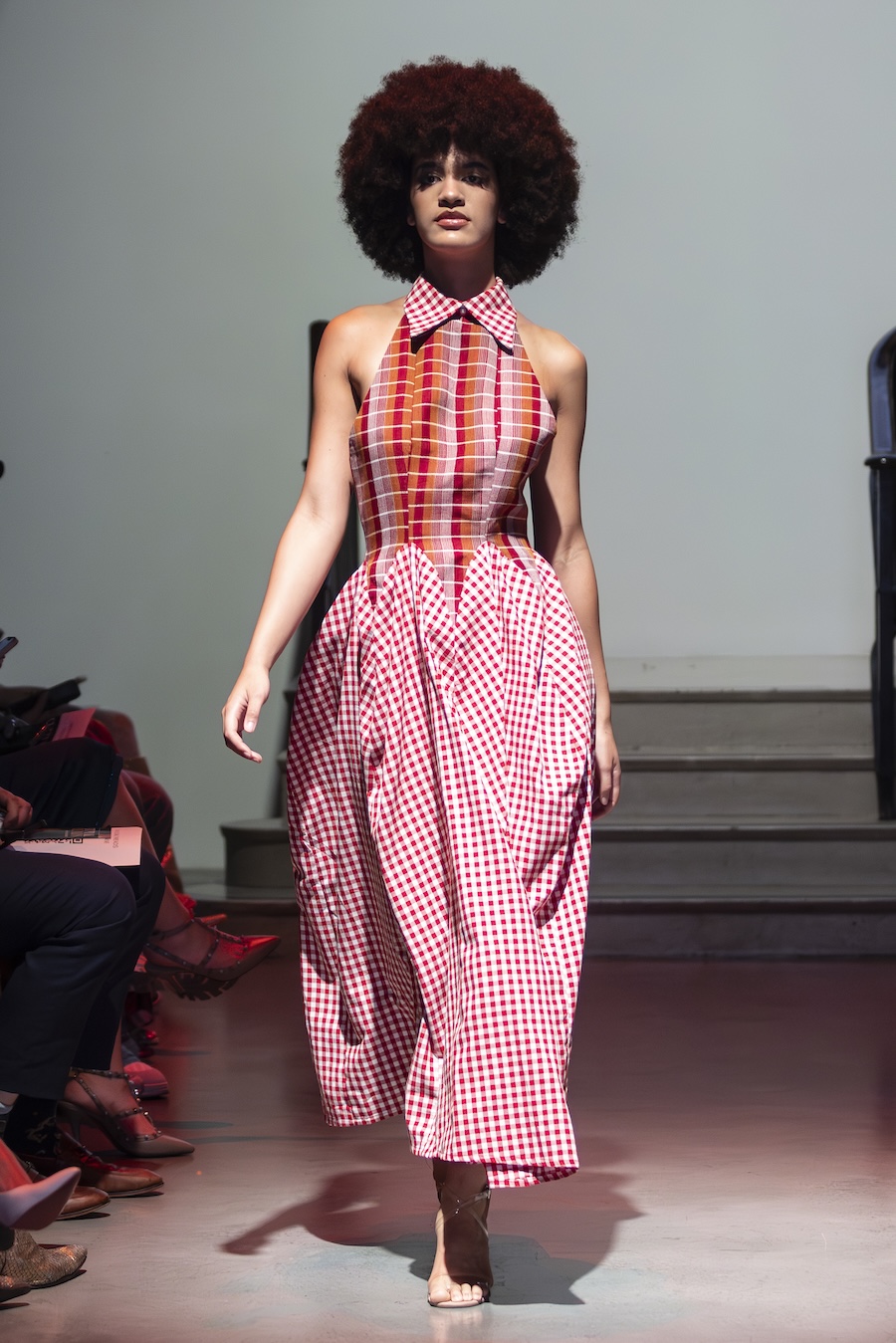 Fringe, cowries, and sculptural silhouettes animated the collection, their movement transforming the models into dancers mid-ceremony. Each step, each turn of the body activated the designs, giving them a kinetic energy that recalled festival grounds more than fashion week. A standout moment came in the form of a halter-neck gingham dress with a dramatically folded skirt. Constructed from mixed gingham panels, blends the vibrancy of Idoma ceremonial dress with a playful modernity. The structured volume shifted with every stride, creating an interplay of tradition and innovation. The open back added a daring sensuality, reframing sacred attire through a contemporary lens without diminishing its power.