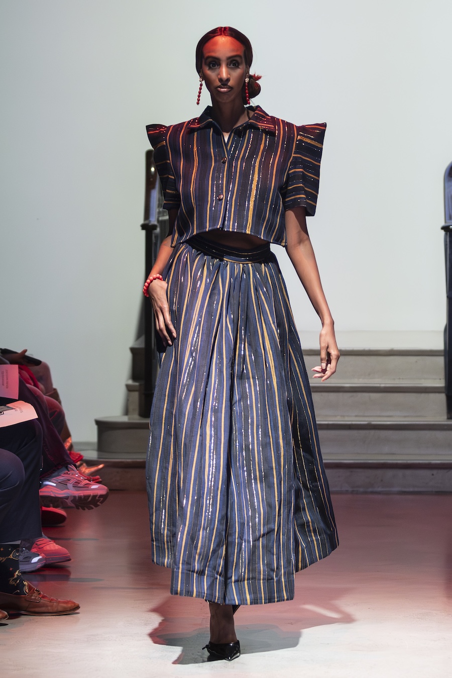 Across the five-look collection, pinstripes emerged as a defining motif. But here they were never corporate, never business-as-usual. Instead, they became royal insignia, bending fluidly to the contours of the body and honouring movement as much as structure. What might otherwise read as a sober textile was reimagined as a marker of dignity and procession.