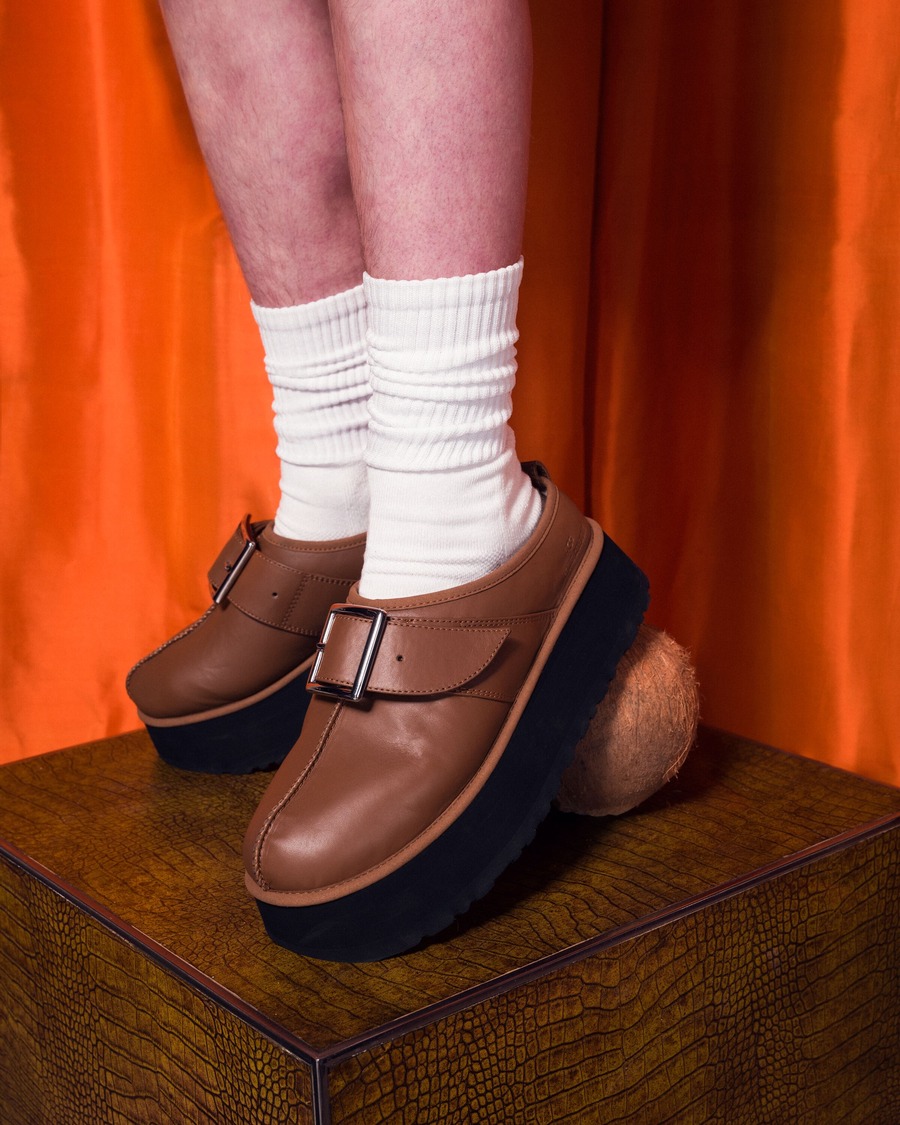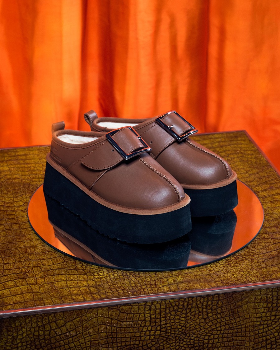 To mark Opening Ceremony’s twenty-year anniversary, the brand collaborated with Southern California-based global lifestyle brand UGG to reimagine the ever-popular Tasman Slipper with an exaggerated buckle, chunky platform, and exposed shearling. Making its original debut during Spring/Summer 2023 New York Fashion Week, the collection is available now on UGG.com