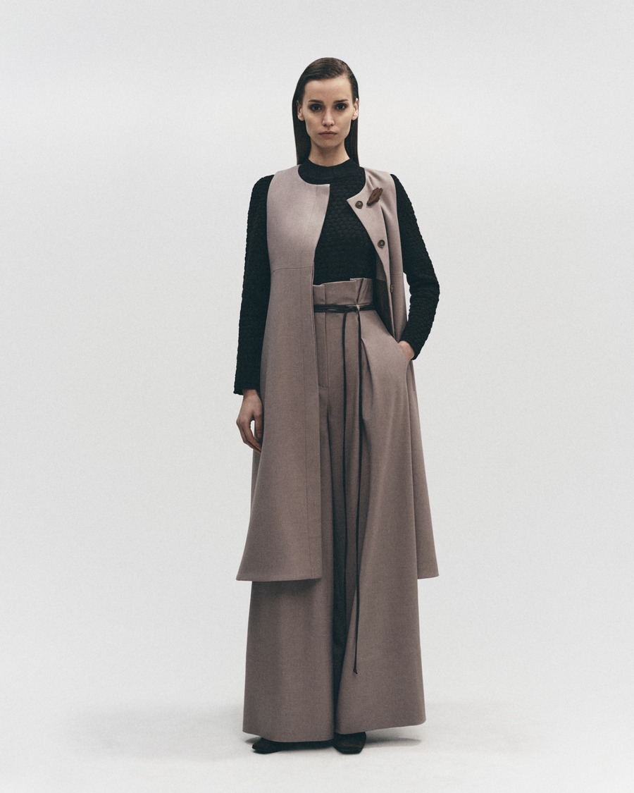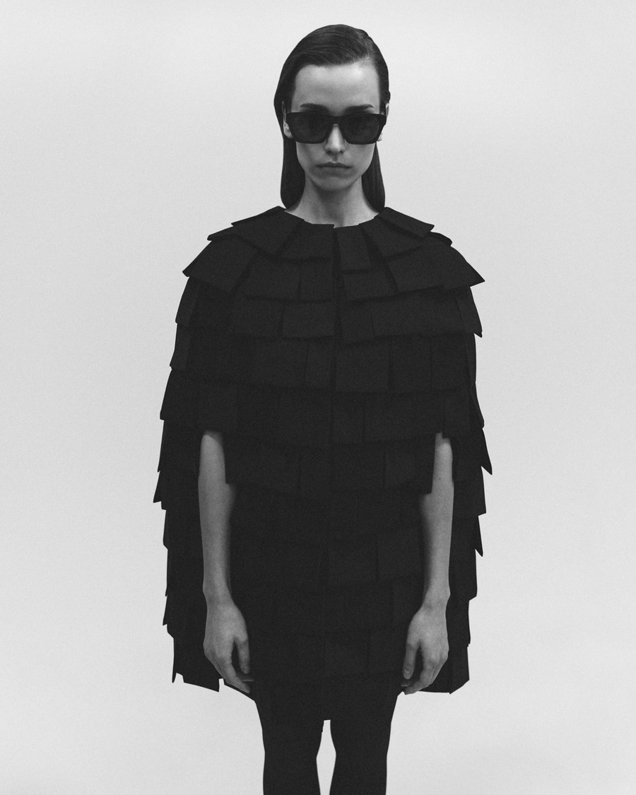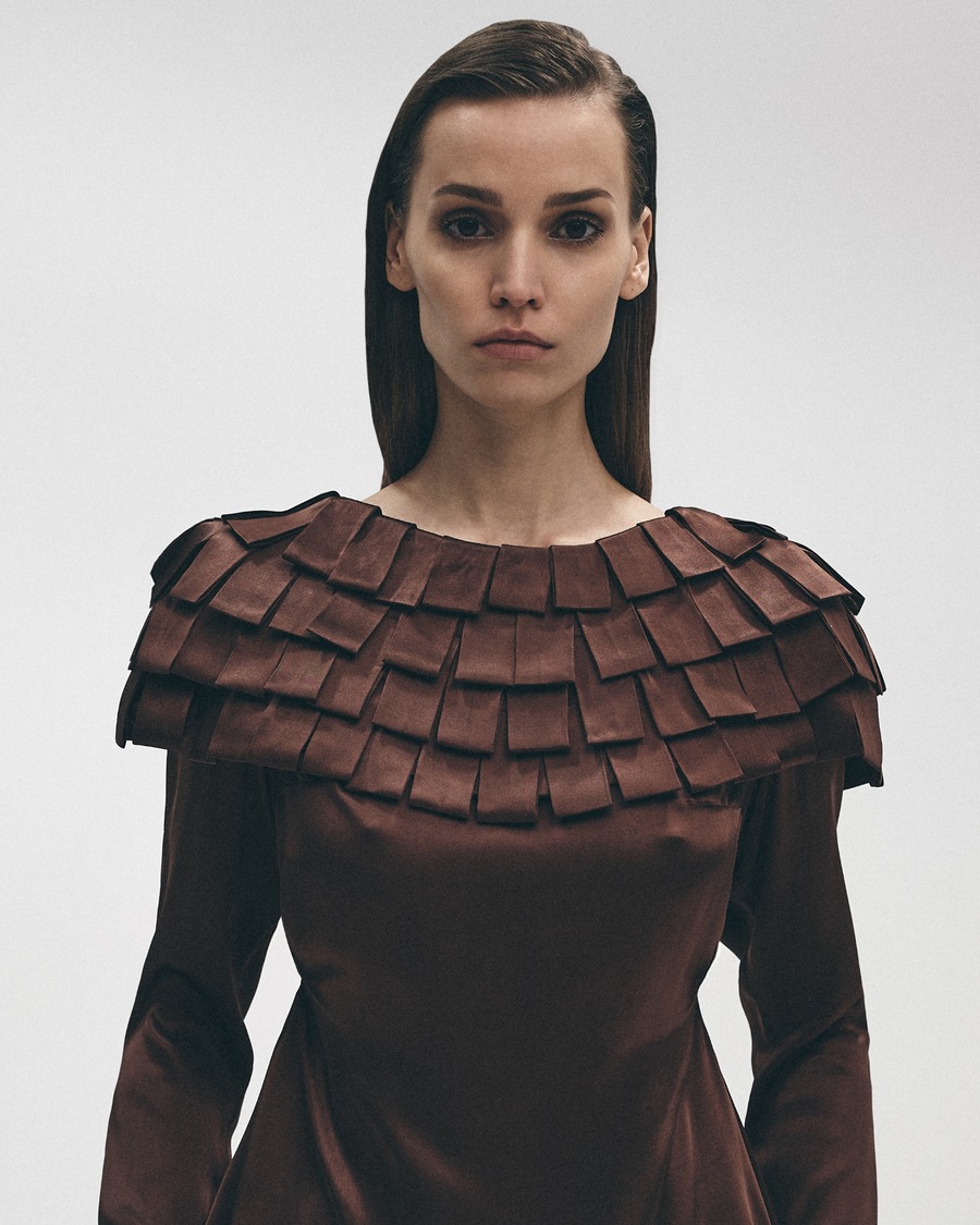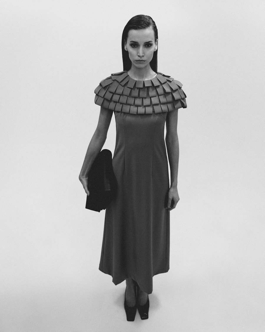 Allusions to defensive constructions occupy a special place in the BRAMA collection: a wooden palisade is recreated in palazzo trousers through vertical pleats; defensive towers-fences are recreated in a dress and top through a massive overhanging collar with imitation of shingles. The Dranka cape is a reinterpretation of a defensive outpost covered with impenetrable scales of wooden planks.