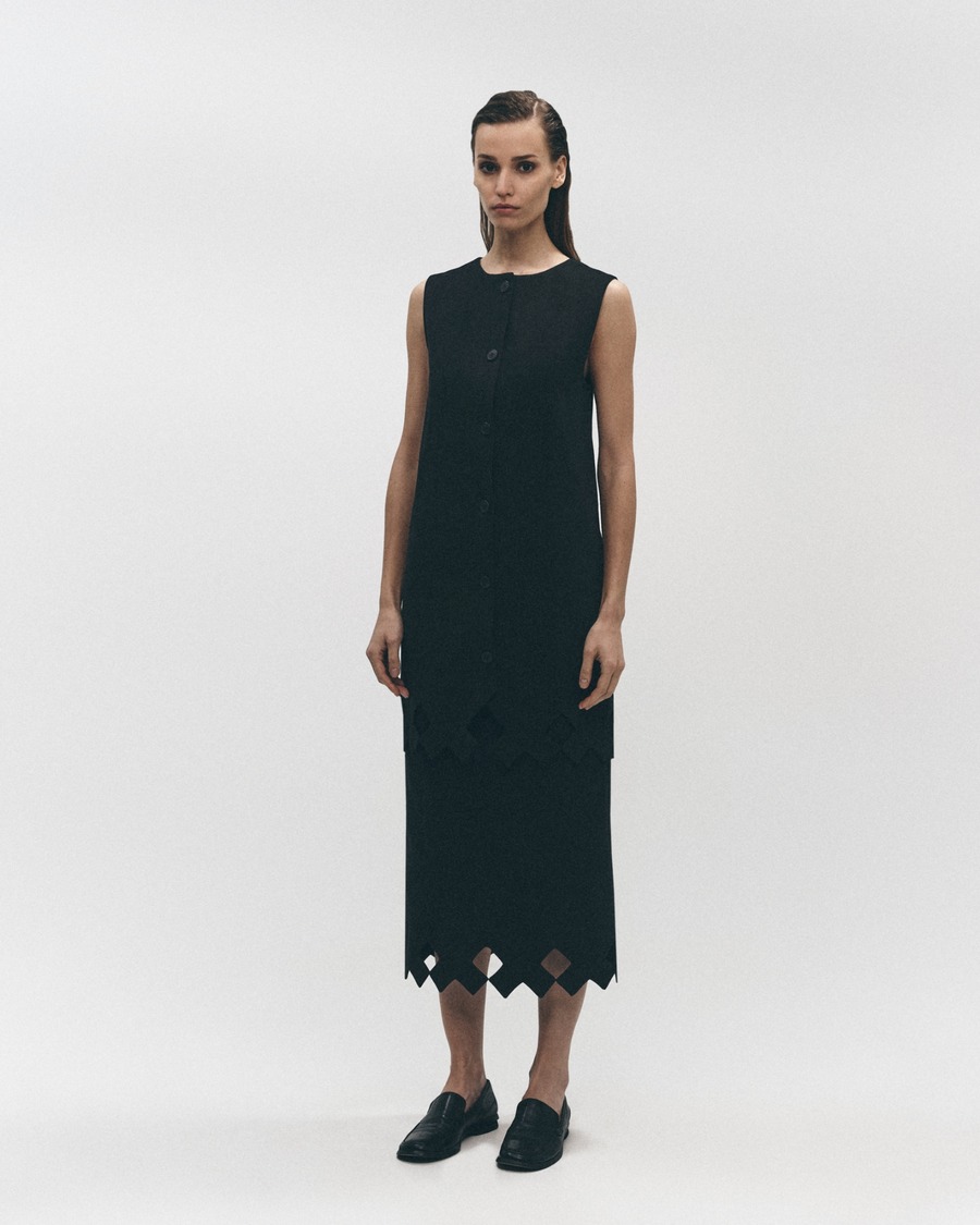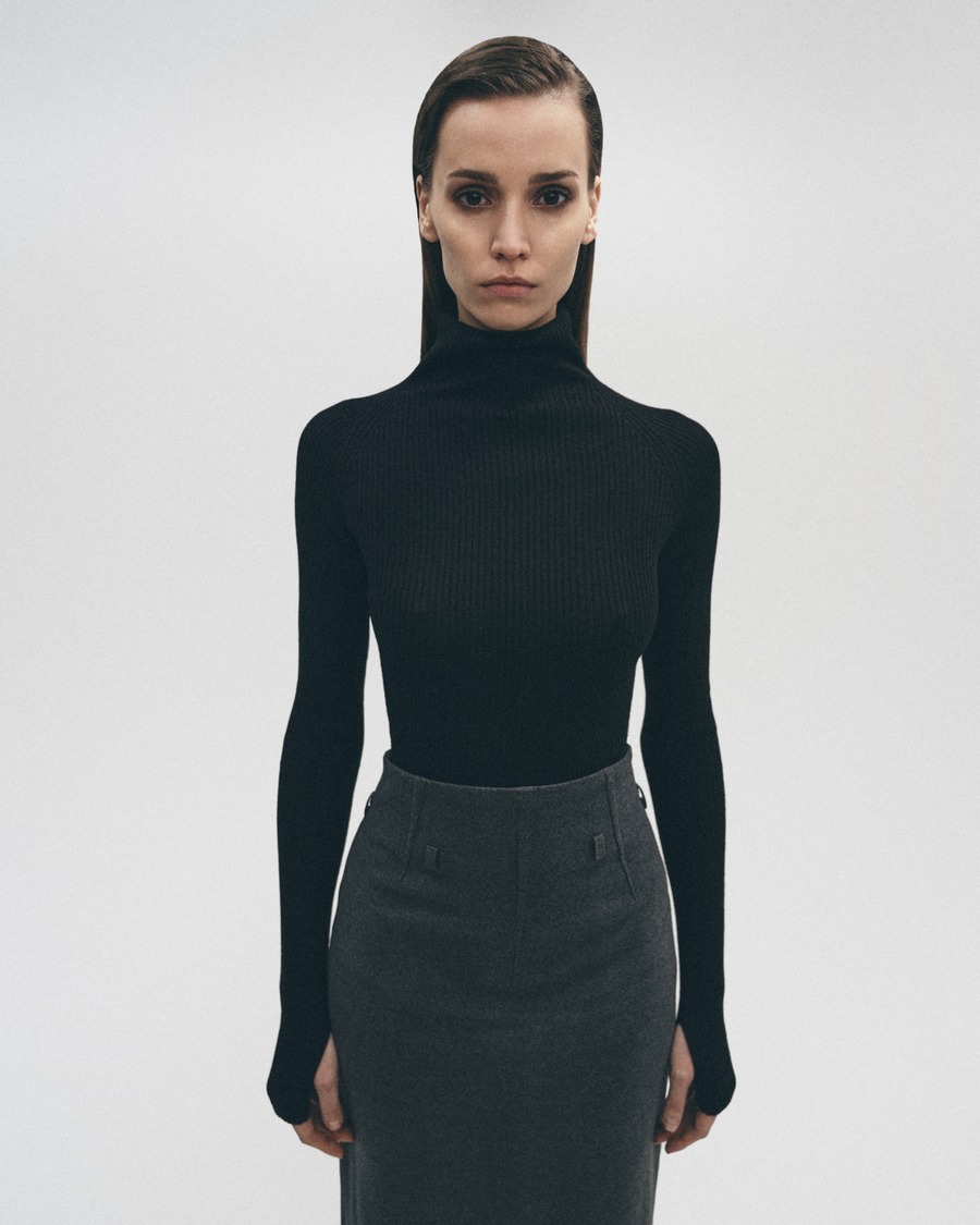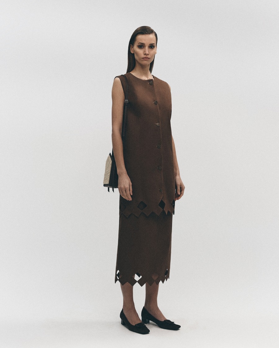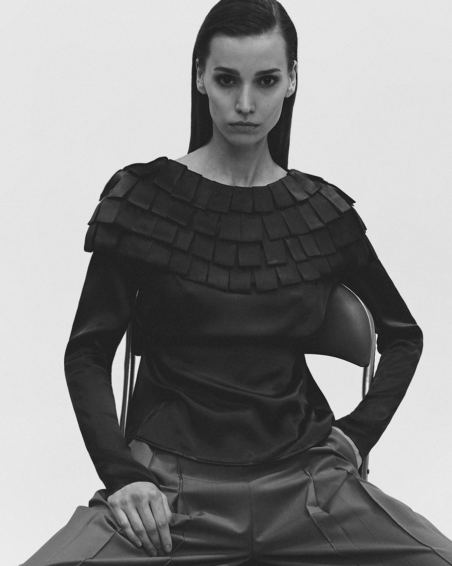 Allusions to defensive constructions occupy a special place in the BRAMA collection: a wooden palisade is recreated in palazzo trousers through vertical pleats; defensive towers-fences are recreated in a dress and top through a massive overhanging collar with imitation of shingles. The Dranka cape is a reinterpretation of a defensive outpost covered with impenetrable scales of wooden planks.