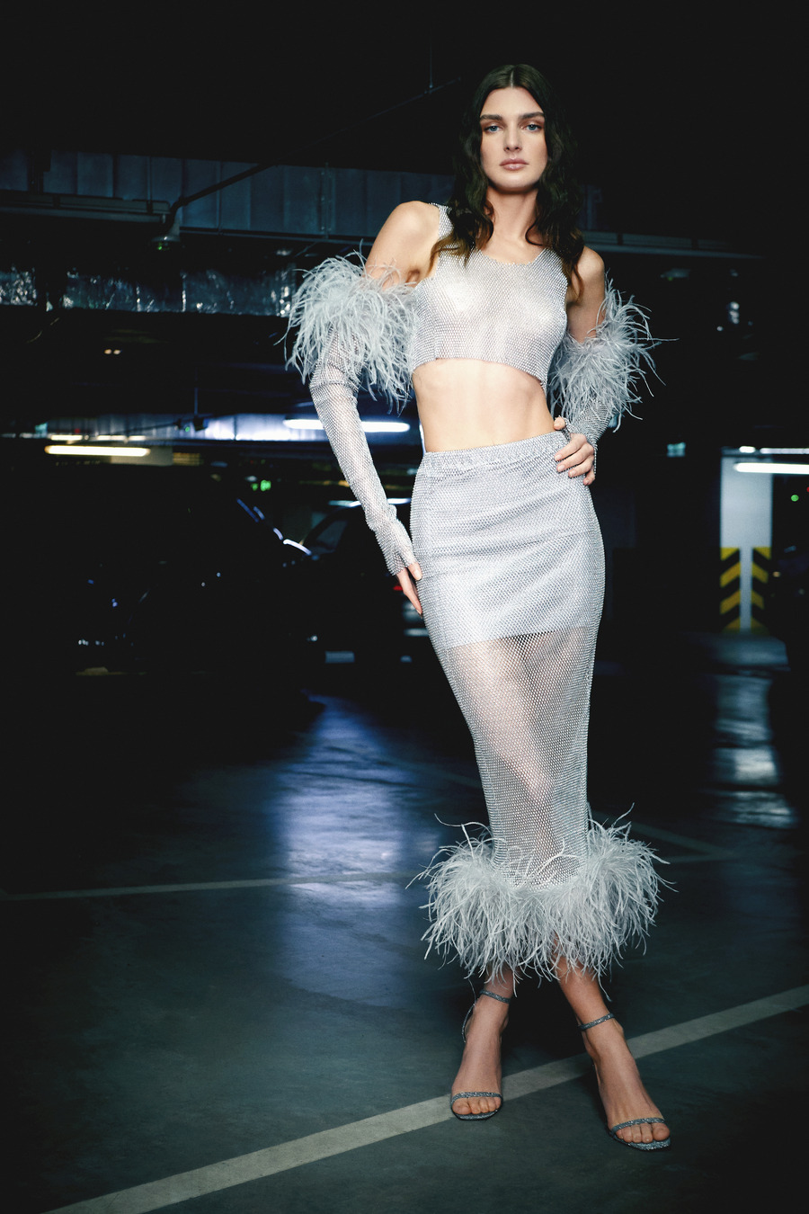 Feathers, rhinestones, sexy silhouettes and transparent fabrics – the SS’23 pieces have all the signature SANTA BRANDS features and a bit more. The brand also presents accessories for the first time: feather-trimmed gloves and Panama hats covered with rhinestones could be a daring addition to any look.