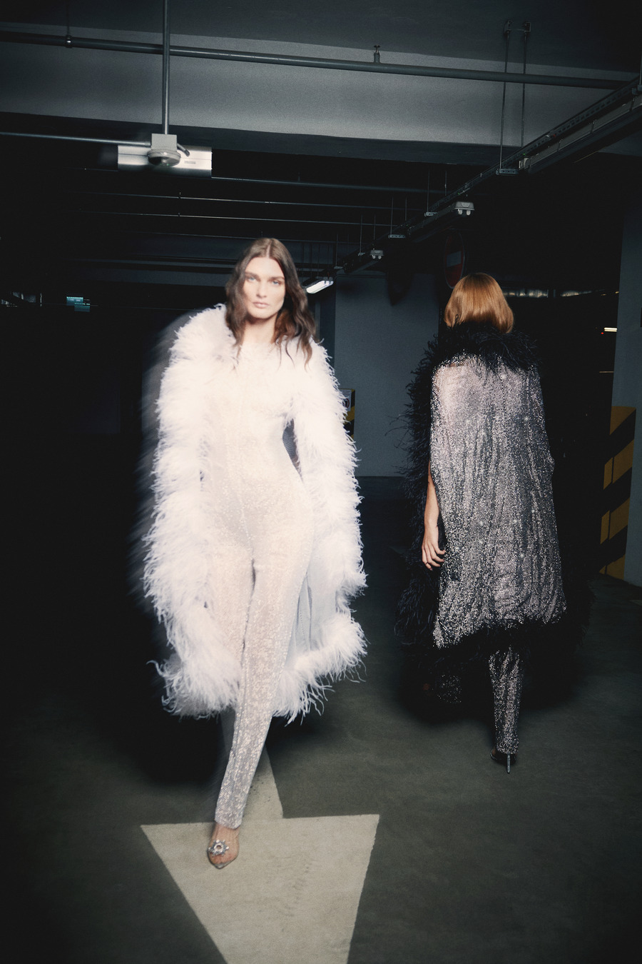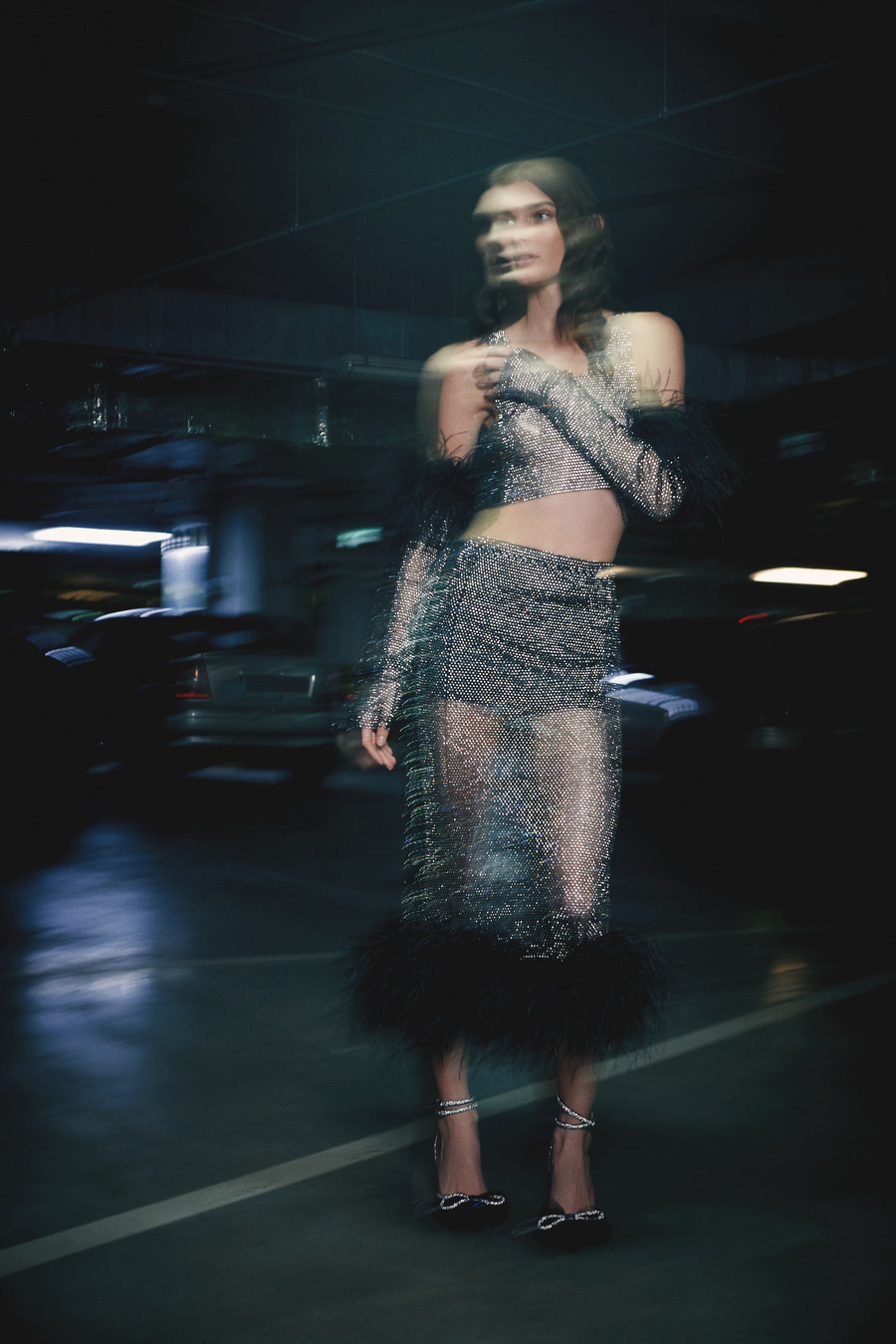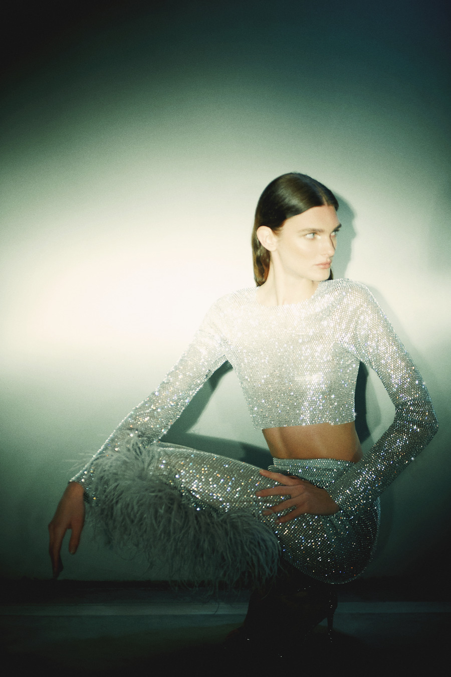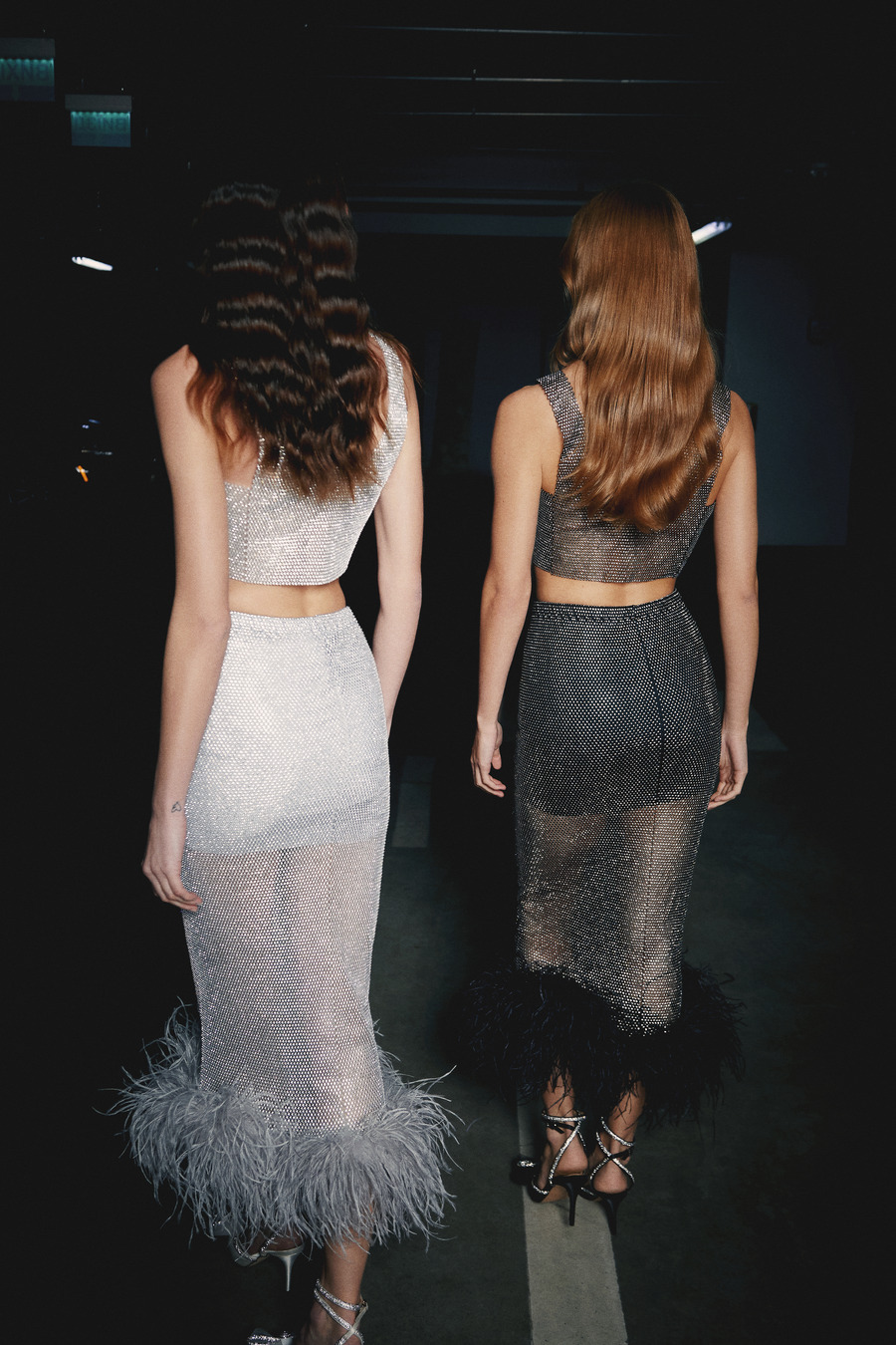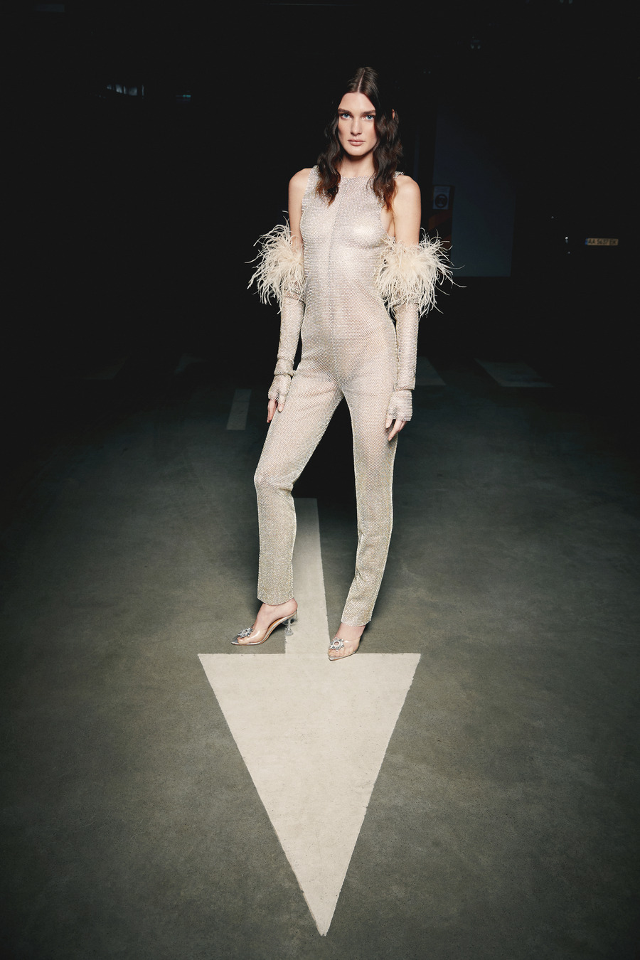 Feathers, rhinestones, sexy silhouettes and transparent fabrics – the SS’23 pieces have all the signature SANTA BRANDS features and a bit more. The brand also presents accessories for the first time: feather-trimmed gloves and Panama hats covered with rhinestones could be a daring addition to any look.